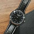 Ремешок выполнен из натуральной кожи чёрного цвета, обеспечивая комфорт при носке. Толщина корпуса составляет 12 мм, что придаёт часам солидный вид.