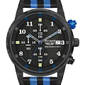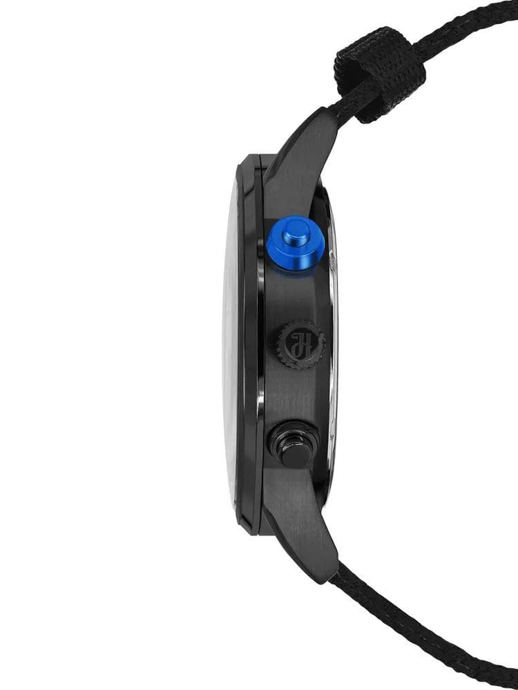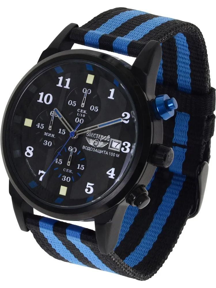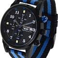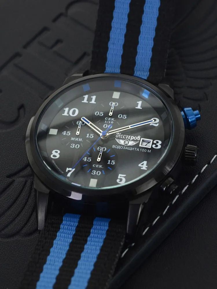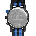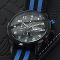 Ремешок выполнен из прочного нейлона в чёрно-синей цветовой гамме, обеспечивая комфорт при носке и добавляя модели спортивный характер. Толщина корпуса составляет 10 мм, что придаёт часам солидный вид.