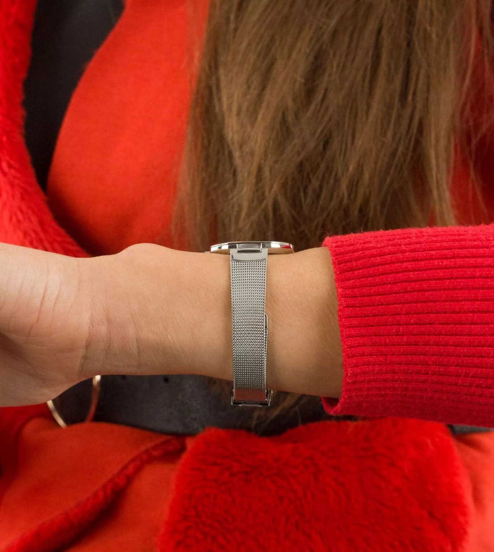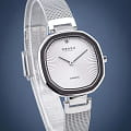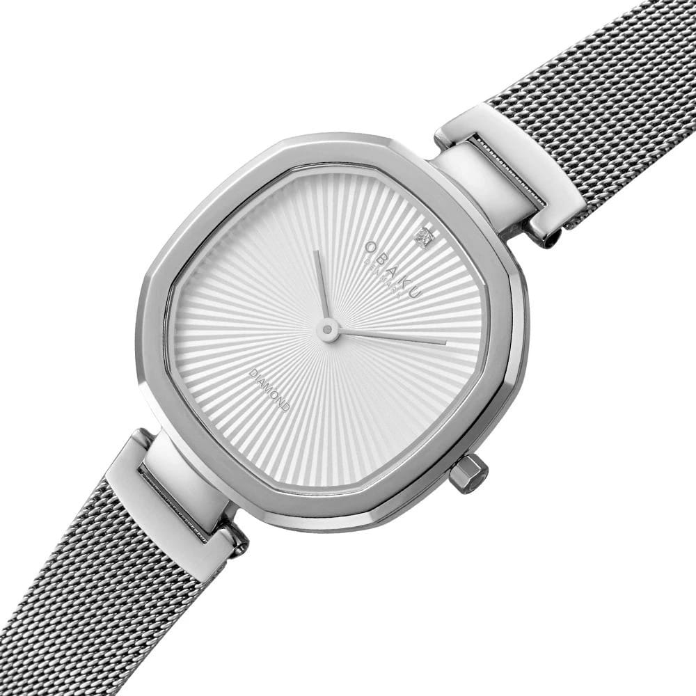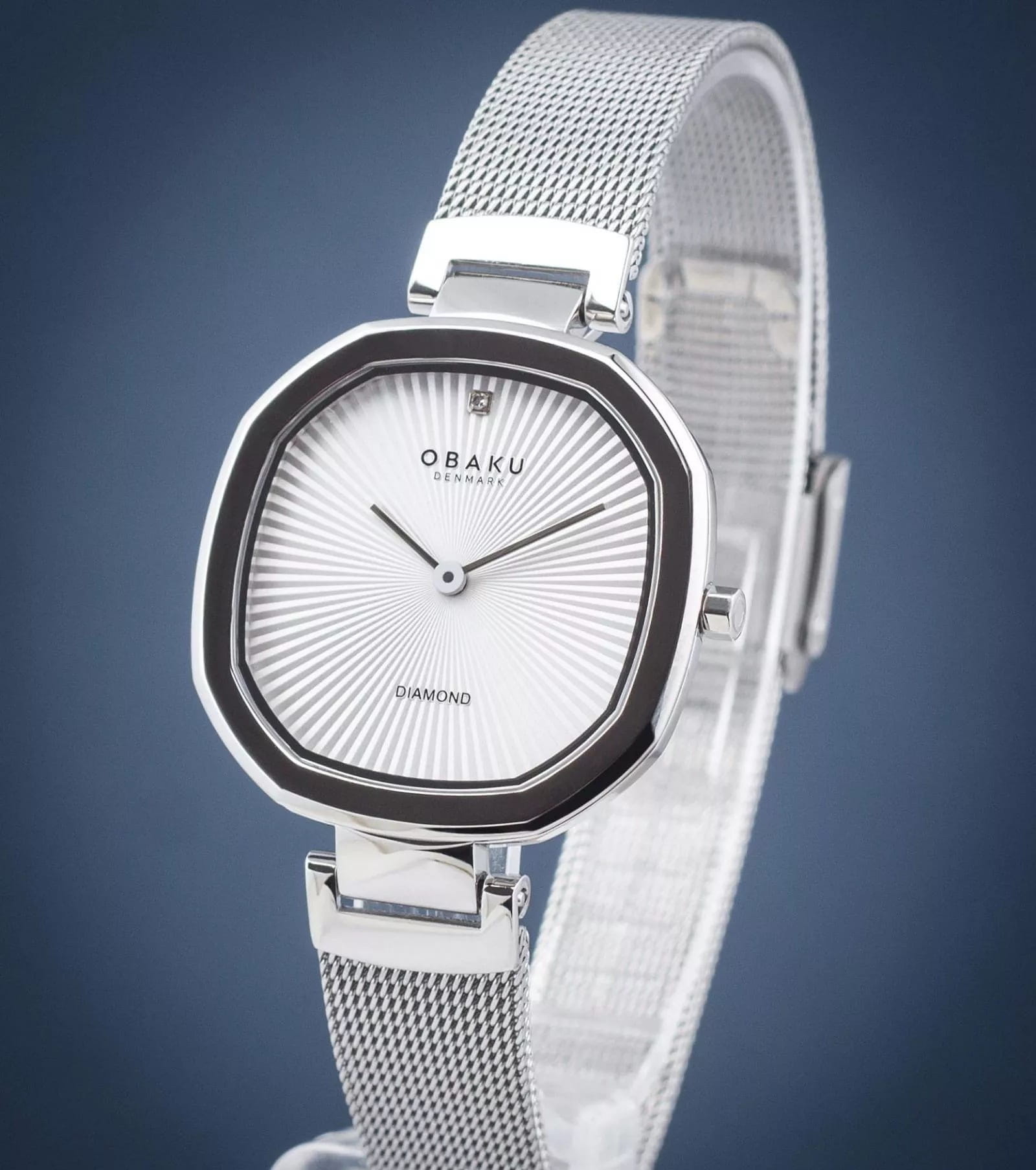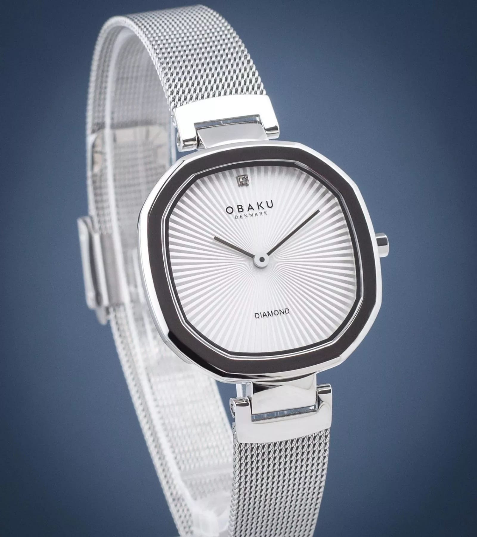 Женские наручные кварцевые часы с минеральным стекломМинеральное стеклоМинеральное стекло представляет собой искусственно выращенный минерал кварца. Такое стекло отличается особой устойчивостью к повреждениям и царапинам. Уступает по некоторым качествам сапфировому стеклу. Obaku Diamond V277LXCIMC, кварцевый механизм с высокой точностью. Класс водозащиты: 30 метров, позволит защитить корпус от случайных брызг или капель дождя. Корпус часов изготовлен из стали. Стальной браслет выполнен в технике миланского плетения на раскладной застёжкеРаскладная застёжкаТакой тип застёжки используется только на браслетах из металла. Она никогда не раскрывается полностью, происходит разделение на 2 и более частей. Раскладывающая застёжка снизит вероятность потери часов к минимуму.. Серебристый циферблат декорирован бриллиантом.