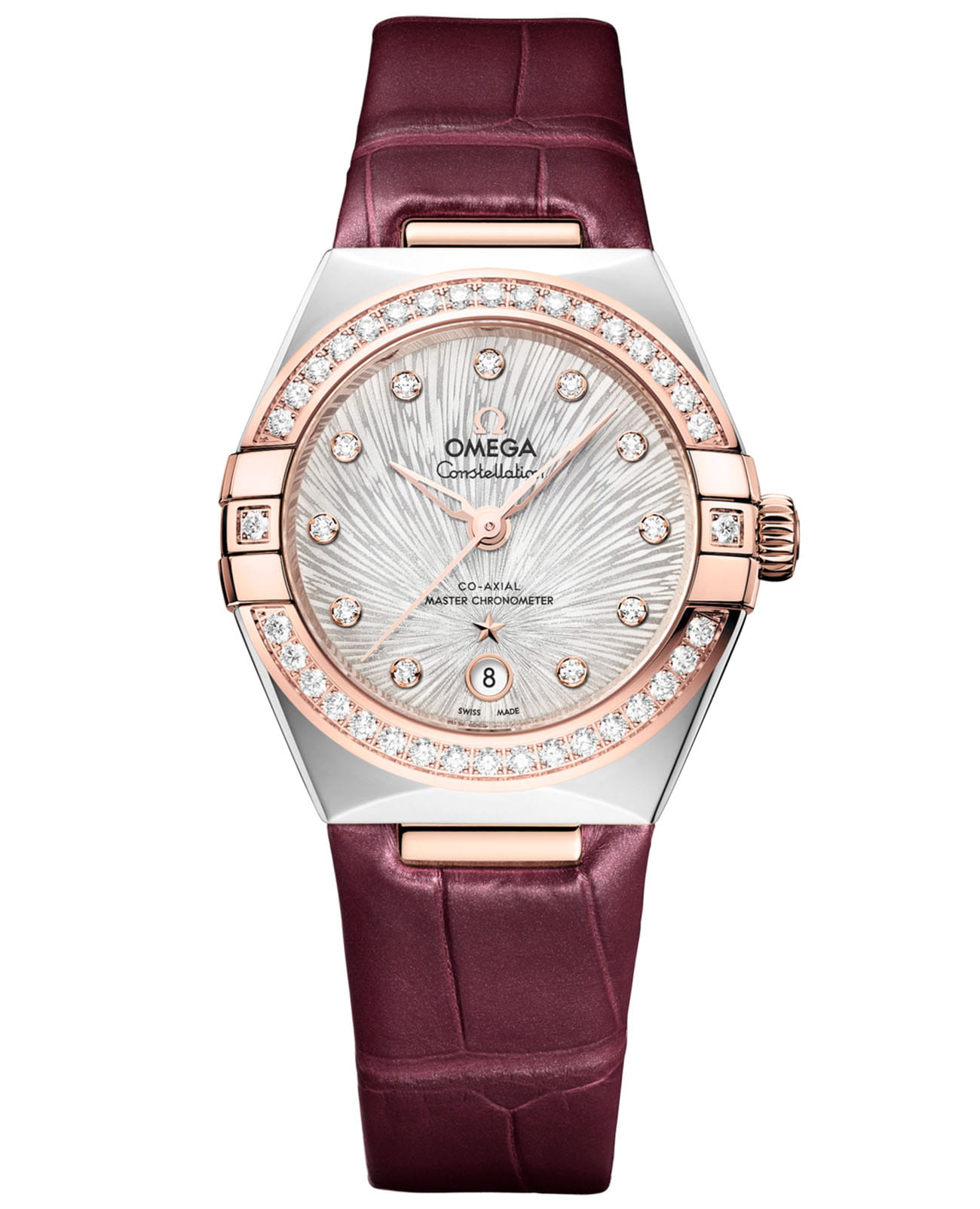 Sedna™, а также бриллиантовые метки в золотых оправах, сверкающие как далекие галактики. Часы облачены в роскошный бордовый кожаный ремешок, переливающийся подобно ночному небу, а их пульсом служит коаксиальный хронометр OMEGA Master Chronometer 8700, чье совершенство раскрывается через кристально чистое сапфировое стеклоСапфировое стеклоПрочный и надёжный материал из кристалла сапфира синтетического происхождения, характеризующийся особой твёрдостью и устойчивостью к царапинам и повреждениям. задней крышки.