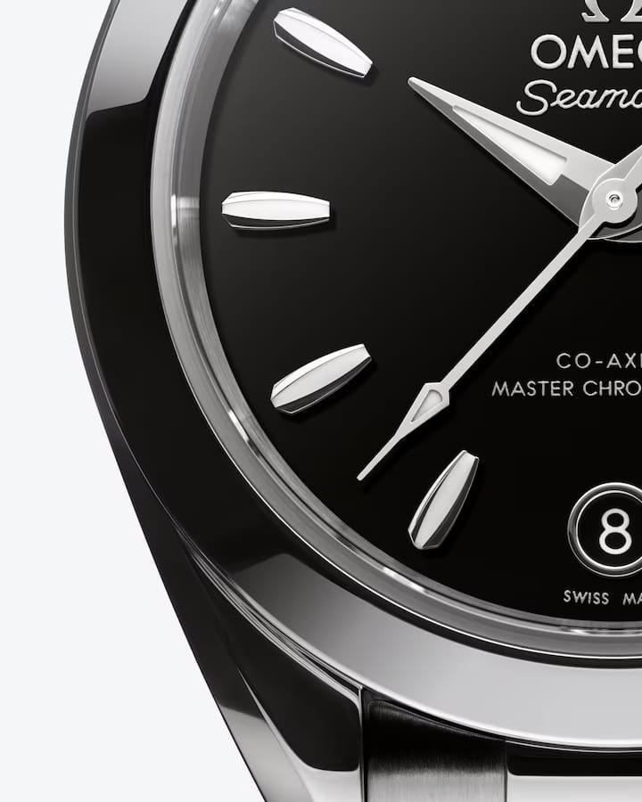 Часы Omega Seamaster Aqua Terra выполнены в симметричном корпусе из нержавеющей стали с завинчивающейся задней крышкой, украшенной волновым узором. Циферблат чёрного цвета дополнен окошком даты на 6 часах и 11 индексами в форме корпусов парусников. Стрелки переработанной формы выполнены из 18K белого золота и оснащены люминесцентным покрытиемЛюминесцентное покрытиеПозволяет считывать показания времени в темноте. Производители наносят на стрелки, часовые индексы, безель или поверхность циферблата светонакопительный состав, дающий холодное свечение. Super-LumiNova для лучшей читаемости в темноте. Калибр Omega 8750 сертифицирован как Master Chronometer — гарантия высочайшей точности и устойчивости к магнитным полям. Запас хода составляет 48 часов. Защиту циферблата обеспечивает сапфировое стеклоСапфировое стеклоПрочный и надёжный материал из кристалла сапфира синтетического происхождения, характеризующийся особой твёрдостью и устойчивостью к царапинам и повреждениям. с антибликовым покрытиемАнтибликовое покрытиеСлой оксида металла в 0,13-0,3 микрон, благодаря которому стекло часов не бликует и не отражает свет. Антибликовое покрытие уменьшает отражение света в 10 раз, обеспечивая отличную читаемость показателей циферблата. с обеих сторон. Водозащита позволяет использовать часы в воде без риска повреждения. Диаметр корпуса — 30 мм, между "ушками" — 14 мм, толщина — 10.6 мм, общая длина между "ушками" — 36.5 мм. Часы установлены на интегрированный стальной браслет с закруглёнными звеньями и застёжкой-бабочкой с кнопкамиЗастёжка "бабочка"Такой вид застёжки дополняется предохранителями, помогающими избежать случайного раскрытия браслета. Обладают изящным исполнением. , обеспечивающим комфорт при ношении. Вес модели — около 81 грамма. Это сочетание премиального качества, технологичности и классического дизайна.