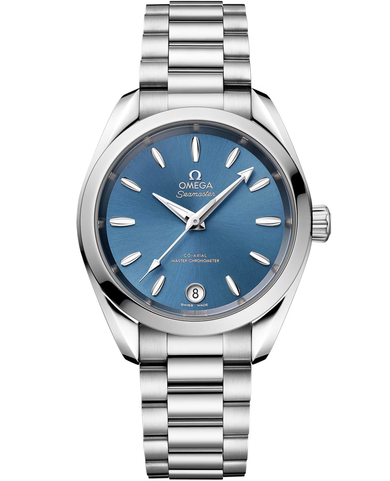 Omega Seamaster Aqua Terra выполнены в симметричном корпусе из полированной нержавеющей стали с завинчивающейся задней крышкой, украшенной волновым узором. Циферблат морского оттенка изготовлен из латуни и обработан методом солнечной шлифовки от центра к краям. Циферблат дополнен окошком даты на 6 часах, стрелками и метками из 18K белого золота с алмазной полировкой для высокой контрастности и читаемости. Логотип OMEGA также выполнен из белого золота. Калибр Omega 8800 сертифицирован как Master Chronometer — гарантия высочайшей точности и устойчивости к магнитным полям. Запас хода составляет 55 часов. Защиту циферблата обеспечивает сапфировое стеклоСапфировое стеклоПрочный и надёжный материал из кристалла сапфира синтетического происхождения, характеризующийся особой твёрдостью и устойчивостью к царапинам и повреждениям. с антибликовым покрытиемАнтибликовое покрытиеСлой оксида металла в 0,13-0,3 микрон, благодаря которому стекло часов не бликует и не отражает свет. Антибликовое покрытие уменьшает отражение света в 10 раз, обеспечивая отличную читаемость показателей циферблата. с обеих сторон. Водозащита позволяет использовать часы в воде без риска повреждения. Часы установлены на браслет со скруглёнными звеньями и раскладной застёжкойРаскладная застёжкаТакой тип застёжки используется только на браслетах из металла. Она никогда не раскрывается полностью, происходит разделение на 2 и более частей. Раскладывающая застёжка снизит вероятность потери часов к минимуму.. Это сочетание премиального качества, технологичности и классического дизайна.