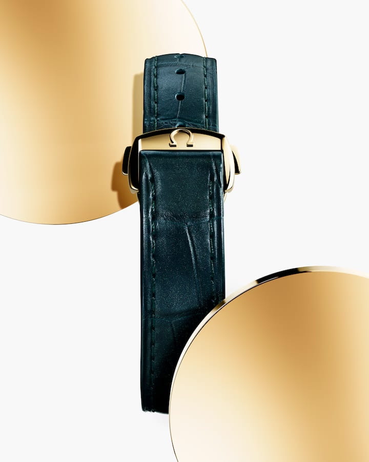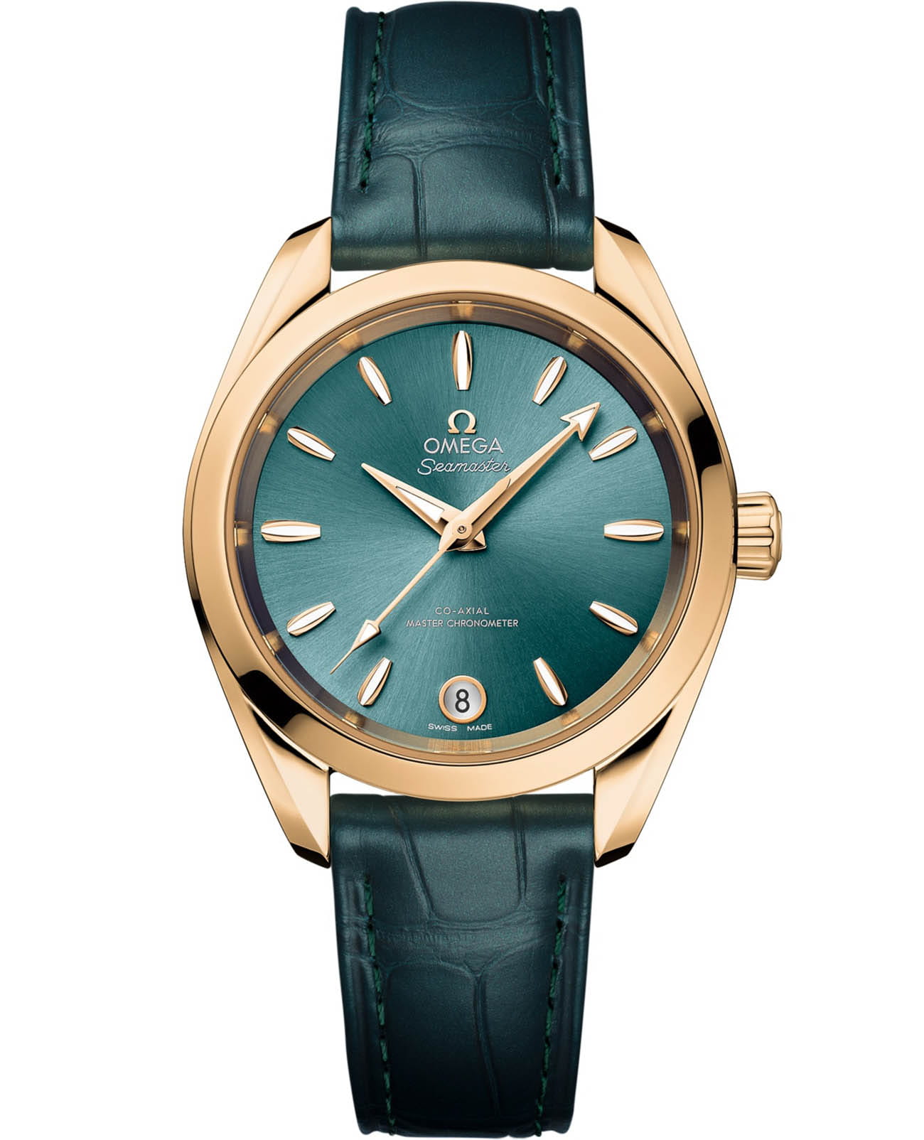 Часы Omega Seamaster Aqua Terra выполнены в симметричном корпусе из полированного 18K Moonshine™ золота с завинчивающейся задней крышкой, украшенной волновым узором. Модель дополнена конической заводной головкой и окошком даты на 6 часах, оформленным кольцом из 18K Moonshine™ золота. Циферблат лагунного оттенка обработан методом CVD и дополнен серебристыми вставками. Стрелки и метки выполнены из 18K Moonshine™ золота и оснащены люминесцентным покрытиемЛюминесцентное покрытиеПозволяет считывать показания времени в темноте. Производители наносят на стрелки, часовые индексы, безель или поверхность циферблата светонакопительный состав, дающий холодное свечение. Super-LumiNova для лучшей читаемости в темноте. Индексы в форме корпусов парусников подчёркивают морское наследие коллекции. Калибр Omega 8801 сертифицирован как Master Chronometer — гарантия высочайшей точности и устойчивости к магнитным полям. Запас хода составляет 55 часов. Защиту циферблата обеспечивает сапфировое стеклоСапфировое стеклоПрочный и надёжный материал из кристалла сапфира синтетического происхождения, характеризующийся особой твёрдостью и устойчивостью к царапинам и повреждениям. с антибликовым покрытиемАнтибликовое покрытиеСлой оксида металла в 0,13-0,3 микрон, благодаря которому стекло часов не бликует и не отражает свет. Антибликовое покрытие уменьшает отражение света в 10 раз, обеспечивая отличную читаемость показателей циферблата. с обеих сторон. Водозащита позволяет использовать часы в воде без риска повреждения. Часы установлены на кожаный ремешок изумрудного цвета. Вес модели — около 86 грамм. Это сочетание премиального качества, технологичности и классического дизайна.