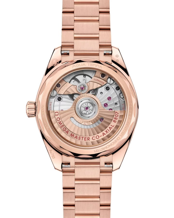 Часы Omega Seamaster Aqua Terra выполнены в симметричном корпусе из полированного 18K Sedna™ золота с завинчивающейся задней крышкой, украшенной волновым узором. Безель инкрустирован бриллиантами, что добавляет модели роскошный акцент. Циферблат нежно-розового цвета дополнен 12 часовыми метками из рубина и стрелками из 18K Sedna™ золота, оснащёнными люминесцентным покрытиемЛюминесцентное покрытиеПозволяет считывать показания времени в темноте. Производители наносят на стрелки, часовые индексы, безель или поверхность циферблата светонакопительный состав, дающий холодное свечение. Super-LumiNova для лучшей читаемости в темноте. Калибр Omega 8807 сертифицирован как Master Chronometer — гарантия высочайшей точности и устойчивости к магнитным полям. Запас хода составляет 55 часов. Защиту циферблата обеспечивает сапфировое стеклоСапфировое стеклоПрочный и надёжный материал из кристалла сапфира синтетического происхождения, характеризующийся особой твёрдостью и устойчивостью к царапинам и повреждениям. с антибликовым покрытиемАнтибликовое покрытиеСлой оксида металла в 0,13-0,3 микрон, благодаря которому стекло часов не бликует и не отражает свет. Антибликовое покрытие уменьшает отражение света в 10 раз, обеспечивая отличную читаемость показателей циферблата. с обеих сторон. Водозащита позволяет использовать часы в воде без риска повреждения. Часы установлены на браслет из 18K Sedna™ золота с закруглёнными звеньями и раскладной застёжкойРаскладная застёжкаТакой тип застёжки используется только на браслетах из металла. Она никогда не раскрывается полностью, происходит разделение на 2 и более частей. Раскладывающая застёжка снизит вероятность потери часов к минимуму.. Вес модели — около 160 грамм. Это сочетание премиального качества, технологичности и классического дизайна.