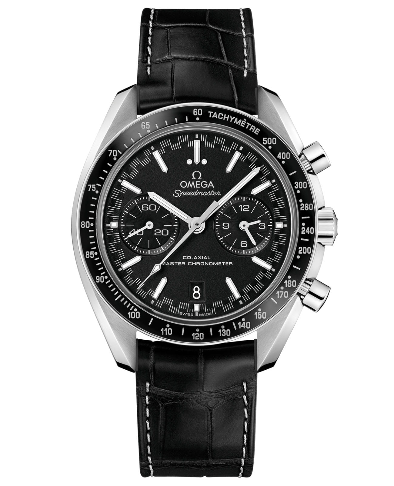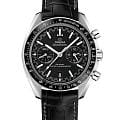 Speedmaster Racing Master Chronometer в 44,25-мм корпусе из нержавеющей стали с черным кожаным ремешком воплощает гоночный дух. Черное керамическое кольцоБезельВнешний ободок, закрепляющий стекло. В спортивных часах так называется поворотное кольцо с делениями на циферблате, выполняет роль таймера – замеряет отрезки времени на шкале. Неподвижный безель – элемент декора. Однонаправленно вращающийся безель на дайверских часах позволяет фиксировать моменты погружения и выныривания на поверхность. с тахиметрической шкалойТахиметрРазмеченная шкала, располагается на ободке или безеле часов. Тахиметр позволяет рассчитать скорость на определённом участке пути, расстояние измеряется в километрах или милях. из Liquidmetal™ подчеркивает спортивный характер. Черный циферблат с "спидометрной" минутной шкалой дополнен индексами из белого золота18-каратное золотоОбозначение по каратной системе пробирования, оно показывает, сколько драгоценного металла содержится в изделии. 18 карат - в составе 75% чистого золота, соответствует 750 пробе.