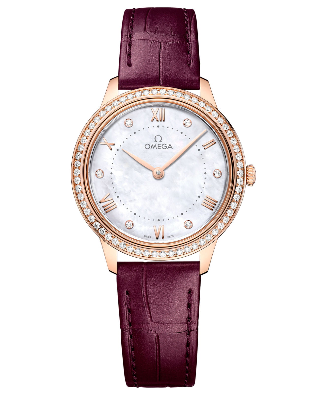 Sedna™. Лаконичный дизайн дополнен утонченной минутной шкалой в виде точек на внутреннем секторе и задней крышкой с рельефным медальоном, изображающим бога времени Хроноса. Модель представлена с переливающимся кожаным ремешком бордового цвета и оснащена кварцевым механизмом OMEGA 4061, гарантирующим бесперебойную работу не менее 48 месяцев.