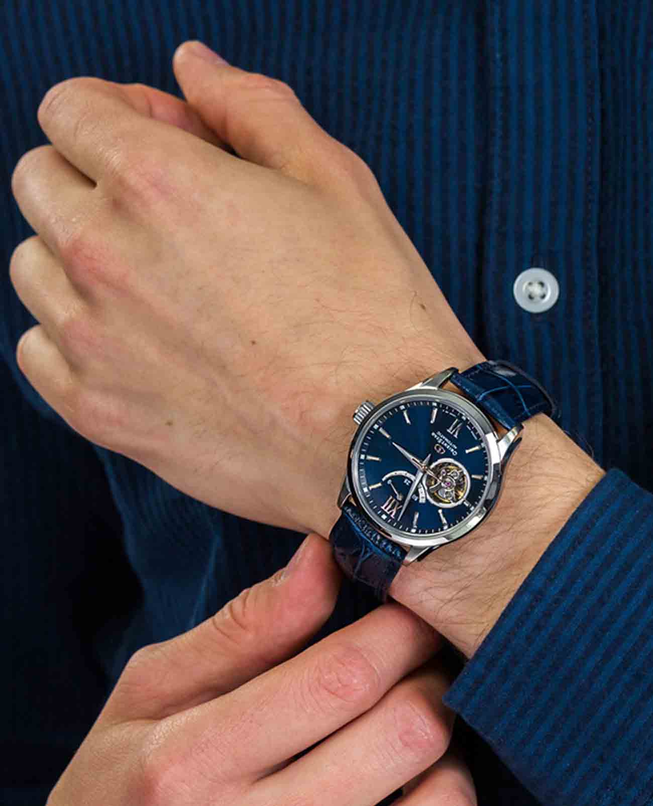Корпус часов выполнен из прочной нержавеющей стали, а рифленая заводная головка придает им особую элегантность. Прозрачная задняя крышка открывает взору работу механизма, делая часы еще более интересными для ценителей часового искусства. Открытый баланс добавляет динамичности и привлекает внимание к внутреннему устройству часов.