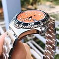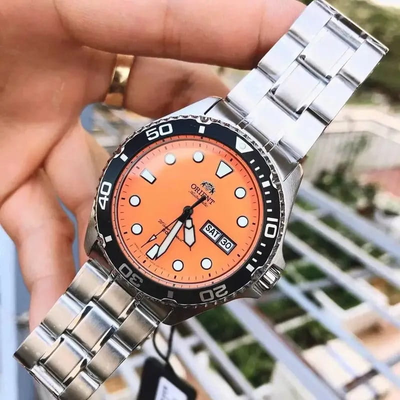 Мужские механические часы с автоподзаводом Orient Automatic AA02006M. Минеральное стеклоМинеральное стеклоМинеральное стекло представляет собой искусственно выращенный минерал кварца. Такое стекло отличается особой устойчивостью к повреждениям и царапинам. Уступает по некоторым качествам сапфировому стеклу. устойчивое к появлению царапин, обладающее высокой прозрачностью. Корпус из нержавеющей стали. Вращающийся безельБезельВнешний ободок, закрепляющий стекло. В спортивных часах так называется поворотное кольцо с делениями на циферблате, выполняет роль таймера – замеряет отрезки времени на шкале. Неподвижный безель – элемент декора. Однонаправленно вращающийся безель на дайверских часах позволяет фиксировать моменты погружения и выныривания на поверхность. из нержавеющей стали с PVDPVDУльтратонкое покрытие наносится в технике вакуумного напыления, сочетает в себе нитрид титана особой прочности со слоем золота или оксида хрома. Несёт в себе декоративную или защитную функцию. покрытием. Окошко даты в положении 3 часов. Стрелки с люминесцентным покрытиемЛюминесцентное покрытиеПозволяет считывать показания времени в темноте. Производители наносят на стрелки, часовые индексы, безель или поверхность циферблата светонакопительный состав, дающий холодное свечение.. Класс водозащиты: 200 метров, позволит плавать, нырять и заниматься другими водными видами спорта. Стальной браслет на раскладной застёжкеРаскладная застёжкаТакой тип застёжки используется только на браслетах из металла. Она никогда не раскрывается полностью, происходит разделение на 2 и более частей. Раскладывающая застёжка снизит вероятность потери часов к минимуму..