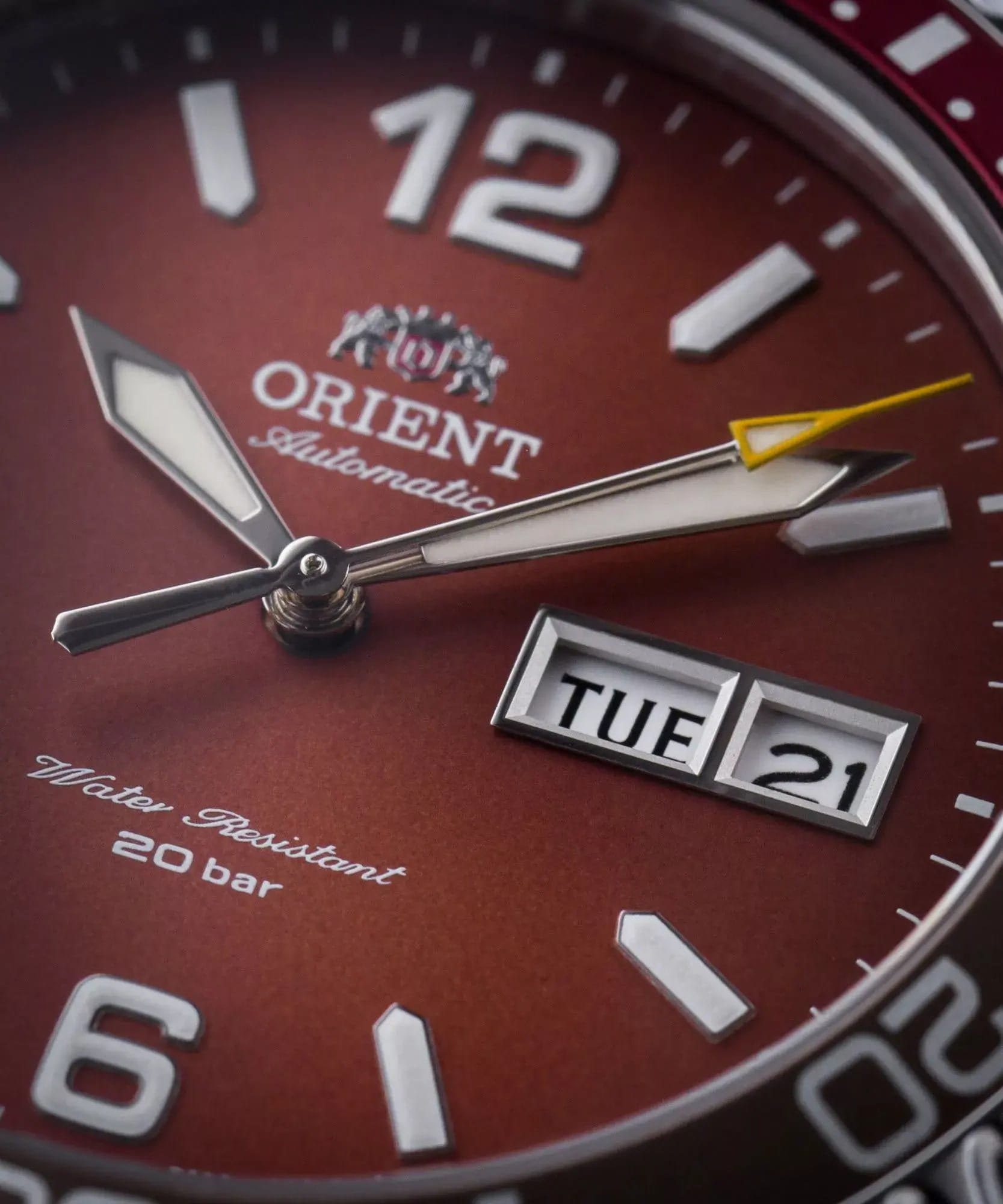 Часы Orient Mako III RA-AA0820R — это сочетание элегантного дизайна и высоких технологий. Корпус из нержавеющей стали диаметром 41,8 мм защищён Сапфировым стекломСапфировое стеклоПрочный и надёжный материал из кристалла сапфира синтетического происхождения, характеризующийся особой твёрдостью и устойчивостью к царапинам и повреждениям., обеспечивающим защиту от царапин и долговечность. Бордовый циферблат с метками и стрелками, покрытыми Люминесцентным составомЛюминесцентное покрытиеПозволяет считывать показания времени в темноте. Производители наносят на стрелки, часовые индексы, безель или поверхность циферблата светонакопительный состав, дающий холодное свечение., обеспечивает идеальную читаемость даже в условиях низкой освещенности. Однонаправленный БезельБезельВнешний ободок, закрепляющий стекло. В спортивных часах так называется поворотное кольцо с делениями на циферблате, выполняет роль таймера – замеряет отрезки времени на шкале. Неподвижный безель – элемент декора. Однонаправленно вращающийся безель на дайверских часах позволяет фиксировать моменты погружения и выныривания на поверхность. с двухцветной вставкой добавляет стильности и функциональности, что особенно полезно для дайвинга. Автоматический механизм Orient Calibre F6922 с функцией ручного завода и остановки секундной стрелки гарантирует точность и до 40 часов автономной работы. Браслет из нержавеющей стали оснащён раскладной застёжкой с фиксатором, обеспечивающей удобство и надёжность. Водонепроницаемость до 200 метров делает часы подходящими для подводных приключений, а окошко даты и дня недели на отметке «3 часа» добавляет удобства в повседневной жизни. Orient RA-AA0820R19B — это часы для тех, кто ценит стиль, функциональность и надежность.