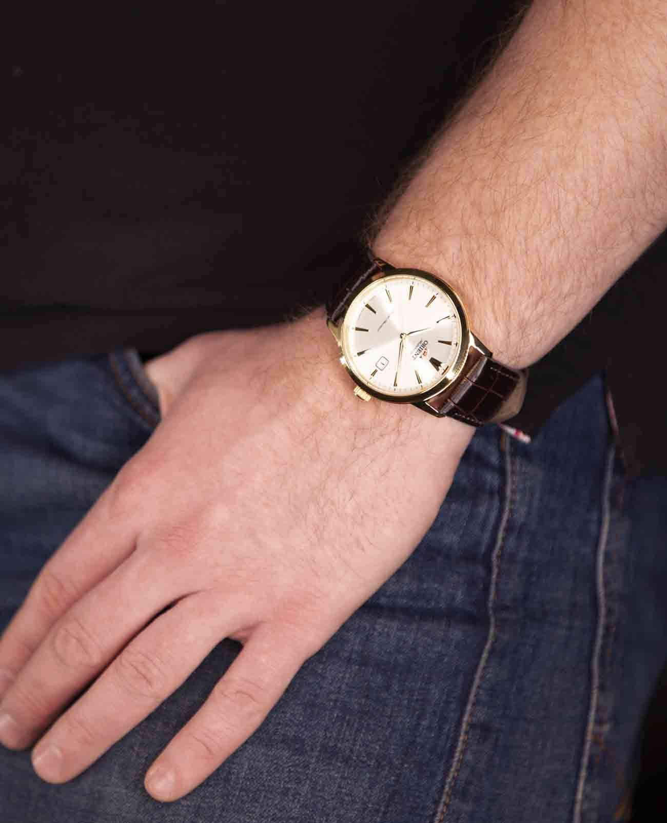 Мужские механические часы Orient Automatic RA-AC0F04S с автоподзаводом представляют собой сочетание классического стиля и современных технологий. Циферблат защищен прочным минеральным стекломМинеральное стеклоМинеральное стекло представляет собой искусственно выращенный минерал кварца. Такое стекло отличается особой устойчивостью к повреждениям и царапинам. Уступает по некоторым качествам сапфировому стеклу., что предотвращает появление царапин и обеспечивает отличную видимость. Корпус часов выполнен из нержавеющей стали с PVD-покрытиемPVDУльтратонкое покрытие наносится в технике вакуумного напыления, сочетает в себе нитрид титана особой прочности со слоем золота или оксида хрома. Несёт в себе декоративную или защитную функцию., что повышает его износостойкость и долговечность. На позиции «3 часа» расположено окошко даты, облегчая быстрый доступ к этой информации. Внутри механизма находится 22 камня, а частота колебаний составляет 21 600 полуколебаний в час, что обеспечивает стабильную и точную работу часов. Запас хода достигает 40 часов, что позволяет часам функционировать длительное время без дополнительного подзавода. Класс водозащиты 50 метров защитит часы от случайных брызг или попадания капель дождя, однако для плавания они не предназначены. Кожаный ремешок с классической застежкой завершает образ, придавая часам элегантный и универсальный вид. Orient Automatic RN-AC0F04S (RA-AC0F04S) — идеальный выбор для тех, кто предпочитает надежные и стильные аксессуары, способные подчеркнуть индивидуальность своего владельца.