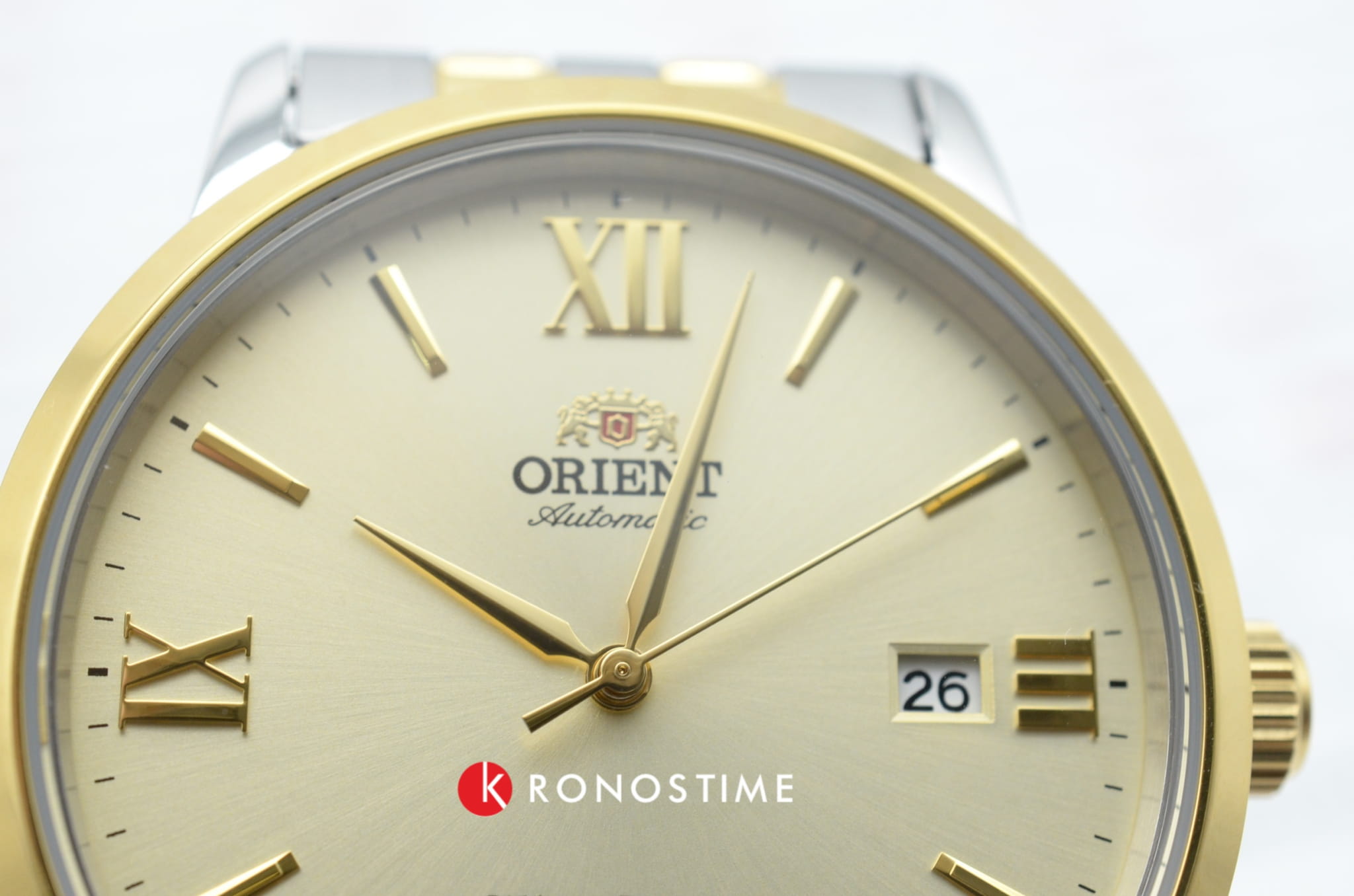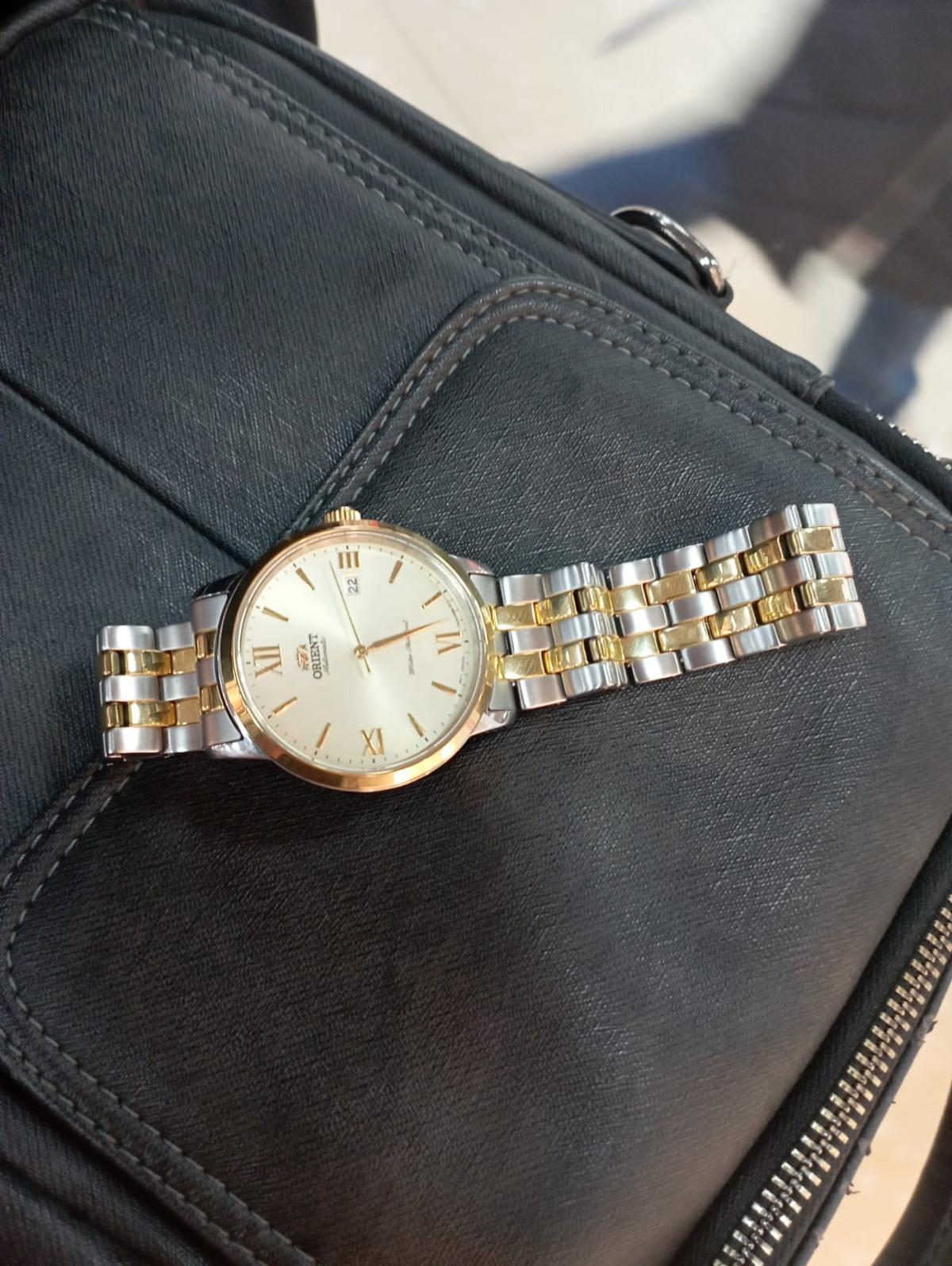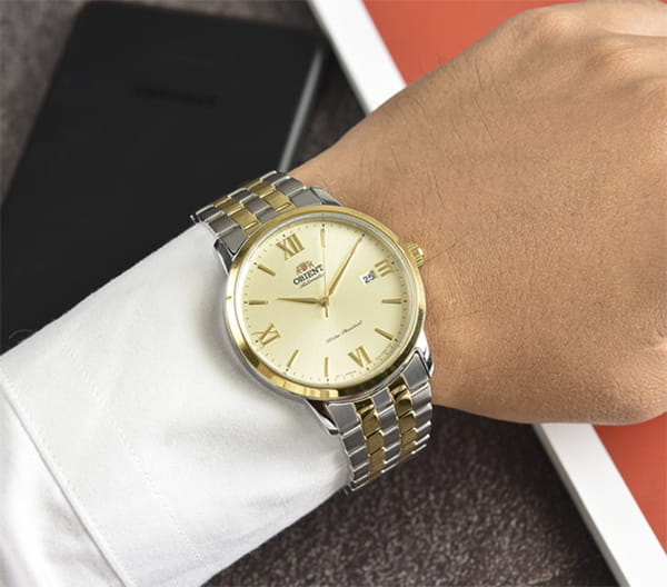 Часы Orient RA-AC0F08G — элегантная модель из коллекции Contemporary, объединяющая классический стиль и современные технологии. Корпус диаметром 41,6 мм выполнен из нержавеющей стали с золотистым фиксированным безелемБезельВнешний ободок, закрепляющий стекло. В спортивных часах так называется поворотное кольцо с делениями на циферблате, выполняет роль таймера – замеряет отрезки времени на шкале. Неподвижный безель – элемент декора. Однонаправленно вращающийся безель на дайверских часах позволяет фиксировать моменты погружения и выныривания на поверхность., подчёркивающим утончённый дизайн. Шампань-циферблат украшен золотистыми стрелками и часовыми метками, дополненными римскими цифрами на позициях 3, 6, 9 и 12 часов. Сапфировое стеклоСапфировое стеклоПрочный и надёжный материал из кристалла сапфира синтетического происхождения, характеризующийся особой твёрдостью и устойчивостью к царапинам и повреждениям. обеспечивает защиту от царапин, сохраняя идеальный внешний вид. Часы оснащены автоматическим механизмом Orient Calibre F6722 с функцией ручного завода и остановки секундной стрелки, что гарантирует точность и удобство использования. На отметке «3 часа» расположено окошко даты, добавляющее практичности. Двухцветный браслет из нержавеющей стали с раскладной застёжкойРаскладная застёжкаТакой тип застёжки используется только на браслетах из металла. Она никогда не раскрывается полностью, происходит разделение на 2 и более частей. Раскладывающая застёжка снизит вероятность потери часов к минимуму. сочетает комфорт и стиль. Водонепроницаемость до 50 метров делает часы подходящими для повседневного использования. Orient RA-AC0F08G — это утончённый аксессуар для тех, кто ценит японское качество и элегантность.