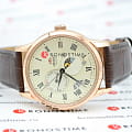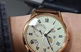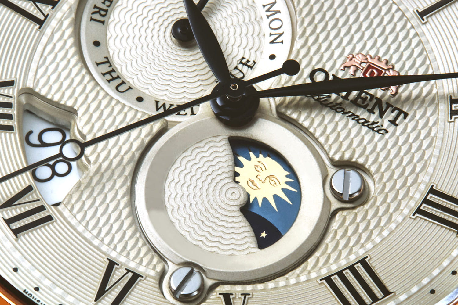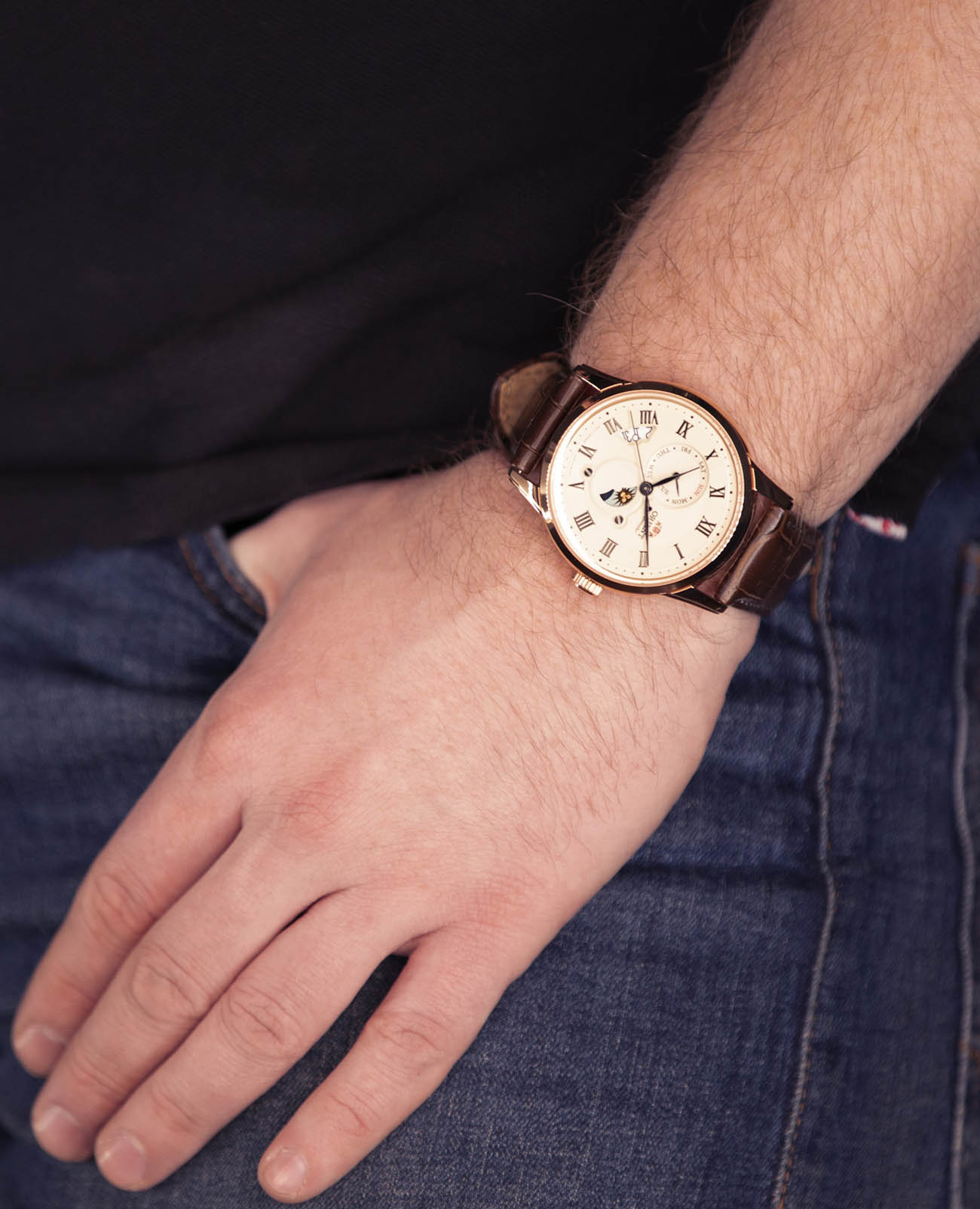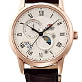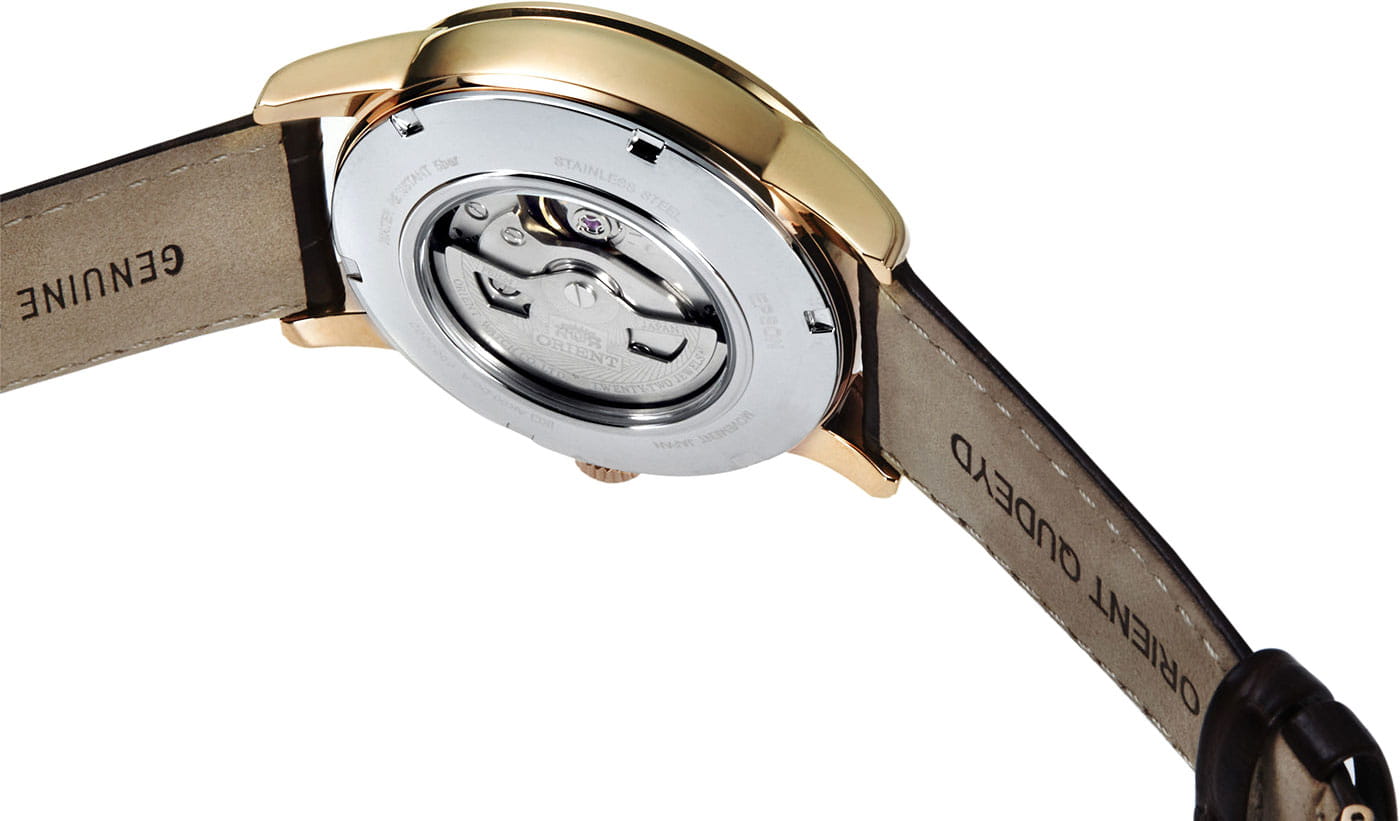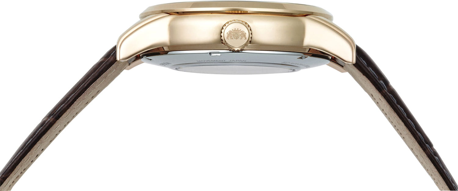 Часы Orient RA-AK0007S из коллекции Sun and Moon — это утончённое сочетание классического дизайна и функциональности. Корпус диаметром 42,5 мм выполнен из нержавеющей стали с элегантным PVD-покрытиемPVDУльтратонкое покрытие наносится в технике вакуумного напыления, сочетает в себе нитрид титана особой прочности со слоем золота или оксида хрома. Несёт в себе декоративную или защитную функцию. розового золота, что подчёркивает изысканность модели. Изысканный кремовый циферблат украшен чёрными римскими цифрами и стрелками, а отображает смену времени суток, добавляя часам уникальности. Отдельные указатели дня недели и даты на циферблате подчёркивают практичность модели. Сапфировое стеклоСапфировое стеклоПрочный и надёжный материал из кристалла сапфира синтетического происхождения, характеризующийся особой твёрдостью и устойчивостью к царапинам и повреждениям. с выпуклой формой защищает циферблат от царапин. Автоматический механизм Orient Calibre F6B24 поддерживает ручной завод и функцию остановки секундной стрелки, обеспечивая точность хода. Запас хода составляет около 40 часов, что делает часы надёжными в повседневной жизни. Коричневый кожаный ремешок с тиснением под крокодила и раскладной застёжкой-бабочкойЗастёжка "бабочка"Такой вид застёжки дополняется предохранителями, помогающими избежать случайного раскрытия браслета. Обладают изящным исполнением. обеспечивает комфортное ношение и надёжную фиксацию. Водонепроницаемость до 50 метров защищает часы от случайных брызг. Orient RA-AK0007S — это идеальный аксессуар для тех, кто ценит стиль, функциональность и традиции часового искусства.