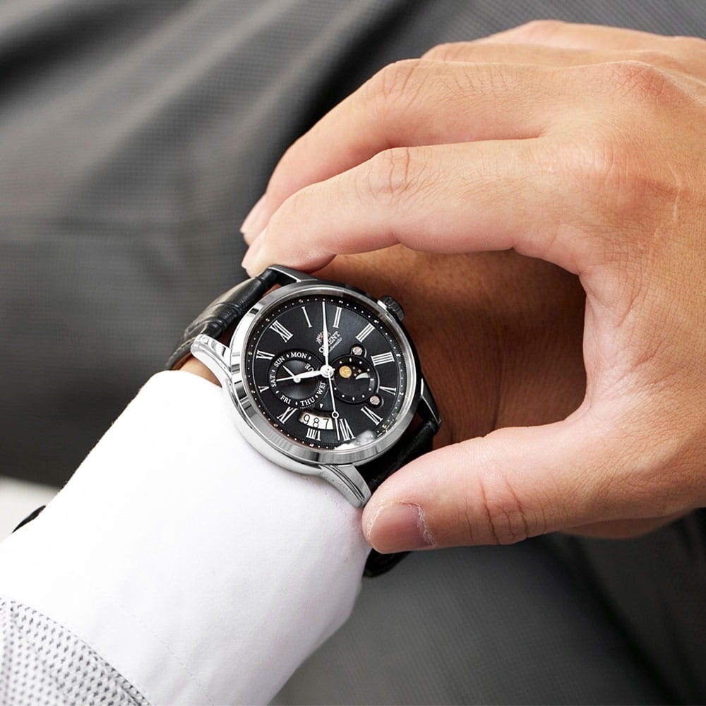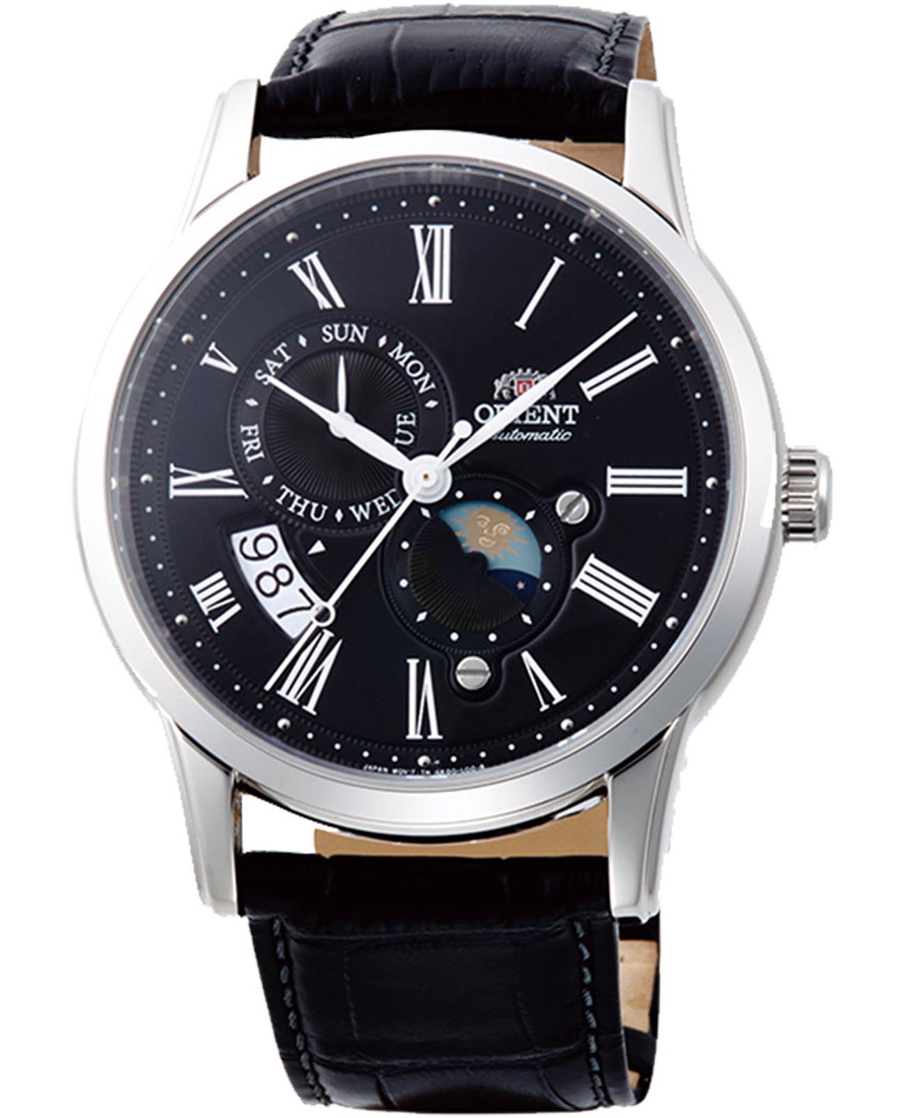 Мужские механические часы с автоподзаводом Orient Classic Automatic RA-AK00. Сапфировое стеклоСапфировое стеклоПрочный и надёжный материал из кристалла сапфира синтетического происхождения, характеризующийся особой твёрдостью и устойчивостью к царапинам и повреждениям. повышенной прозрачности, устойчивое к мелким механическим повреждениям. Корпус часов выполнен из нержавеющей стали. Циферблат часов оснащен индикатором дня и ночи, отдельный циферблат с отображением дня недели. Окошко даты находится в положении между 7 и 8 часов. Класс водозащиты: 50 метров, позволит защитить корпус от случайных брызг или капель дождя. Практичный кожаный ремешок с раскладной застёжкойРаскладная застёжкаТакой тип застёжки используется только на браслетах из металла. Она никогда не раскрывается полностью, происходит разделение на 2 и более частей. Раскладывающая застёжка снизит вероятность потери часов к минимуму..