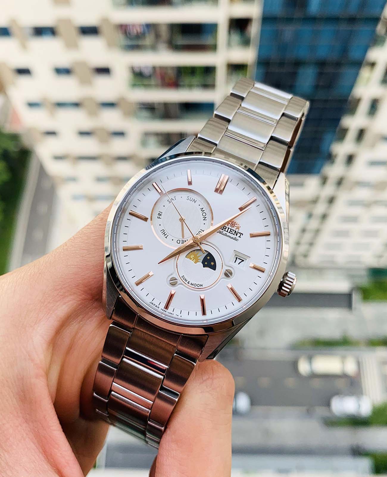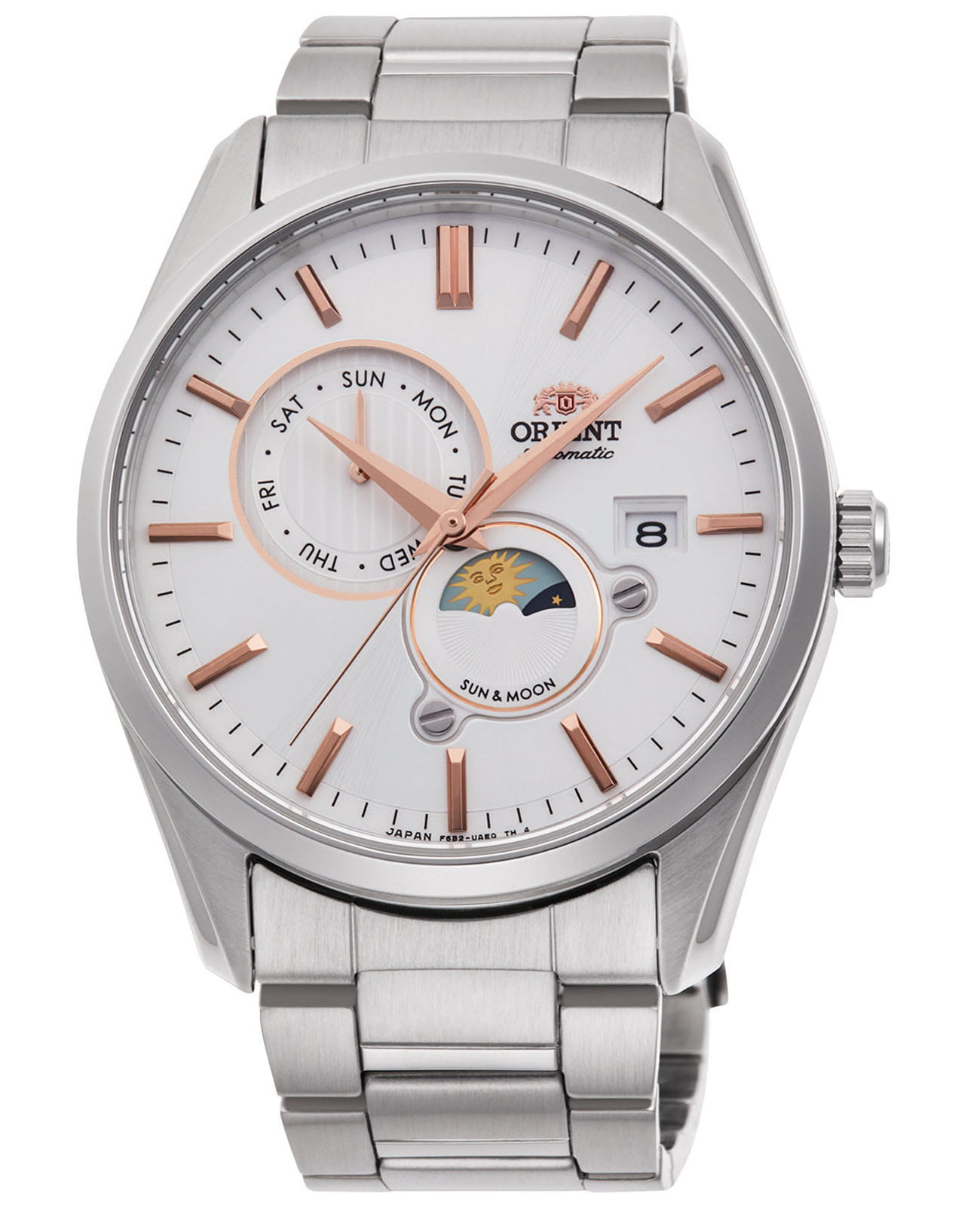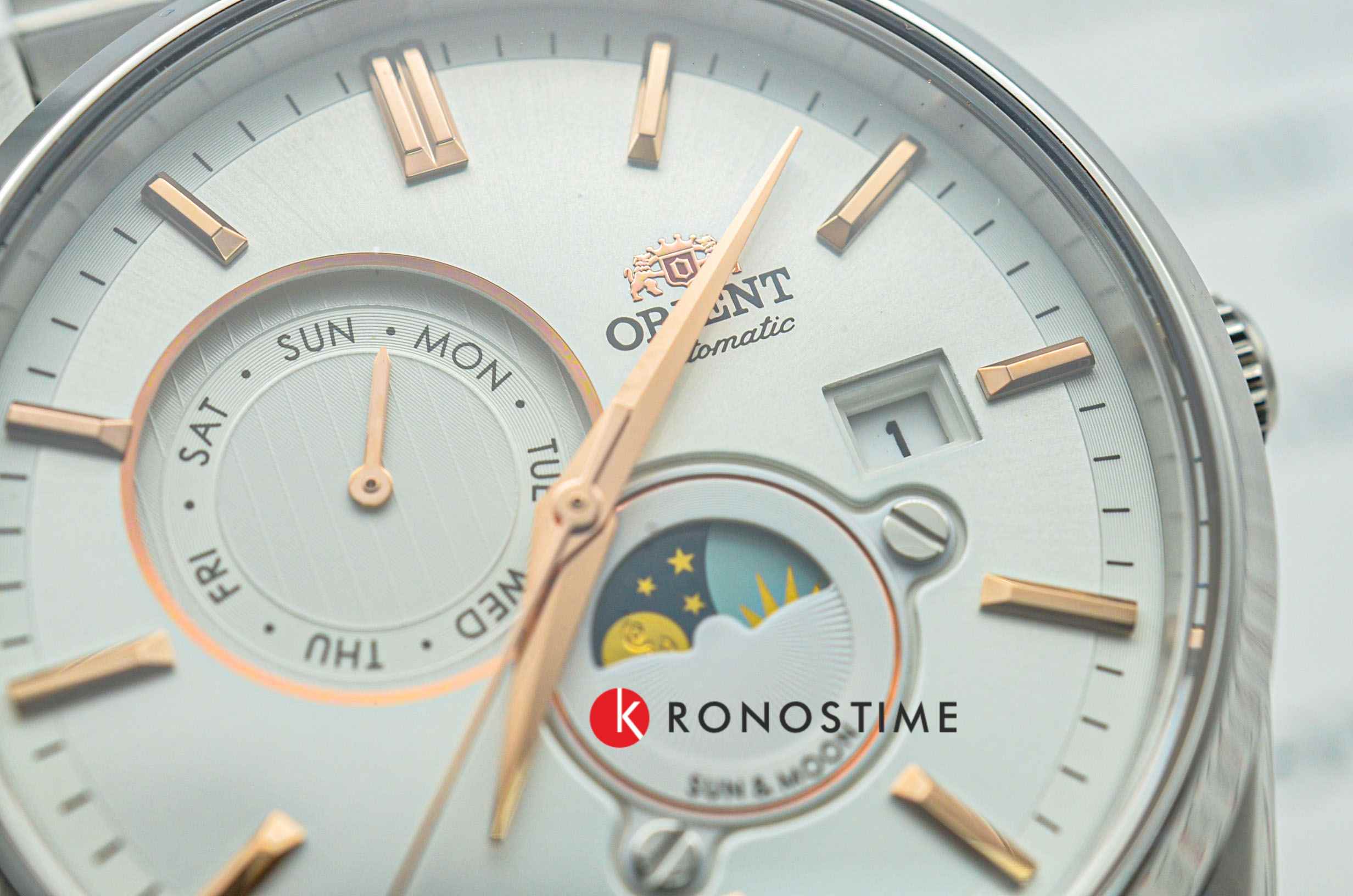 Часы Orient RA-AK0301S из коллекции Sun & Moon — это изысканный аксессуар, сочетающий элегантный дизайн и современные функции. Корпус диаметром 41,5 мм выполнен из нержавеющей стали и защищён сапфировым стекломСапфировое стеклоПрочный и надёжный материал из кристалла сапфира синтетического происхождения, характеризующийся особой твёрдостью и устойчивостью к царапинам и повреждениям., обеспечивающим стойкость к царапинам. Белый циферблат украшен , который показывает смену времени суток, а римские цифры и золотистые стрелки добавляют классической элегантности. Окошко даты расположено на отметке «3 часа», а дополнительный индикатор отображает день недели. Автоматический механизм Orient Calibre F6B24 с функцией ручного завода и остановки секундной стрелки обеспечивает точность и надёжность. Запас хода до 40 часов гарантирует бесперебойную работу часов. Браслет из нержавеющей стали с раскладной застёжкойРаскладная застёжкаТакой тип застёжки используется только на браслетах из металла. Она никогда не раскрывается полностью, происходит разделение на 2 и более частей. Раскладывающая застёжка снизит вероятность потери часов к минимуму. обеспечивает комфортное ношение и надёжную фиксацию. Водонепроницаемость до 50 метров защищает модель от случайных брызг. Orient RA-AK0301S — идеальные часы для тех, кто ценит японское качество, функциональность и классический стиль.