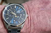 Часы Orient RA-AK0308L из коллекции Sun & Moon — это изысканная модель, сочетающая элегантный стиль и продвинутые функции. Корпус диаметром 42 мм выполнен из нержавеющей стали и защищён сапфировым стекломСапфировое стеклоПрочный и надёжный материал из кристалла сапфира синтетического происхождения, характеризующийся особой твёрдостью и устойчивостью к царапинам и повреждениям., обеспечивающим устойчивость к царапинам. Глубокий синий циферблат украшен серебристыми стрелками и , который элегантно отображает смену времени суток. Дополнительный индикатор дня недели и окошко даты на отметке «3 часа» придают модели функциональности и практичности. Автоматический механизм Orient Calibre F6B24 поддерживает ручной завод и функцию остановки секундной стрелки, обеспечивая точность и надёжность. Запас хода составляет до 40 часов. Браслет из нержавеющей стали с раскладной застёжкойРаскладная застёжкаТакой тип застёжки используется только на браслетах из металла. Она никогда не раскрывается полностью, происходит разделение на 2 и более частей. Раскладывающая застёжка снизит вероятность потери часов к минимуму. обеспечивает удобную посадку и надёжную фиксацию на запястье. Водонепроницаемость до 50 метров делает модель подходящей для повседневного использования. Orient RA-AK0308L — это идеальный выбор для ценителей японского качества, утончённого стиля и современных технологий.