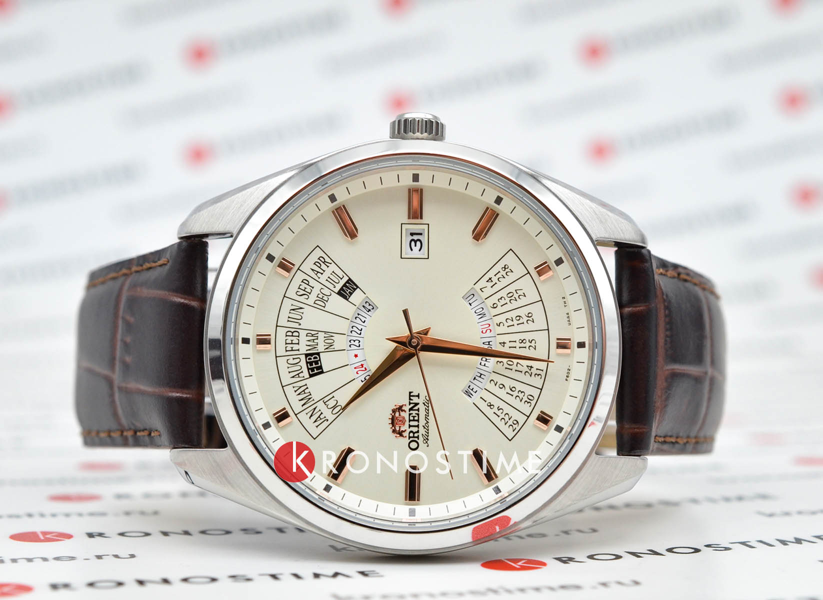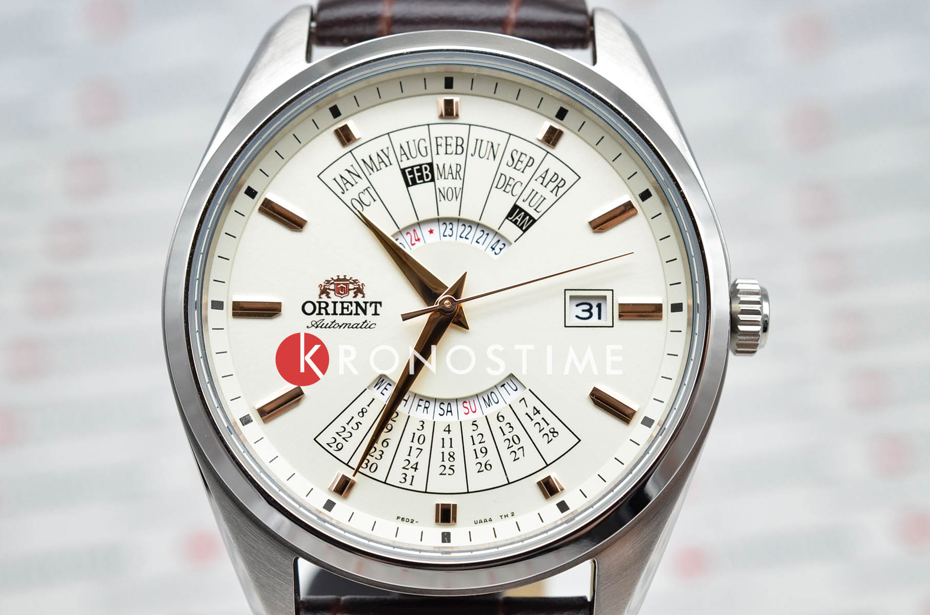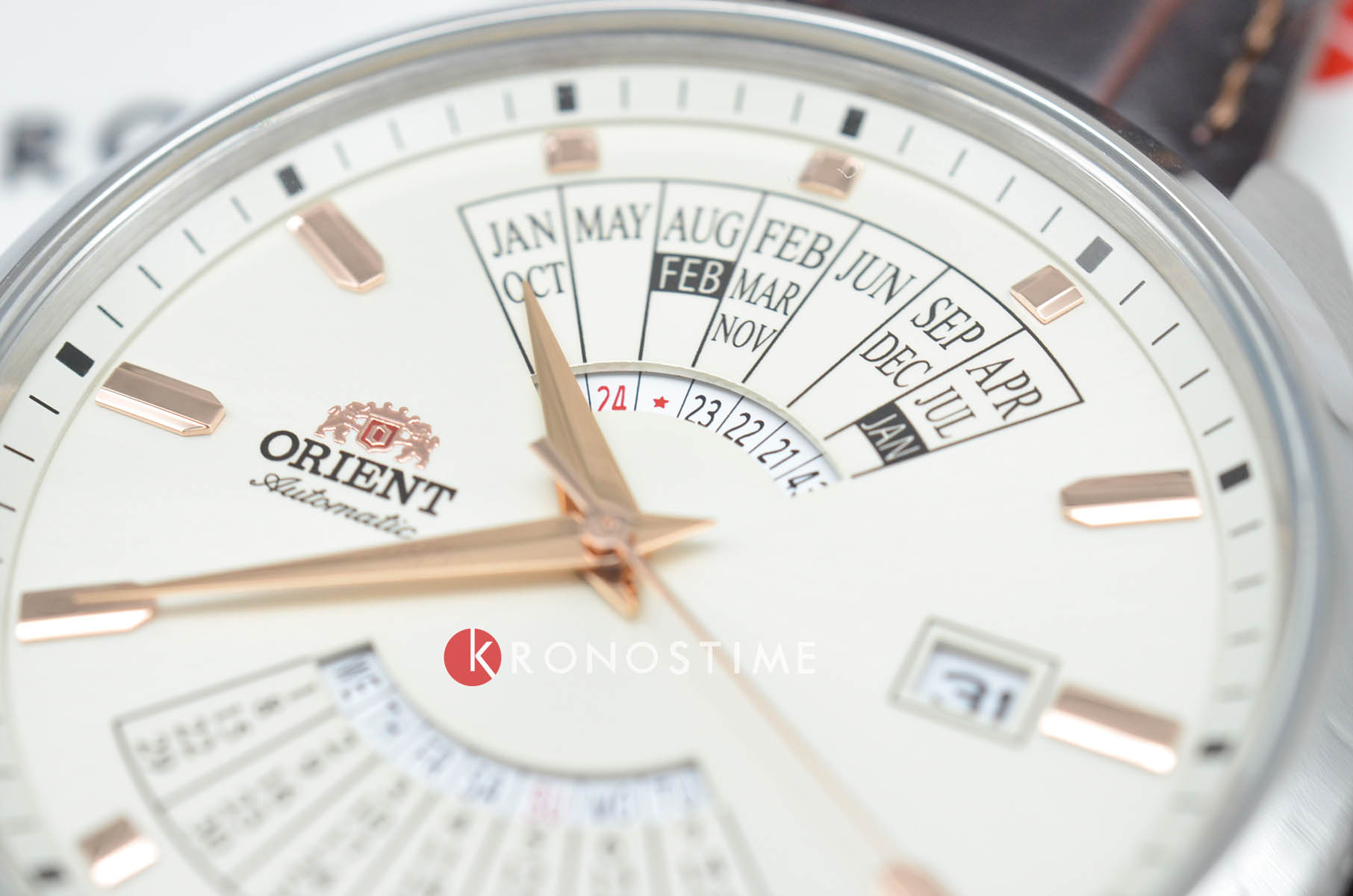Orient RA‑BA0005S Multi‑Year Calendar — элегантная модель с выразительным дизайном и практичной функциональностью. Корпус диаметром 43,5 мм выполнен из нержавеющей стали с полированной поверхностью, придающей часам сдержанный и благородный облик.