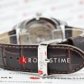 Модель обладает водозащитой до 50 метров, подходящей для повседневного использования. Дополняет образ коричневый кожаный ремешок с классической пряжкой, подчёркивающий стильную строгость модели.