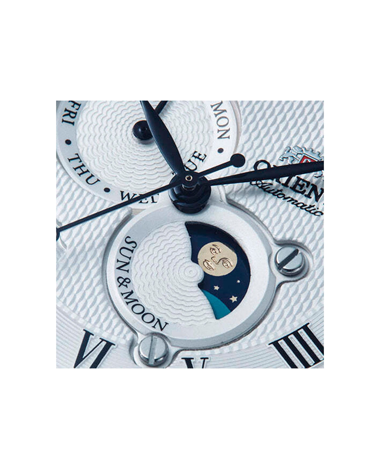 Циферблат выполнен в белом цвете с уникальным дизайном, включающим индикацию солнца и луны (Sun & Moon), что добавляет часам уникальный и стильный вид.
