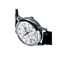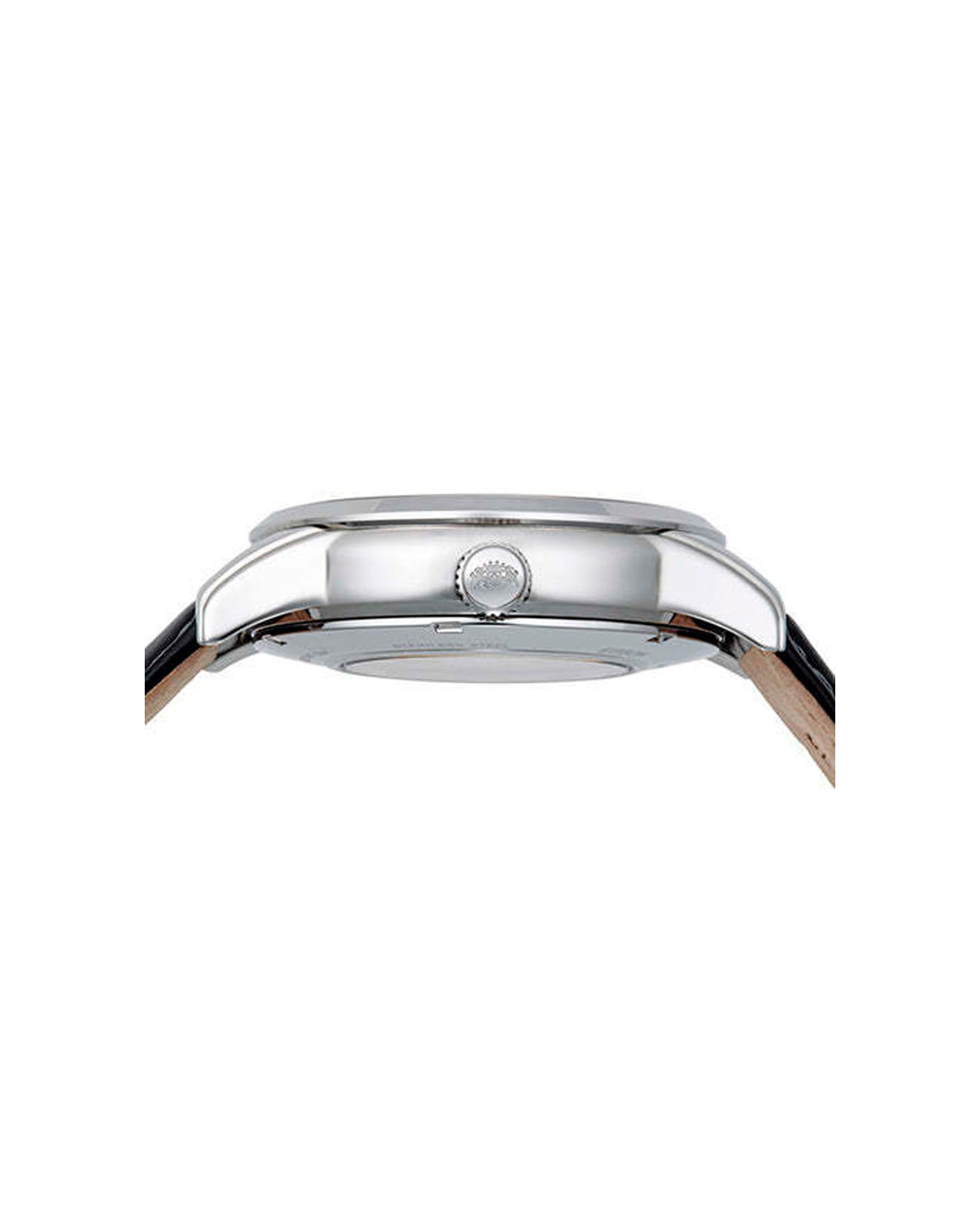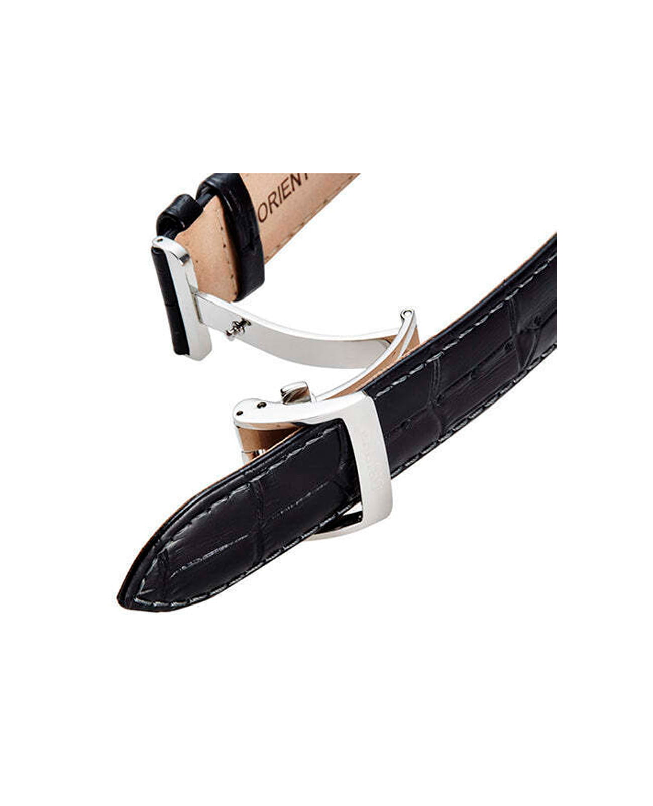 Браслет часов изготовлен из чёрной кожи, что придаёт часам классический и элегантный вид. Застёжка выполнена в виде раскладной застежкиРаскладная застёжкаТакой тип застёжки используется только на браслетах из металла. Она никогда не раскрывается полностью, происходит разделение на 2 и более частей. Раскладывающая застёжка снизит вероятность потери часов к минимуму., которая обеспечивает удобство и надёжную фиксацию на запястье.