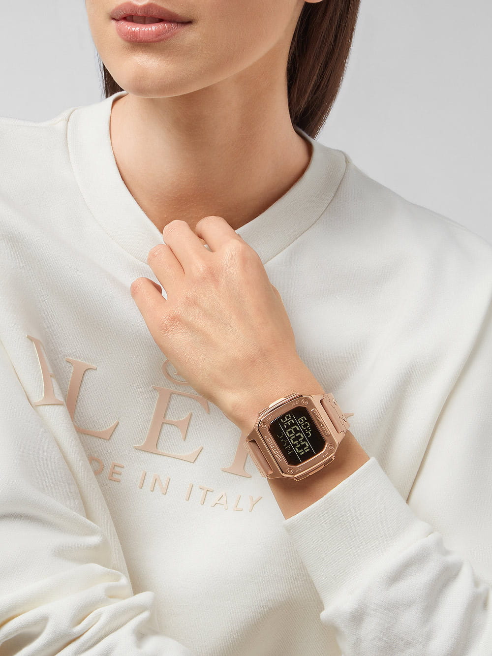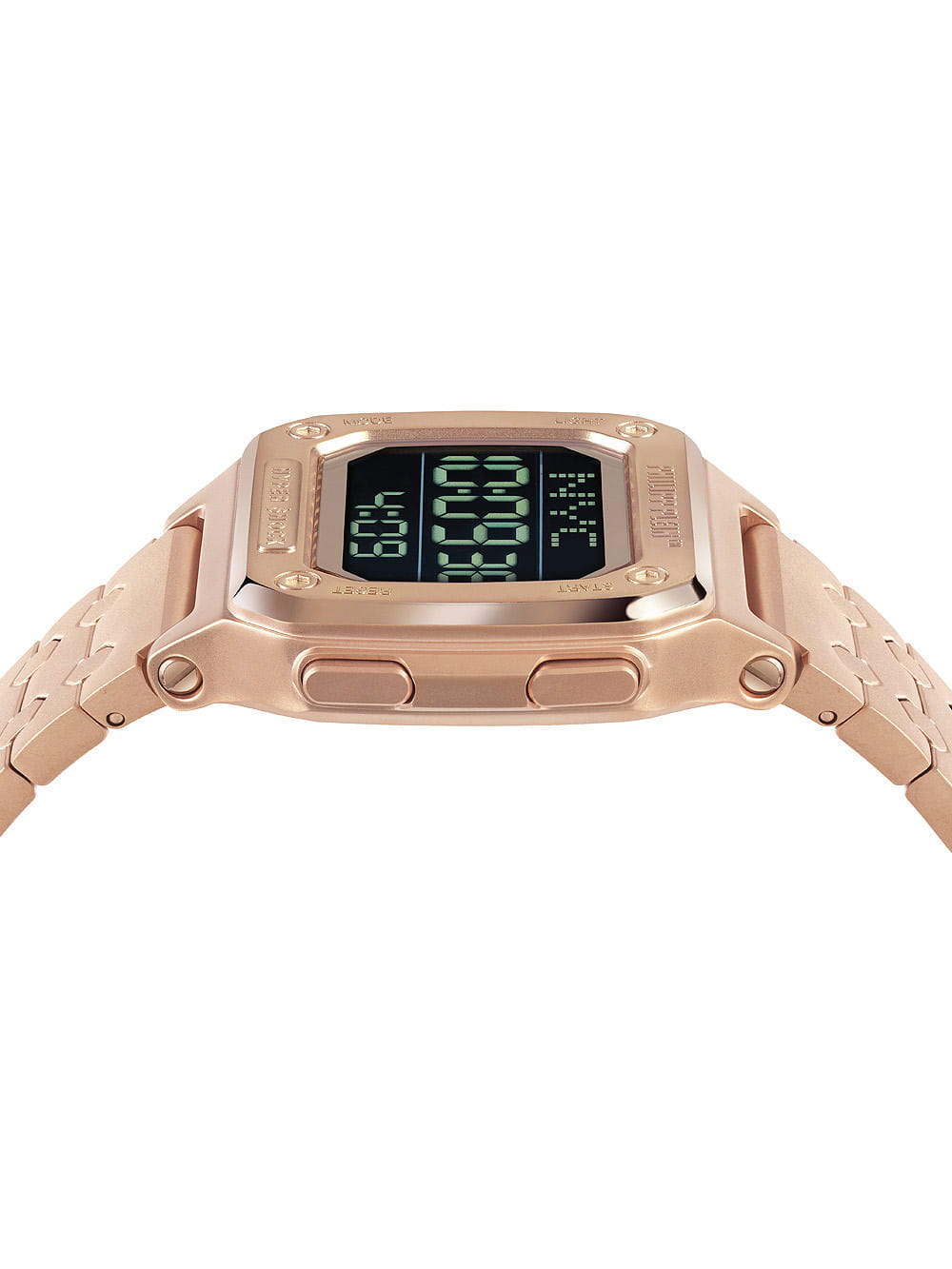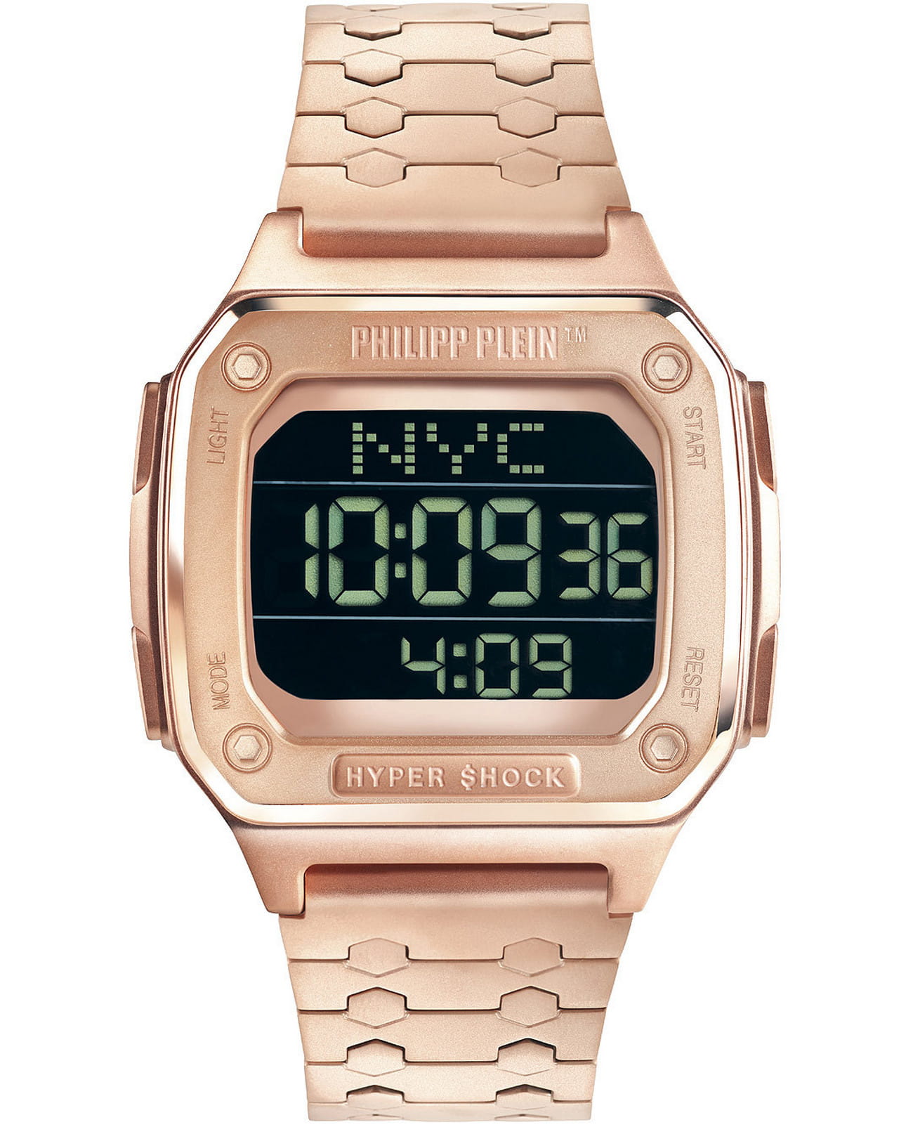 Электронные унисекс часы-хронографХронографФункция позволяет измерять отрезки времени с особой точностью: часы, минуты, секунды. Верным признаком хронографа является наличие на циферблате 3 дополнительных окошек-счётчиков. Philipp Plein Hyper Shock PWHAA0721, электронный механизм с высокой точностью. Класс водозащиты: 50 метров, позволит защитить корпус от случайных брызг или капель дождя. Прямоугольный корпус выполнен из нержавеющей стали с IP-покрытиемIP-покрытиеМетод ионного напыления. Демонстрирует повышенную устойчивость к истиранию, окислению и химическим веществам. Под воздействием высокого давления и температуры около 1500°C молекулы металла надёжно соединяются с частицами корпуса часов. цвета розового золота. Браслет из нержавеющей стали шириной 22 мм, застёжка «бабочка» с кнопкамиЗастёжка "бабочка"Такой вид застёжки дополняется предохранителями, помогающими избежать случайного раскрытия браслета. Обладают изящным исполнением. .
