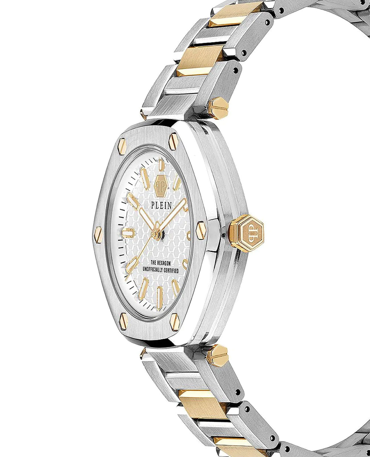 Стильные женские часы Philipp Plein The Hexagon PW1BA0523 с надежным кварцевым механизмом. Корпус часов изготовлен из нержавеющей стали. Минеральное стеклоМинеральное стеклоМинеральное стекло представляет собой искусственно выращенный минерал кварца. Такое стекло отличается особой устойчивостью к повреждениям и царапинам. Уступает по некоторым качествам сапфировому стеклу. устойчивое к мелким механическим повреждениям. Влагозащита: 50 метров, позволит защитить корпус от случайных брызг или капель дождя. Стрелки и метки с люминесцентным покрытиемЛюминесцентное покрытиеПозволяет считывать показания времени в темноте. Производители наносят на стрелки, часовые индексы, безель или поверхность циферблата светонакопительный состав, дающий холодное свечение.. Стальной браслет на застёжке-бабочке с кнопкамиЗастёжка "бабочка"Такой вид застёжки дополняется предохранителями, помогающими избежать случайного раскрытия браслета. Обладают изящным исполнением. .