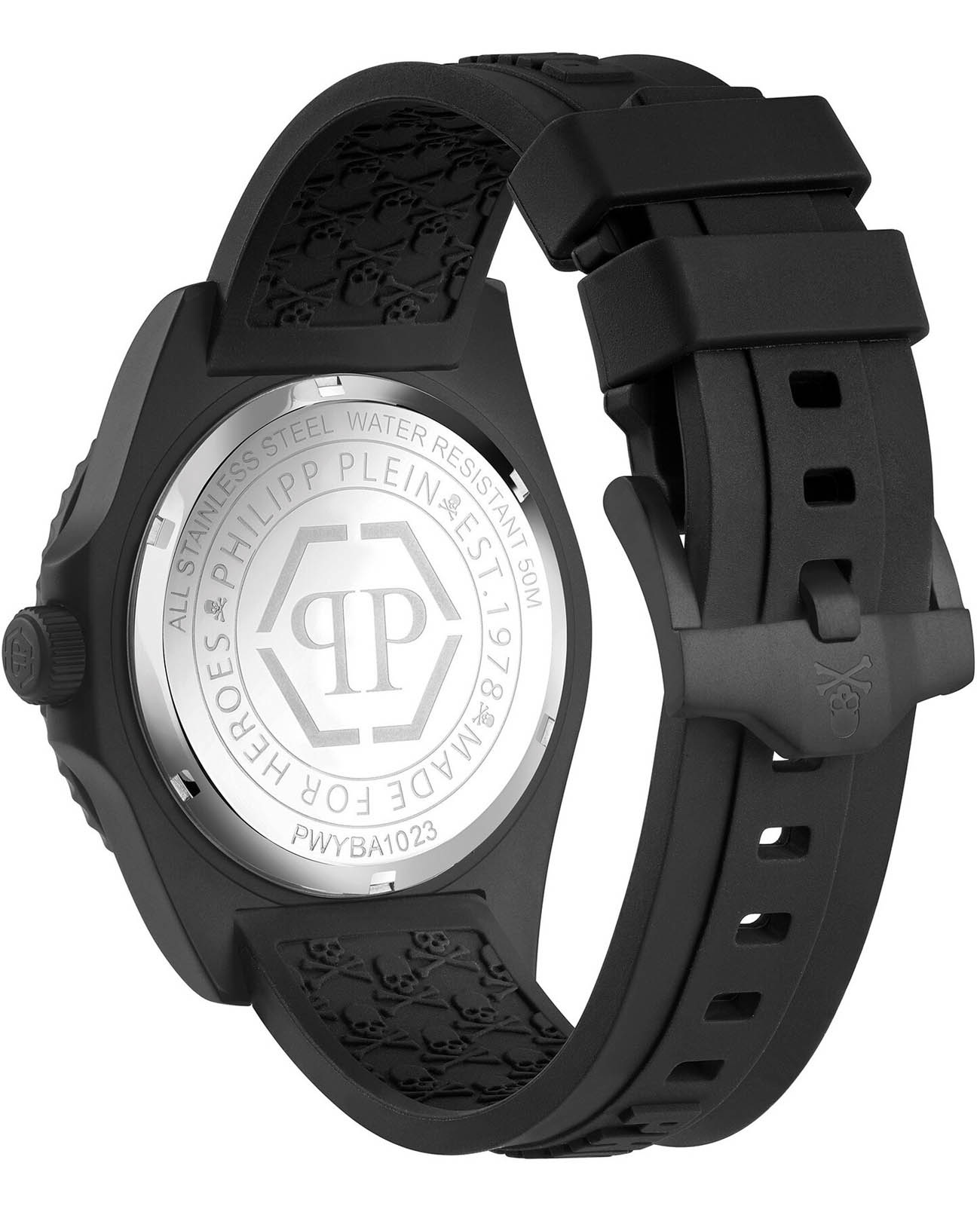 Мужские часы Philipp Plein GMT-I Challenger PWYBA1023 с надежным кварцевым механизмом. Корпус часов изготовлен из нержавеющей стали с IP-покрытиемIP-покрытиеМетод ионного напыления. Демонстрирует повышенную устойчивость к истиранию, окислению и химическим веществам. Под воздействием высокого давления и температуры около 1500°C молекулы металла надёжно соединяются с частицами корпуса часов.. Минеральное стеклоМинеральное стеклоМинеральное стекло представляет собой искусственно выращенный минерал кварца. Такое стекло отличается особой устойчивостью к повреждениям и царапинам. Уступает по некоторым качествам сапфировому стеклу. устойчивое к мелким механическим повреждениям. Влагозащита: 100 метров, позволит плавать, нырять и заниматься другими водными видами спорта. Стрелки и метки с люминесцентным покрытиемЛюминесцентное покрытиеПозволяет считывать показания времени в темноте. Производители наносят на стрелки, часовые индексы, безель или поверхность циферблата светонакопительный состав, дающий холодное свечение.. Окошко даты находится в положении 3 часа. Вращающийся безельБезельВнешний ободок, закрепляющий стекло. В спортивных часах так называется поворотное кольцо с делениями на циферблате, выполняет роль таймера – замеряет отрезки времени на шкале. Неподвижный безель – элемент декора. Однонаправленно вращающийся безель на дайверских часах позволяет фиксировать моменты погружения и выныривания на поверхность. с PVD-покрытиемPVDУльтратонкое покрытие наносится в технике вакуумного напыления, сочетает в себе нитрид титана особой прочности со слоем золота или оксида хрома. Несёт в себе декоративную или защитную функцию..