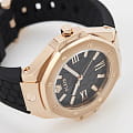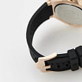 Philipp Plein Plein Lady Royal PWBDA0324 — это женские часы, сочетающие современный дизайн и функциональность. Корпус диаметром 39 мм выполнен из нержавеющей стали с розовым PVD-покрытиемPVDУльтратонкое покрытие наносится в технике вакуумного напыления, сочетает в себе нитрид титана особой прочности со слоем золота или оксида хрома. Несёт в себе декоративную или защитную функцию., что придаёт часам изысканный и стильный вид. Минеральное стеклоМинеральное стеклоМинеральное стекло представляет собой искусственно выращенный минерал кварца. Такое стекло отличается особой устойчивостью к повреждениям и царапинам. Уступает по некоторым качествам сапфировому стеклу. защищает циферблат от царапин, сохраняя его внешний вид. Чёрный циферблат с уникальной шестиугольной текстурой подчёркивает фирменный стиль бренда. Часы оснащены кварцевым механизмом, который обеспечивает точность хода. Водозащита до 5 ATM (50 метров) позволяет использовать часы в повседневной жизни. Ремешок из чёрного силикона обеспечивает комфортное ношение и надёжную фиксацию благодаря классической застёжке. Ширина ремешка 16 мм гармонично сочетается с размером корпуса, завершая смелый и современный образ.