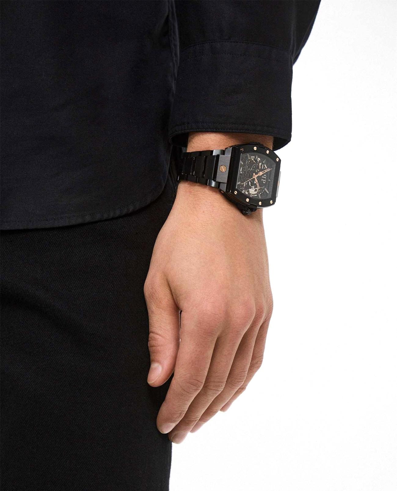 Philipp Plein The $keleton 2.0 PWJFA0725 - это дерзкие и бескомпромиссные часы, воплощающие бунтарский дух бренда. Их отличает узнаваемый мотив черепа, ставший визитной карточкой Philipp Plein, искусно интегрированный в дизайн циферблата. Скелетонизированные мужские механические часы с автоподзаводом. Бочкообразный стальной корпус диаметром 44 мм с PVD-покрытиемPVDУльтратонкое покрытие наносится в технике вакуумного напыления, сочетает в себе нитрид титана особой прочности со слоем золота или оксида хрома. Несёт в себе декоративную или защитную функцию.. Стальной браслет на застёжке-бабочке с кнопкамиЗастёжка "бабочка"Такой вид застёжки дополняется предохранителями, помогающими избежать случайного раскрытия браслета. Обладают изящным исполнением. обеспечивает надёжную фиксацию и комфортное ношение. Метки в виде точек. Минеральное стеклоМинеральное стеклоМинеральное стекло представляет собой искусственно выращенный минерал кварца. Такое стекло отличается особой устойчивостью к повреждениям и царапинам. Уступает по некоторым качествам сапфировому стеклу. защищает циферблат от царапин. Люминесцентное покрытиеЛюминесцентное покрытиеПозволяет считывать показания времени в темноте. Производители наносят на стрелки, часовые индексы, безель или поверхность циферблата светонакопительный состав, дающий холодное свечение. стрелок и меток позволит следить за временем даже в полной темноте. Граненая заводная головка. Влагозащита: 50 метров, позволит защитить корпус от случайных брызг или капель дождя. Идеальный аксессуар для тех, кто ценит индивидуальность и не боится выделяться из толпы.