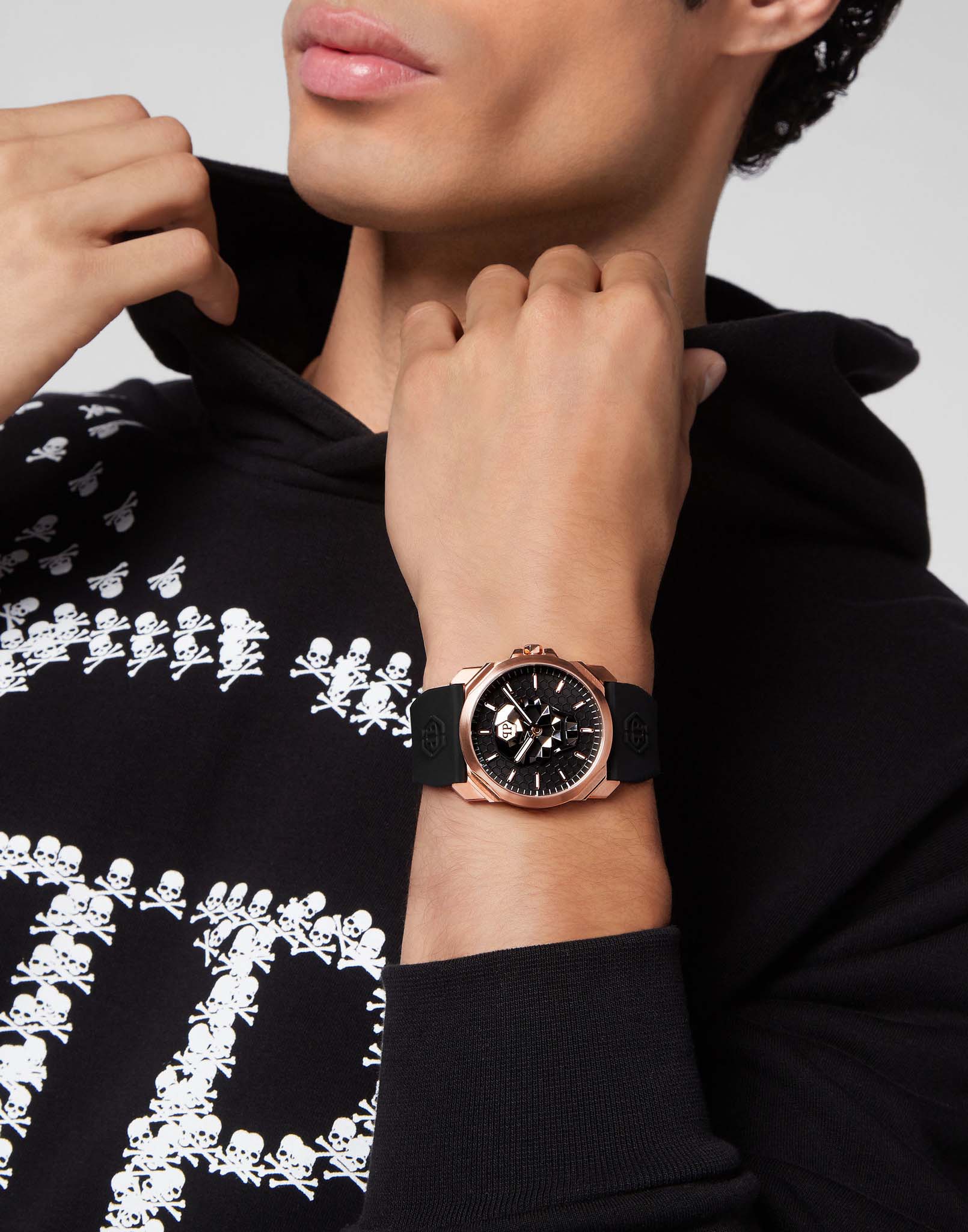 Мужские кварцевые часы с фирменным изображением черепа Philipp Plein The Skull King PWLAA0222, кварцевый механизм с высокой точностью. Класс водозащиты: 50 метров, позволит защитить корпус от случайных брызг или капель дождя. Корпус часов изготовлен из стали с IP-покрытиемIP-покрытиеМетод ионного напыления. Демонстрирует повышенную устойчивость к истиранию, окислению и химическим веществам. Под воздействием высокого давления и температуры около 1500°C молекулы металла надёжно соединяются с частицами корпуса часов. цвета розовое золото. Черный силиконовый ремешок шириной 26 мм, стандартная застежка. Прочное минеральное стеклоМинеральное стеклоМинеральное стекло представляет собой искусственно выращенный минерал кварца. Такое стекло отличается особой устойчивостью к повреждениям и царапинам. Уступает по некоторым качествам сапфировому стеклу. устойчивое к мелким механическим повреждениям.