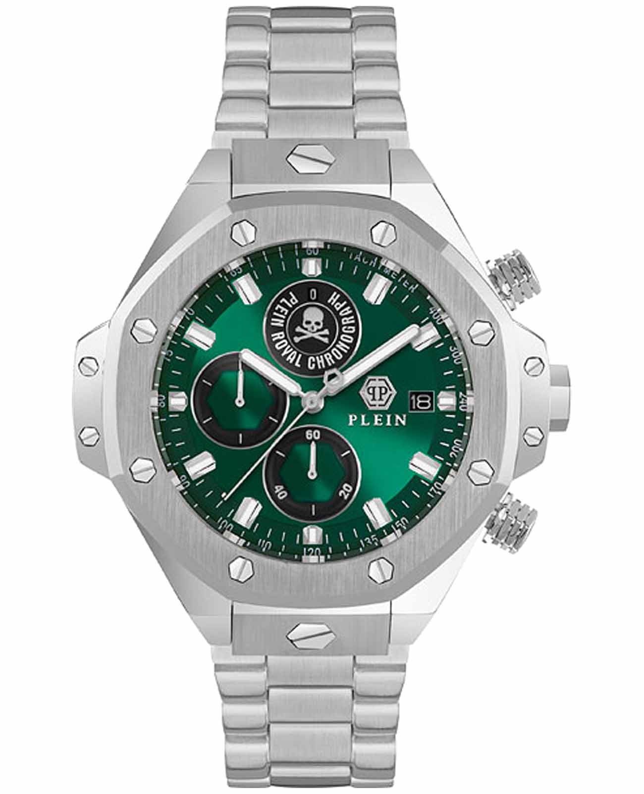Philipp Plein Plein Chrono Royal PWLFA0425 - это дерзкие и бескомпромиссные часы, воплощающие бунтарский дух бренда. Диаметр корпуса из прочной нержавеющей стали равен 46 мм. Стальной браслет на застёжке-бабочке с кнопкамиЗастёжка "бабочка"Такой вид застёжки дополняется предохранителями, помогающими избежать случайного раскрытия браслета. Обладают изящным исполнением. обеспечивает надёжную фиксацию и комфортное ношение. Метки в виде точек. Минеральное стеклоМинеральное стеклоМинеральное стекло представляет собой искусственно выращенный минерал кварца. Такое стекло отличается особой устойчивостью к повреждениям и царапинам. Уступает по некоторым качествам сапфировому стеклу. защищает циферблат от царапин. Функциональность хронографаХронографФункция позволяет измерять отрезки времени с особой точностью: часы, минуты, секунды. Верным признаком хронографа является наличие на циферблате 3 дополнительных окошек-счётчиков. позволяет точно измерять время, а надежный кварцевый механизм гарантирует безупречную работу. Люминесцентное покрытиеЛюминесцентное покрытиеПозволяет считывать показания времени в темноте. Производители наносят на стрелки, часовые индексы, безель или поверхность циферблата светонакопительный состав, дающий холодное свечение. стрелок и меток позволит следить за временем даже в полной темноте. Граненая заводная головка. Влагозащита: 50 метров, позволит защитить корпус от случайных брызг или капель дождя. Идеальный аксессуар для тех, кто ценит индивидуальность и не боится выделяться из толпы.