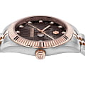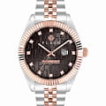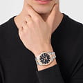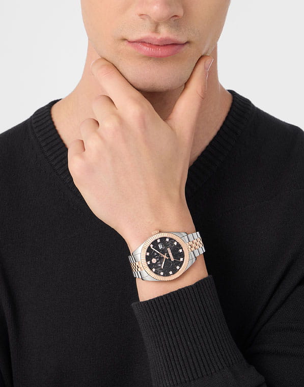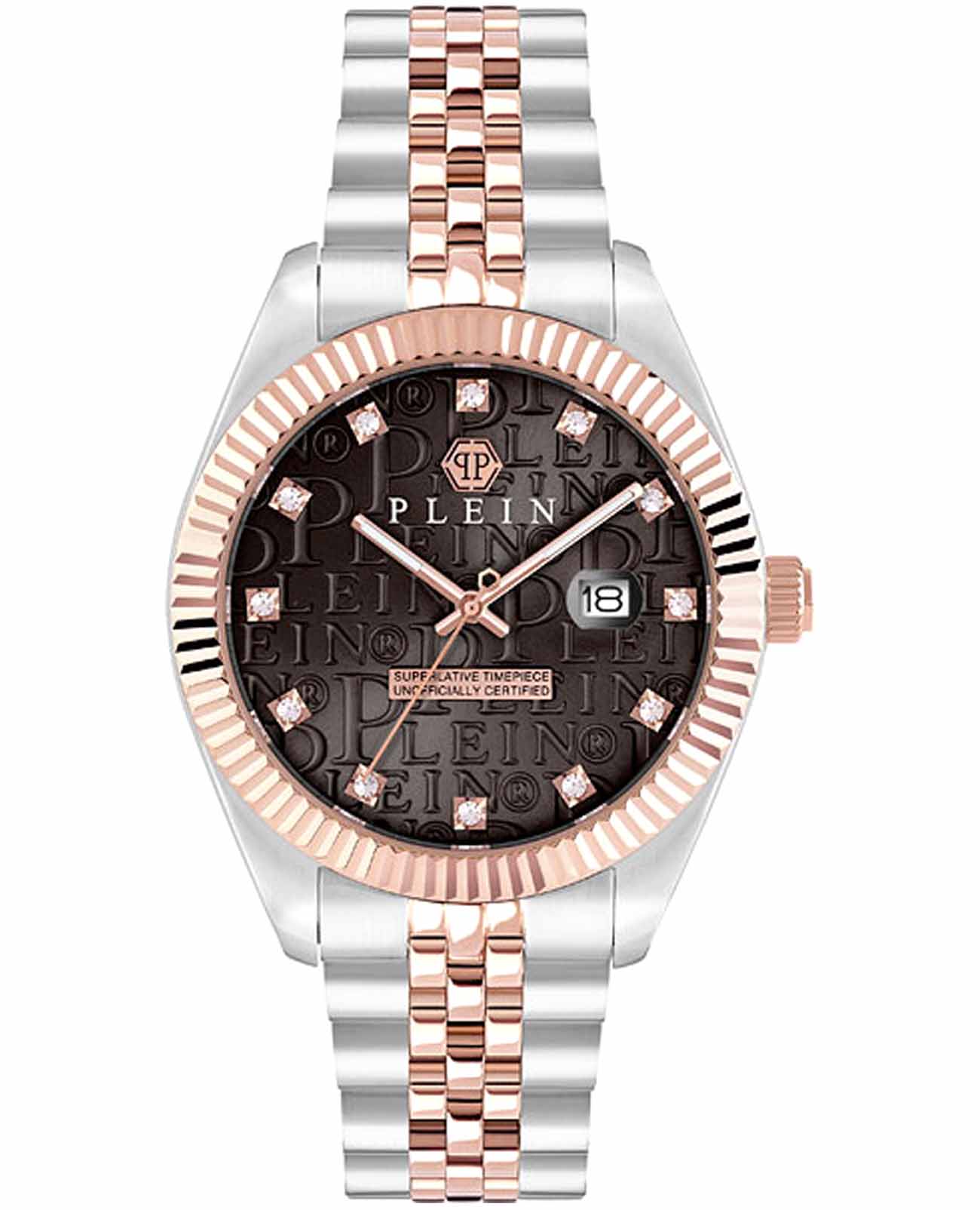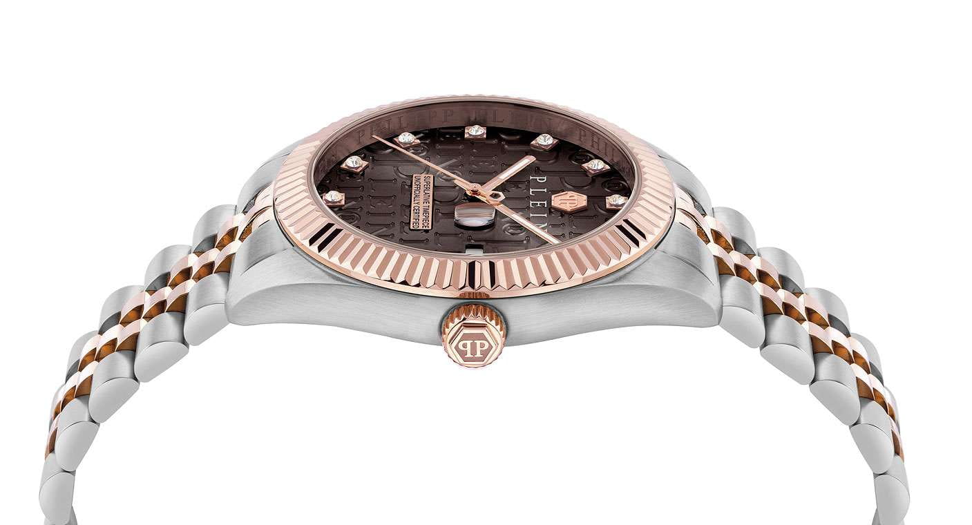 Philipp Plein Date Superlative Gent PWMFA0625 - это дерзкие и бескомпромиссные часы, воплощающие бунтарский дух бренда. Диаметр круглого корпуса из прочной нержавеющей стали равен 41 мм. Стальной браслет на застёжке «бабочка» с кнопкамиЗастёжка "бабочка"Такой вид застёжки дополняется предохранителями, помогающими избежать случайного раскрытия браслета. Обладают изящным исполнением. обеспечивает надёжную фиксацию и комфортное ношение. Метки в виде кристаллов Preciosa. Минеральное стеклоМинеральное стеклоМинеральное стекло представляет собой искусственно выращенный минерал кварца. Такое стекло отличается особой устойчивостью к повреждениям и царапинам. Уступает по некоторым качествам сапфировому стеклу. защищает циферблат от царапин. Люминесцентное покрытиеЛюминесцентное покрытиеПозволяет считывать показания времени в темноте. Производители наносят на стрелки, часовые индексы, безель или поверхность циферблата светонакопительный состав, дающий холодное свечение. стрелок и меток позволит следить за временем даже в полной темноте. БезельБезельВнешний ободок, закрепляющий стекло. В спортивных часах так называется поворотное кольцо с делениями на циферблате, выполняет роль таймера – замеряет отрезки времени на шкале. Неподвижный безель – элемент декора. Однонаправленно вращающийся безель на дайверских часах позволяет фиксировать моменты погружения и выныривания на поверхность. с PVD-покрытиемPVDУльтратонкое покрытие наносится в технике вакуумного напыления, сочетает в себе нитрид титана особой прочности со слоем золота или оксида хрома. Несёт в себе декоративную или защитную функцию.. Граненая заводная головка. Влагозащита: 50 метров, позволит защитить корпус от случайных брызг или капель дождя. Идеальный аксессуар для тех, кто ценит индивидуальность и не боится выделяться из толпы.