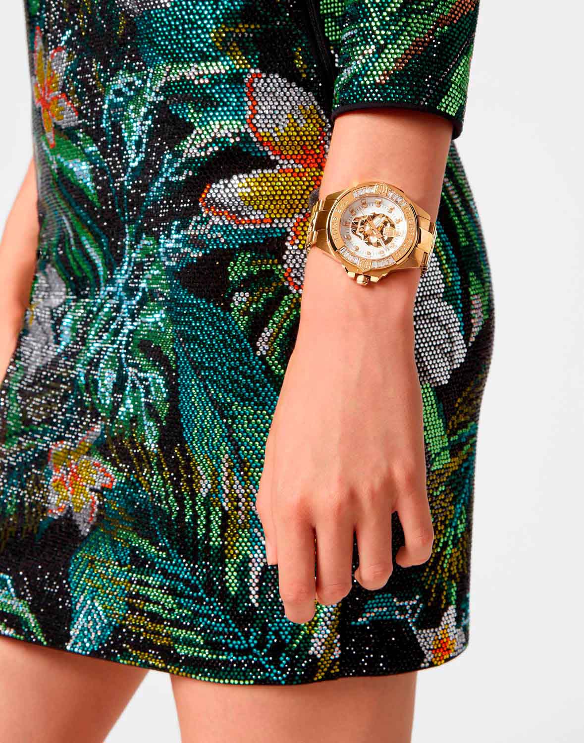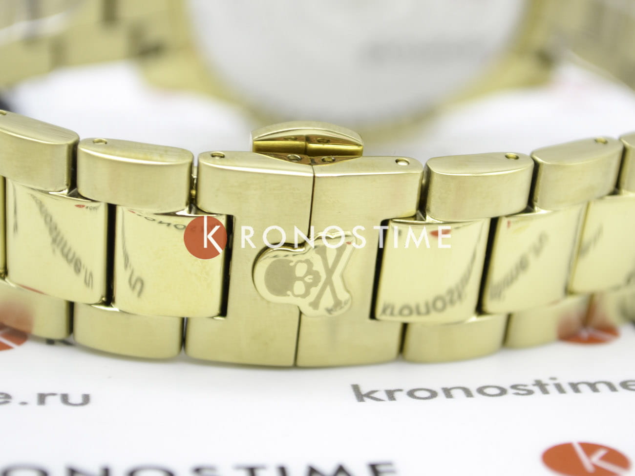 Яркие унисекс часы с минеральным стекломМинеральное стеклоМинеральное стекло представляет собой искусственно выращенный минерал кварца. Такое стекло отличается особой устойчивостью к повреждениям и царапинам. Уступает по некоторым качествам сапфировому стеклу. Philipp Plein The Skull PWNAA0722, кварцевый механизм с высокой точностью. Класс водозащиты: 50 метров, позволит защитить корпус от случайных брызг или капель дождя. Корпус часов изготовлен из стали с IP-покрытиемIP-покрытиеМетод ионного напыления. Демонстрирует повышенную устойчивость к истиранию, окислению и химическим веществам. Под воздействием высокого давления и температуры около 1500°C молекулы металла надёжно соединяются с частицами корпуса часов.. Круглый стальной корпус украшен кристаллами Swarovski. Циферблат с метками в виде точек украшенных кристаллами Swarovski, дополнен трехмерным граненым черепом. Шестигранная заводная головка с защитой. Застёжка бабочка с кнопкамиЗастёжка "бабочка"Такой вид застёжки дополняется предохранителями, помогающими избежать случайного раскрытия браслета. Обладают изящным исполнением. .