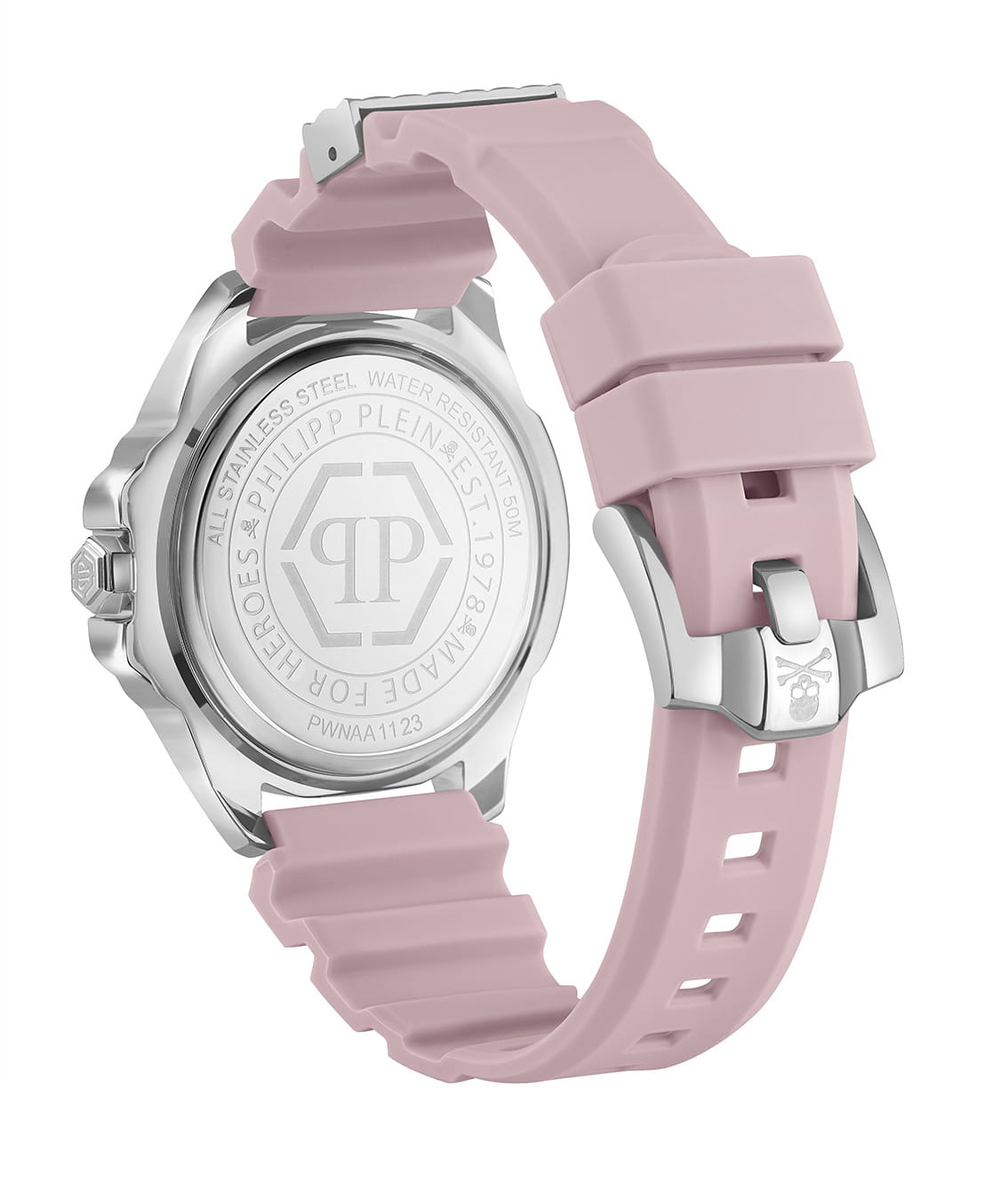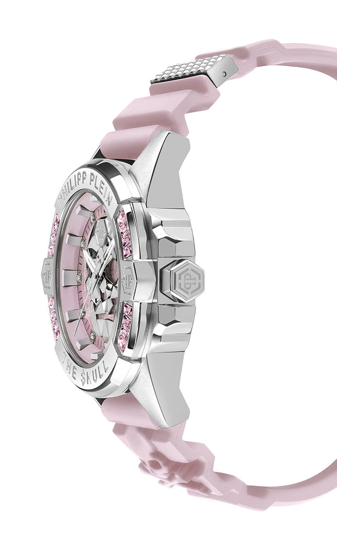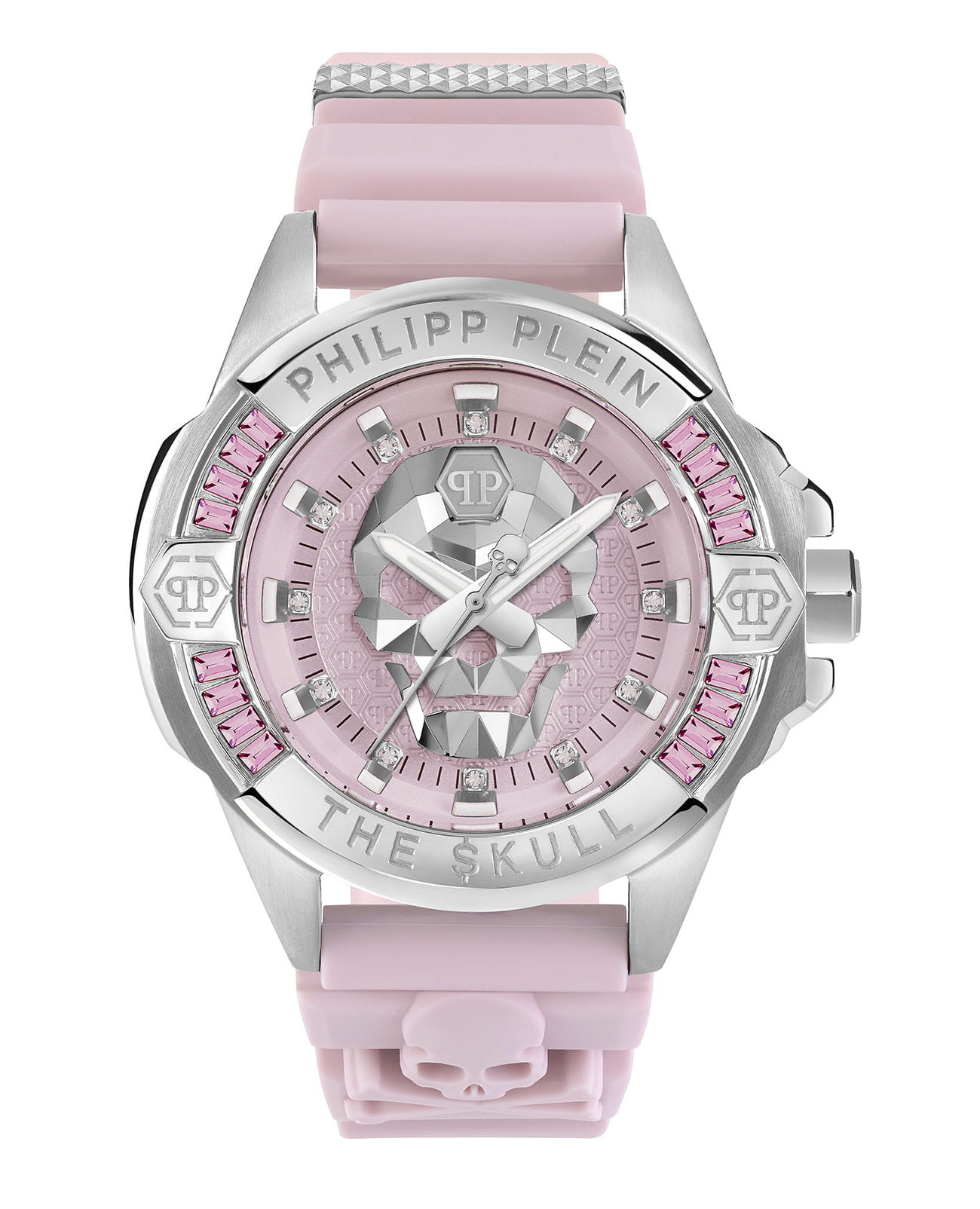 Яркие женские часы с минеральным стекломМинеральное стеклоМинеральное стекло представляет собой искусственно выращенный минерал кварца. Такое стекло отличается особой устойчивостью к повреждениям и царапинам. Уступает по некоторым качествам сапфировому стеклу. Philipp Plein The Skull PWNAA1123, кварцевый механизм с высокой точностью. Класс водозащиты: 50 метров, позволит защитить корпус от случайных брызг или капель дождя. Корпус часов изготовлен из стали с IP-покрытиемIP-покрытиеМетод ионного напыления. Демонстрирует повышенную устойчивость к истиранию, окислению и химическим веществам. Под воздействием высокого давления и температуры около 1500°C молекулы металла надёжно соединяются с частицами корпуса часов.. Круглый стальной корпус украшен кристаллами Swarovski. Циферблат с метками в виде точек украшенных кристаллами Swarovski, дополнен объемным черепом. Шестигранная заводная головка с защитой. Силиконовый ремешок украшен объемным черепом.
