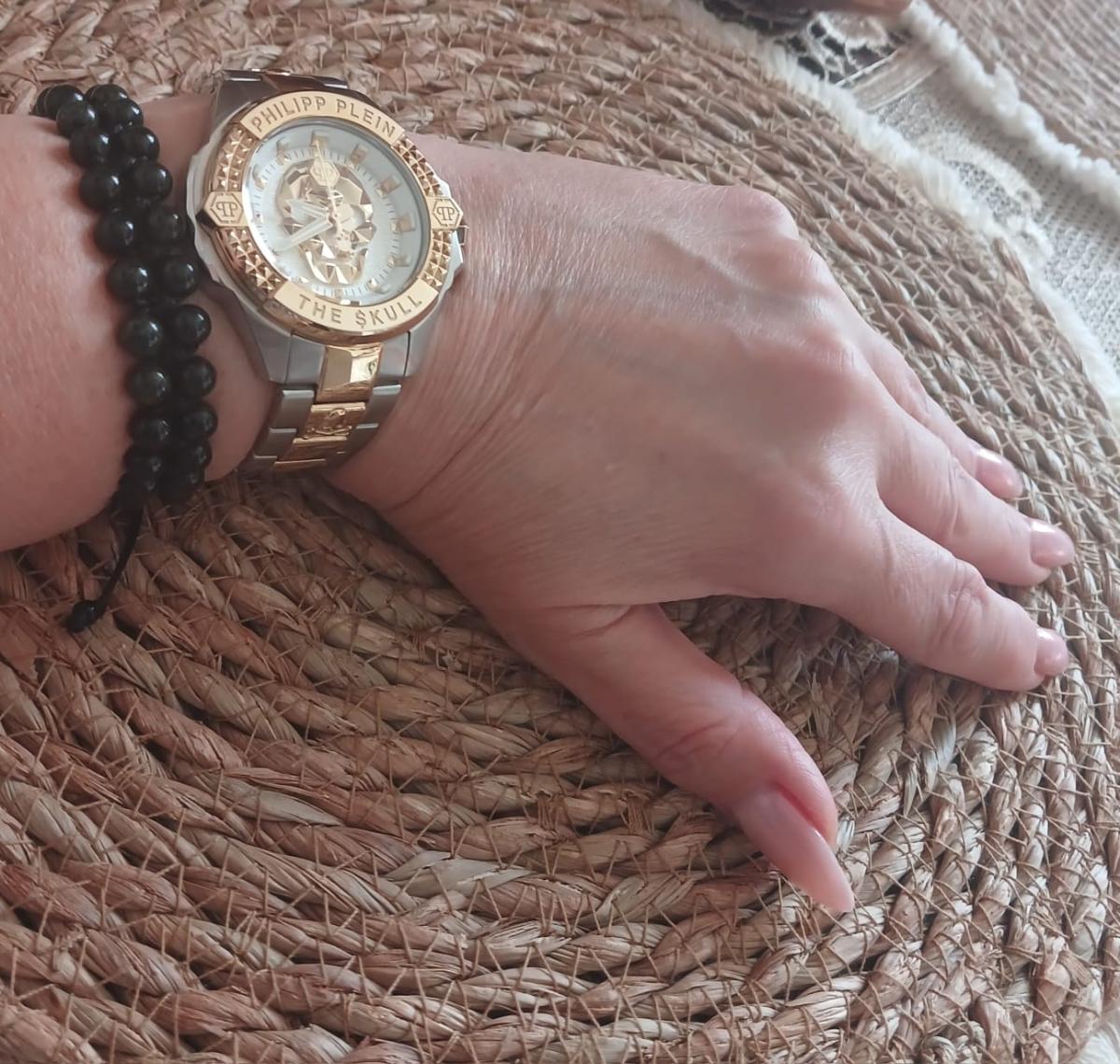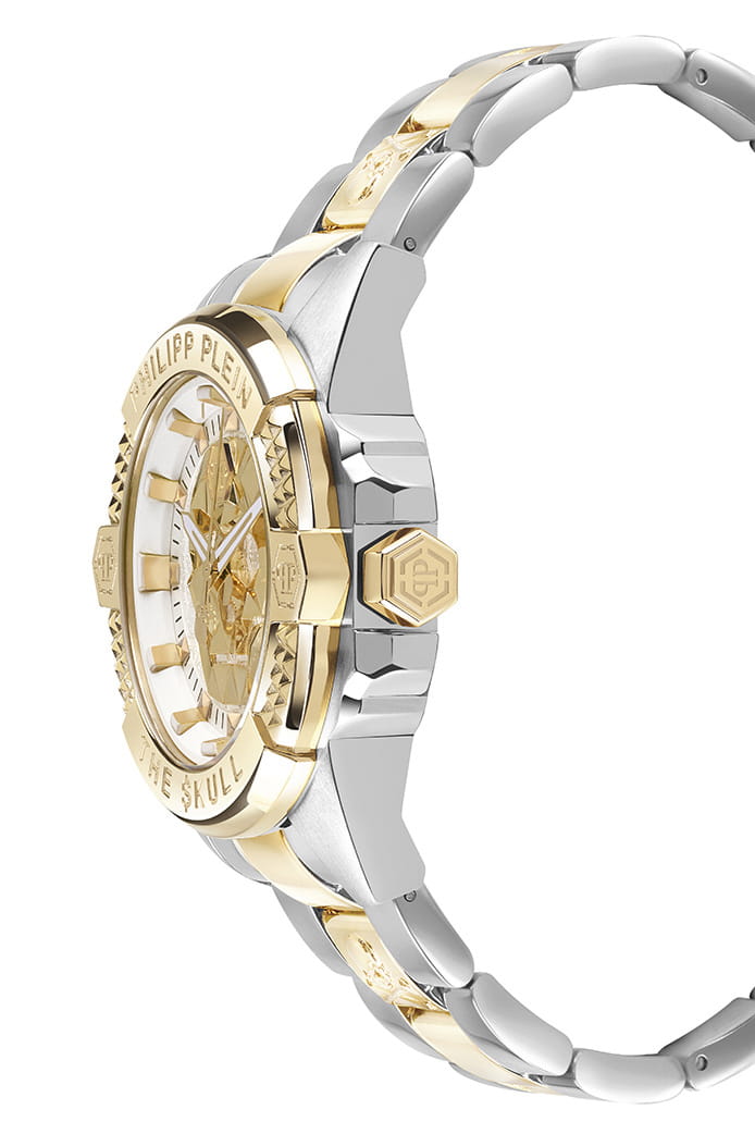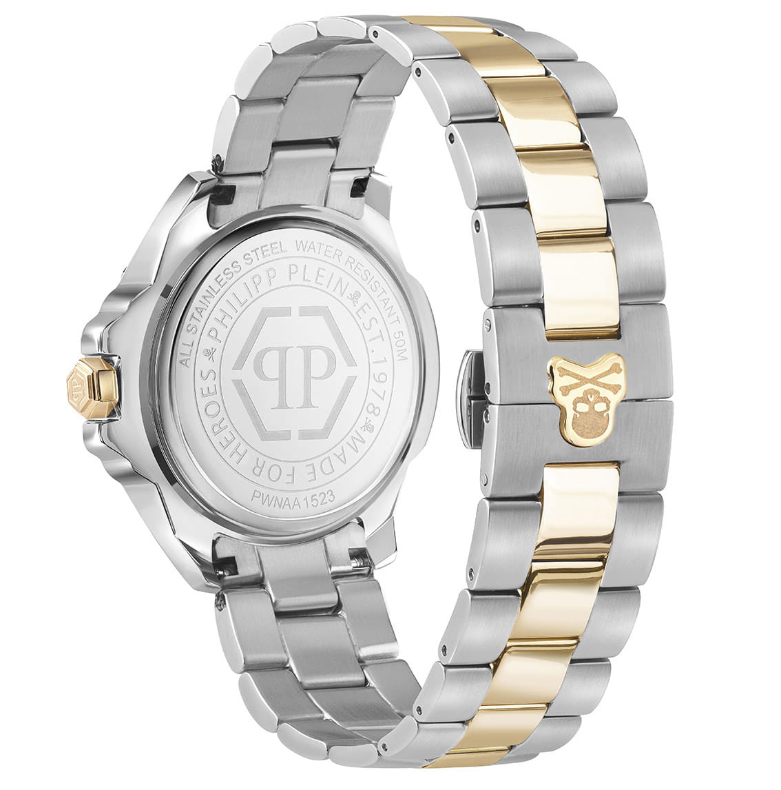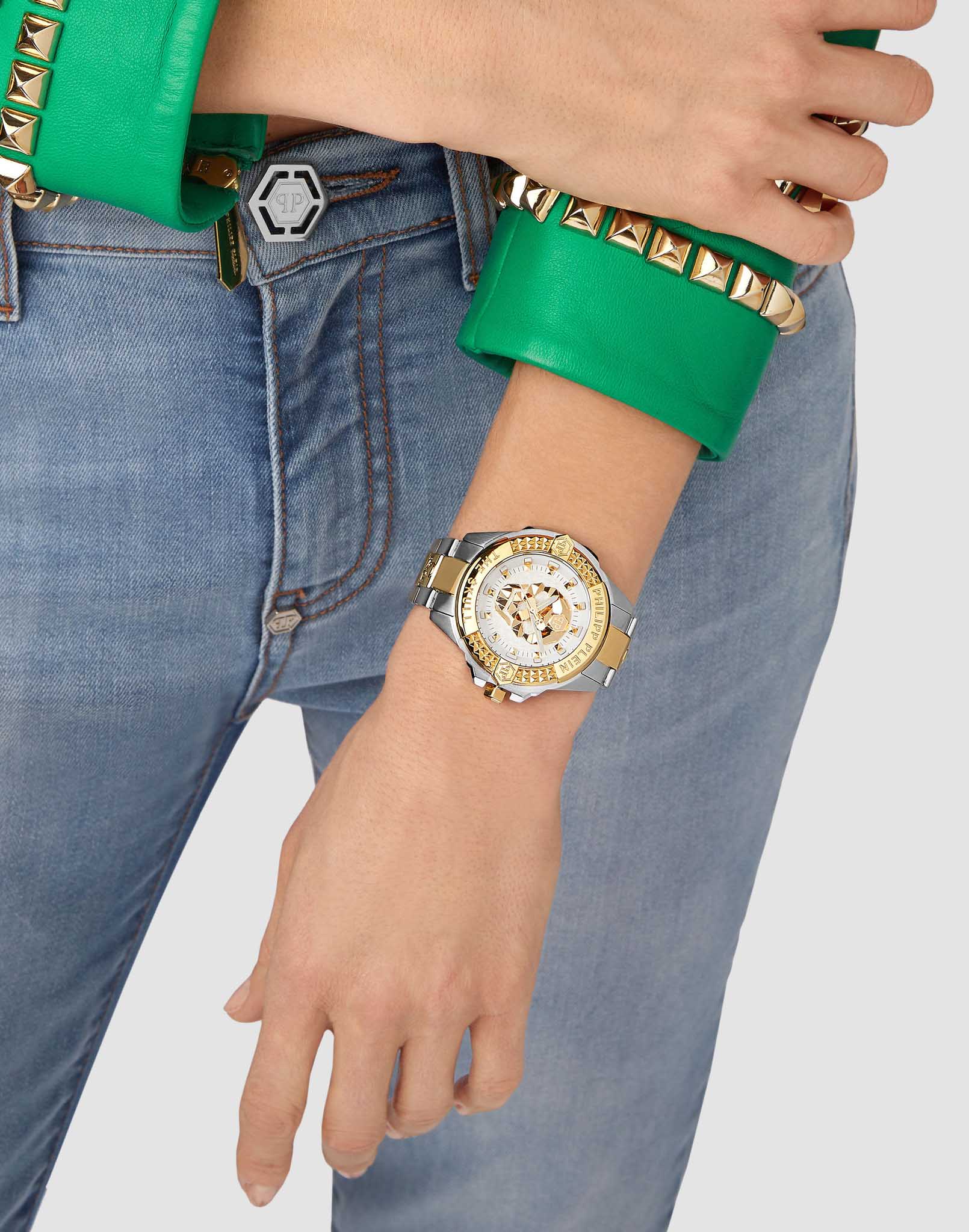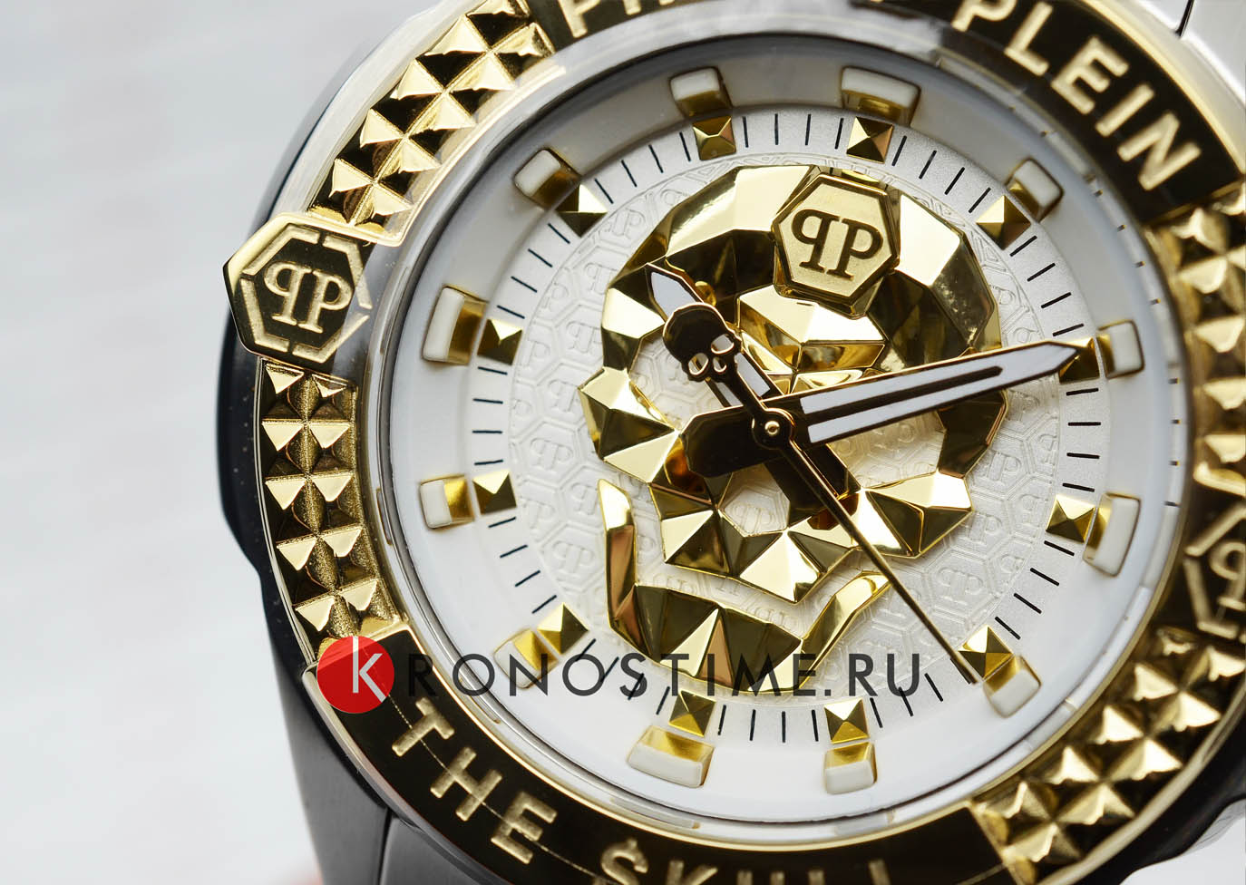 Яркие женские часы с минеральным стекломМинеральное стеклоМинеральное стекло представляет собой искусственно выращенный минерал кварца. Такое стекло отличается особой устойчивостью к повреждениям и царапинам. Уступает по некоторым качествам сапфировому стеклу. Philipp Plein The Skull PWNAA1523, кварцевый механизм с высокой точностью. Класс водозащиты: 50 метров, позволит защитить корпус от случайных брызг или капель дождя. Корпус часов изготовлен из стали с IP-покрытиемIP-покрытиеМетод ионного напыления. Демонстрирует повышенную устойчивость к истиранию, окислению и химическим веществам. Под воздействием высокого давления и температуры около 1500°C молекулы металла надёжно соединяются с частицами корпуса часов.. Циферблат дополнен трехмерным граненым черепом. Шестигранная заводная головка с защитой. Застёжка бабочка с кнопкамиЗастёжка "бабочка"Такой вид застёжки дополняется предохранителями, помогающими избежать случайного раскрытия браслета. Обладают изящным исполнением. .