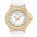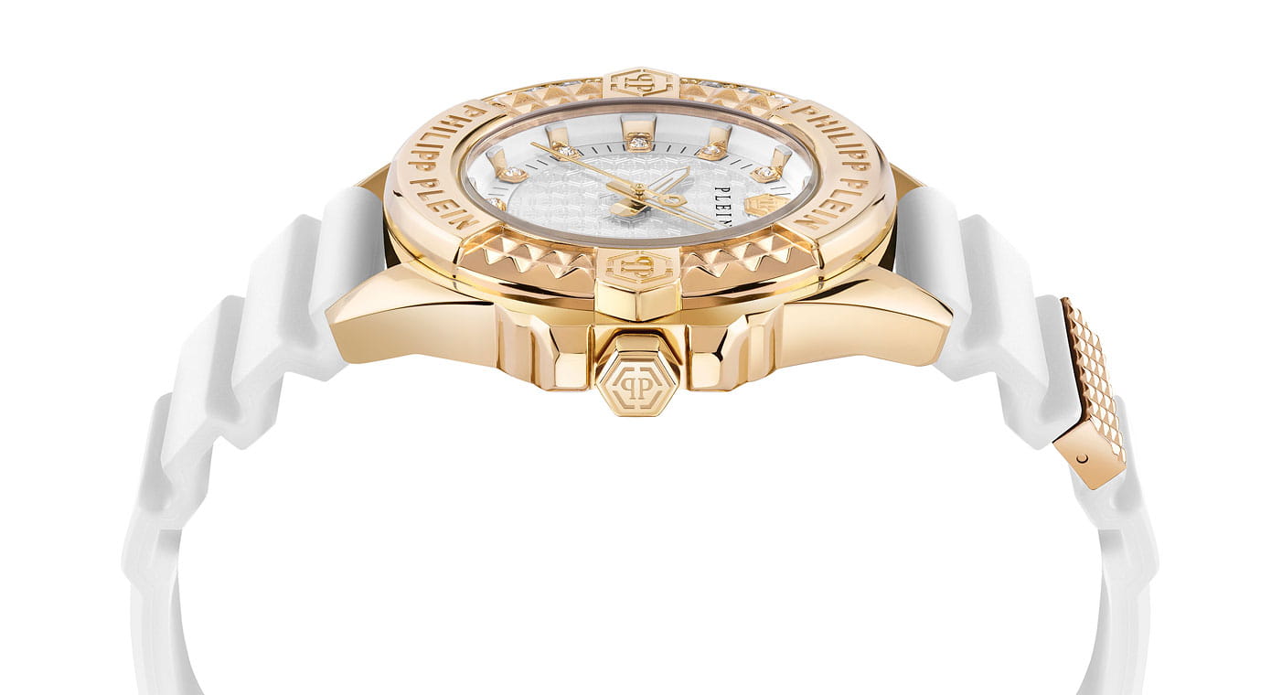 Philipp Plein Plein Majesty PWOFA0125 - дерзкое заявление любви к роскоши и бунтарскому стилю. Диаметр круглого корпуса из прочной нержавеющей стали с PVD-покрытиемPVDУльтратонкое покрытие наносится в технике вакуумного напыления, сочетает в себе нитрид титана особой прочности со слоем золота или оксида хрома. Несёт в себе декоративную или защитную функцию. равен 38 мм. Силиконовый ремешок на стандартной застёжке обеспечивает надёжную фиксацию и комфортное ношение. Метки в виде кристаллов Preciosa. Минеральное стеклоМинеральное стеклоМинеральное стекло представляет собой искусственно выращенный минерал кварца. Такое стекло отличается особой устойчивостью к повреждениям и царапинам. Уступает по некоторым качествам сапфировому стеклу. защищает циферблат от царапин. Люминесцентное покрытиеЛюминесцентное покрытиеПозволяет считывать показания времени в темноте. Производители наносят на стрелки, часовые индексы, безель или поверхность циферблата светонакопительный состав, дающий холодное свечение. стрелок и меток позволит следить за временем даже в полной темноте. Влагозащита: 50 метров, позволит защитить корпус от случайных брызг или капель дождя. Идеальный аксессуар для тех, кто ценит индивидуальность и не боится выделяться из толпы.