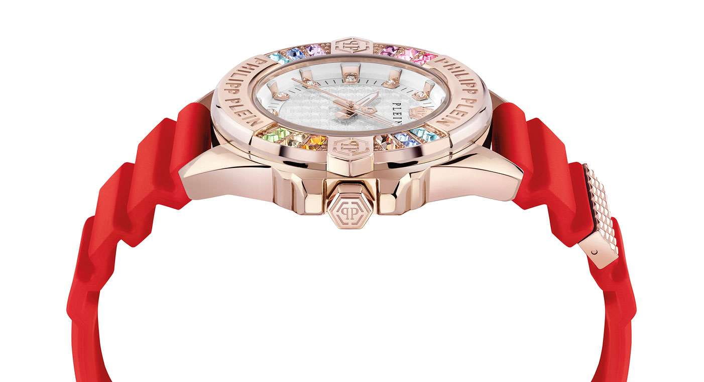 Philipp Plein Plein Majesty PWOFA0325 - дерзкое заявление любви к роскоши и бунтарскому стилю. Диаметр круглого корпуса из прочной нержавеющей стали с PVD-покрытиемPVDУльтратонкое покрытие наносится в технике вакуумного напыления, сочетает в себе нитрид титана особой прочности со слоем золота или оксида хрома. Несёт в себе декоративную или защитную функцию. равен 38 мм. Силиконовый ремешок на стандартной застёжке обеспечивает надёжную фиксацию и комфортное ношение. Метки в виде кристаллов Preciosa. Минеральное стеклоМинеральное стеклоМинеральное стекло представляет собой искусственно выращенный минерал кварца. Такое стекло отличается особой устойчивостью к повреждениям и царапинам. Уступает по некоторым качествам сапфировому стеклу. защищает циферблат от царапин. Люминесцентное покрытиеЛюминесцентное покрытиеПозволяет считывать показания времени в темноте. Производители наносят на стрелки, часовые индексы, безель или поверхность циферблата светонакопительный состав, дающий холодное свечение. стрелок и меток позволит следить за временем даже в полной темноте. БезельБезельВнешний ободок, закрепляющий стекло. В спортивных часах так называется поворотное кольцо с делениями на циферблате, выполняет роль таймера – замеряет отрезки времени на шкале. Неподвижный безель – элемент декора. Однонаправленно вращающийся безель на дайверских часах позволяет фиксировать моменты погружения и выныривания на поверхность. инкрустирован кристаллами. Влагозащита: 50 метров, позволит защитить корпус от случайных брызг или капель дождя. Идеальный аксессуар для тех, кто ценит индивидуальность и не боится выделяться из толпы.