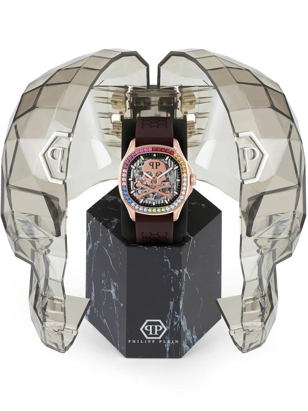 Яркие мужские часы с минеральным стекломМинеральное стеклоМинеральное стекло представляет собой искусственно выращенный минерал кварца. Такое стекло отличается особой устойчивостью к повреждениям и царапинам. Уступает по некоторым качествам сапфировому стеклу. Philipp Plein PWRAA0623, механический механизм. Класс водозащиты: 50 метров, позволит защитить корпус от случайных брызг или капель дождя. Корпус часов изготовлен из стали и украшен кристаллами. Стрелки и метки с люминесцентным покрытиемЛюминесцентное покрытиеПозволяет считывать показания времени в темноте. Производители наносят на стрелки, часовые индексы, безель или поверхность циферблата светонакопительный состав, дающий холодное свечение.. Скелетонизированные. Часы с механизмом, из которого удалён весь «лишний» металл, с прозрачными циферблатом и задней крышкой,
