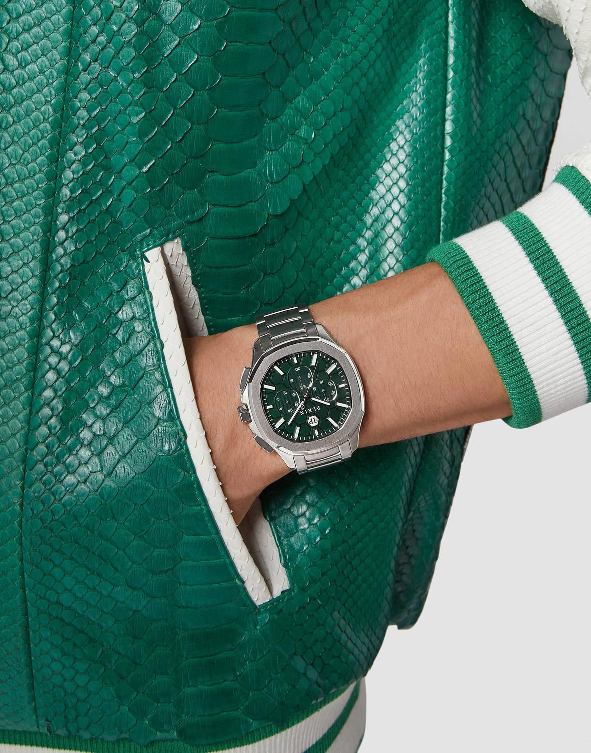 Яркие мужские часы-хронографХронографФункция позволяет измерять отрезки времени с особой точностью: часы, минуты, секунды. Верным признаком хронографа является наличие на циферблате 3 дополнительных окошек-счётчиков. с секундомеромСекундомерСекундоме́р — прибор, способный измерять интервалы времени с точностью до долей секунды. Philipp Plein PWSAA0223, кварцевый механизм с высокой точностью. Класс водозащиты: 50 метров, позволит защитить корпус от случайных брызг или капель дождя. Корпус часов изготовлен из стали. Стрелки и метки с люминесцентным покрытиемЛюминесцентное покрытиеПозволяет считывать показания времени в темноте. Производители наносят на стрелки, часовые индексы, безель или поверхность циферблата светонакопительный состав, дающий холодное свечение.. Застёжка бабочка с кнопкамиЗастёжка "бабочка"Такой вид застёжки дополняется предохранителями, помогающими избежать случайного раскрытия браслета. Обладают изящным исполнением.
