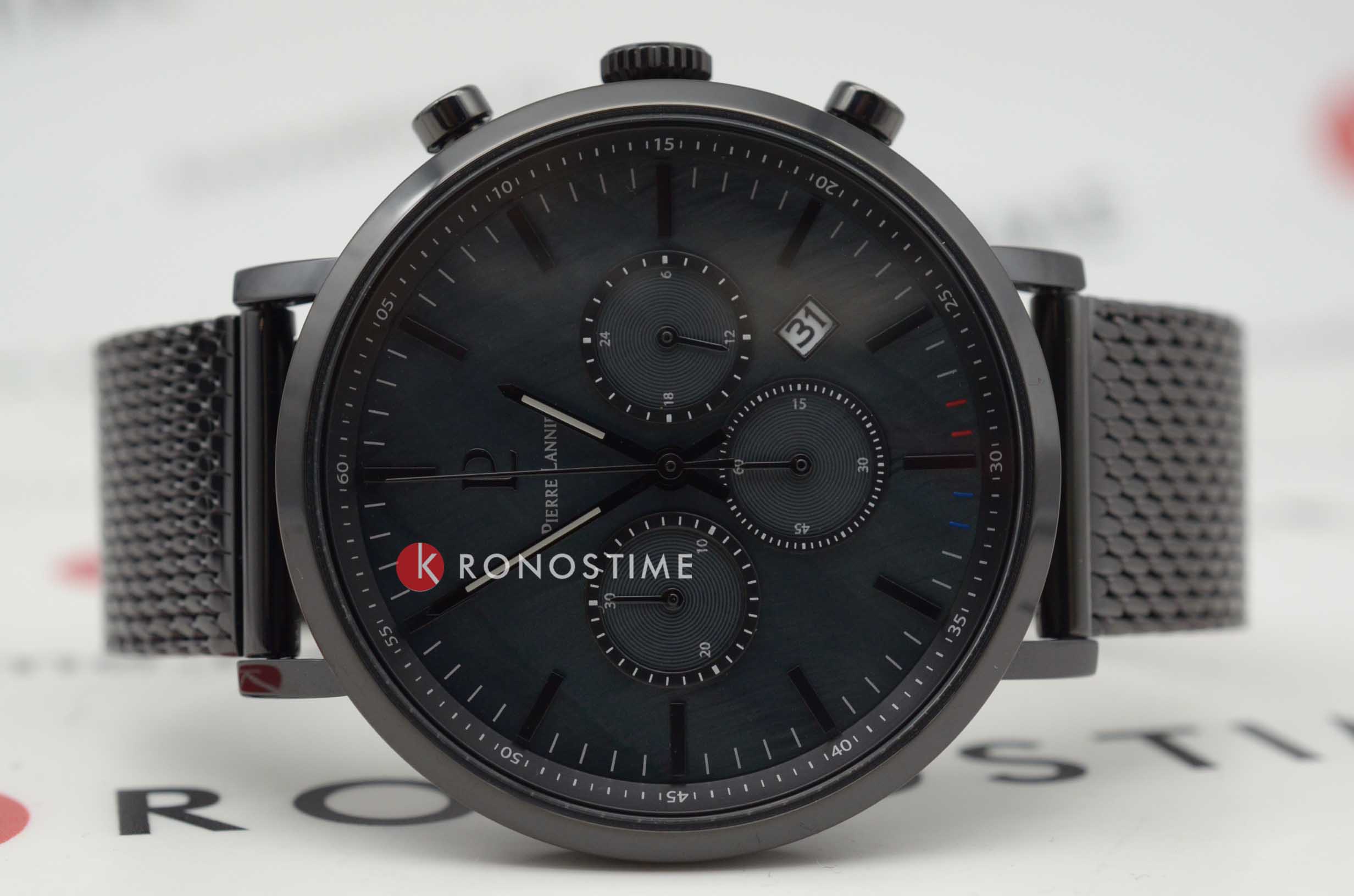 Мужские кварцевые часы Pierre Lannier Baron 220H439. Часы хронографХронографФункция позволяет измерять отрезки времени с особой точностью: часы, минуты, секунды. Верным признаком хронографа является наличие на циферблате 3 дополнительных окошек-счётчиков. с секундомеромСекундомерСекундоме́р — прибор, способный измерять интервалы времени с точностью до долей секунды.. Минеральное стеклоМинеральное стеклоМинеральное стекло представляет собой искусственно выращенный минерал кварца. Такое стекло отличается особой устойчивостью к повреждениям и царапинам. Уступает по некоторым качествам сапфировому стеклу. устойчивое к мелким механическим повреждениям. Центральные часовая и минутная стрелки, секундная стрелка вынесена на малый циферблат. Апертура даты между 4 и 5 часами. 12/24х часовой формат времени. Секундомер. Черный перламутровый циферблат. Круглый корпус выполнен из нержавеющей стали с черным IP-покрытиемIP-покрытиеМетод ионного напыления. Демонстрирует повышенную устойчивость к истиранию, окислению и химическим веществам. Под воздействием высокого давления и температуры около 1500°C молекулы металла надёжно соединяются с частицами корпуса часов.. Диаметр корпуса составляет 43 мм, толщина 10,6 мм. Стальной браслет с покрытием выполнен в технике миланского плетения, раскладная застёжкаРаскладная застёжкаТакой тип застёжки используется только на браслетах из металла. Она никогда не раскрывается полностью, происходит разделение на 2 и более частей. Раскладывающая застёжка снизит вероятность потери часов к минимуму.. Водостойкость WR 50 (мытье рук, дождь).