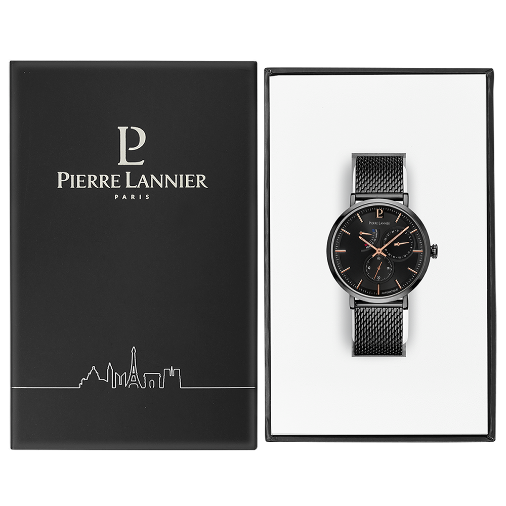 Мужские механические часы с автоподзаводом Pierre Lannier Evidence 328D438. Минеральное стеклоМинеральное стеклоМинеральное стекло представляет собой искусственно выращенный минерал кварца. Такое стекло отличается особой устойчивостью к повреждениям и царапинам. Уступает по некоторым качествам сапфировому стеклу. устойчивое к мелким механическим повреждениям. Центральные часовая и минутная стрелки, секундная стрелка вынесена на малый циферблат. Отображение даты в малом циферблате. Ретроградный индикатор запаса хода. Корпус и браслет выполнен из нержавеющей стали с IP-покрытиемIP-покрытиеМетод ионного напыления. Демонстрирует повышенную устойчивость к истиранию, окислению и химическим веществам. Под воздействием высокого давления и температуры около 1500°C молекулы металла надёжно соединяются с частицами корпуса часов.. Водостойкость: 50 метров, позволит защитить корпус от случайных брызг или капель дождя. Браслет миланского плетения с раскладной застёжкойРаскладная застёжкаТакой тип застёжки используется только на браслетах из металла. Она никогда не раскрывается полностью, происходит разделение на 2 и более частей. Раскладывающая застёжка снизит вероятность потери часов к минимуму.. Стрелки с люминесцентным покрытиемЛюминесцентное покрытиеПозволяет считывать показания времени в темноте. Производители наносят на стрелки, часовые индексы, безель или поверхность циферблата светонакопительный состав, дающий холодное свечение..