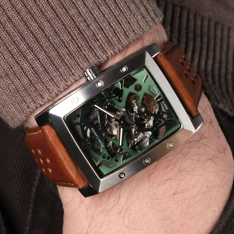 Мужские механические часы Pierre Lannier Hector 342A174 представляют собой уникальное сочетание винтажного стиля и современных технологий с корпусом "тонно" размером 36×42 мм из нержавеющей стали и прозрачным зеленым скелетонизированным циферблатом, раскрывающим работу автоматического механизма. Модель оснащена автоматическим механизмом с ручным подзаводом и 40-часовым запасом хода, демонстрирующим точное движение стрелок через прозрачный циферблат. Защиту обеспечивает устойчивое к царапинам минеральное стеклоМинеральное стеклоМинеральное стекло представляет собой искусственно выращенный минерал кварца. Такое стекло отличается особой устойчивостью к повреждениям и царапинам. Уступает по некоторым качествам сапфировому стеклу., а водонепроницаемость WR50 (5 бар) позволяет использовать часы при плавании в бассейне. Кожаный ремешок из коричневой кожи махагони с перфорацией шириной 26 мм и классической пряжкой добавляет ретро-характер и легко заменяется на другие ремешки коллекции. Особенности включают матово-полированную отделку корпуса, серебристые стрелки и индексы на зеленом циферблате, а также прозрачную заднюю крышку, демонстрирующую механизм.
