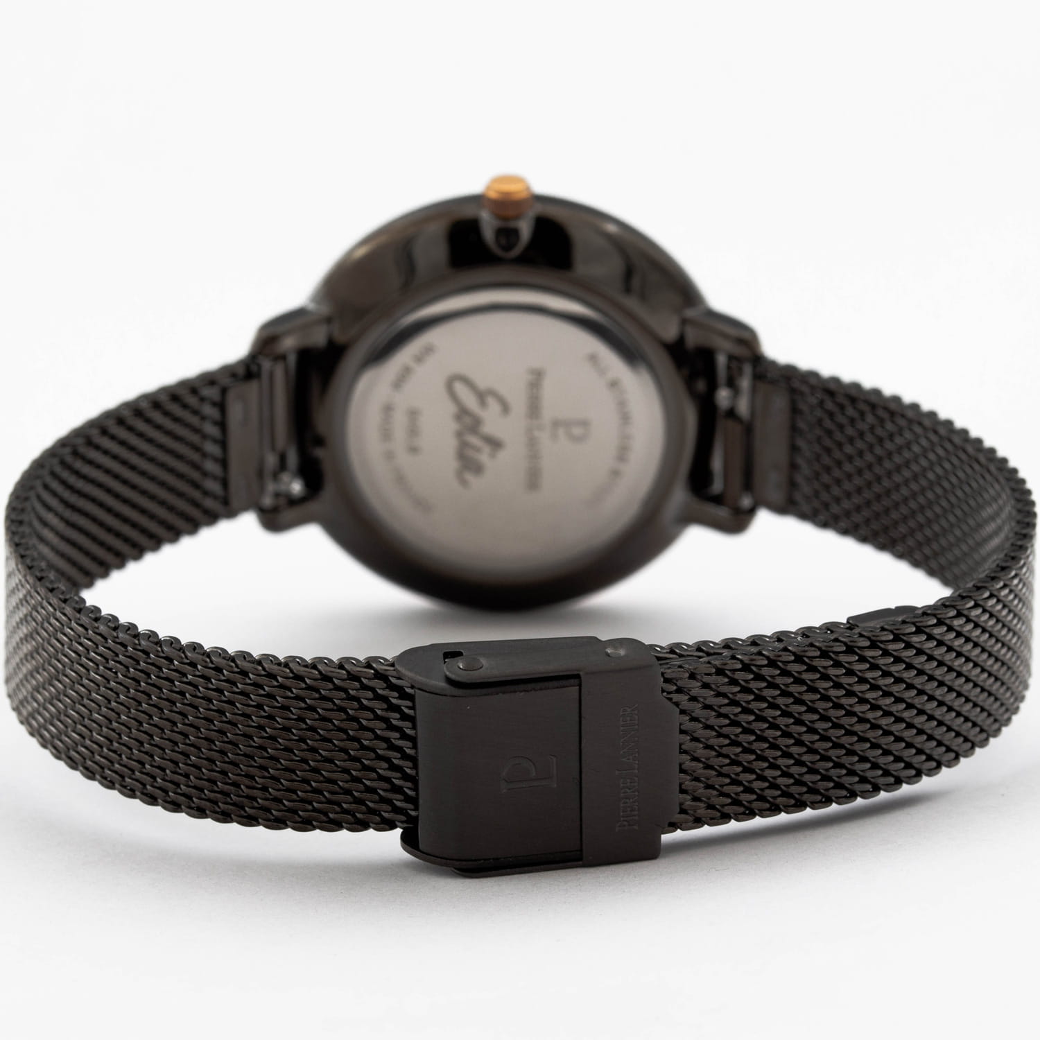 Женские кварцевые часы Pierre Lannier Eolia 358G988. Минеральное стеклоМинеральное стеклоМинеральное стекло представляет собой искусственно выращенный минерал кварца. Такое стекло отличается особой устойчивостью к повреждениям и царапинам. Уступает по некоторым качествам сапфировому стеклу. устойчивое к мелким механическим повреждениям. Центральные часовая и минутная стрелки. Черный циферблат с часовыми индексами в виде точек. Круглый корпус выполнен из нержавеющей стали с IP-покрытиемIP-покрытиеМетод ионного напыления. Демонстрирует повышенную устойчивость к истиранию, окислению и химическим веществам. Под воздействием высокого давления и температуры около 1500°C молекулы металла надёжно соединяются с частицами корпуса часов. цвета розового золота. Диаметр корпуса составляет 33 мм. Стальной браслет с IP-покрытиемIP-покрытиеМетод ионного напыления. Демонстрирует повышенную устойчивость к истиранию, окислению и химическим веществам. Под воздействием высокого давления и температуры около 1500°C молекулы металла надёжно соединяются с частицами корпуса часов., раскладная застёжкаРаскладная застёжкаТакой тип застёжки используется только на браслетах из металла. Она никогда не раскрывается полностью, происходит разделение на 2 и более частей. Раскладывающая застёжка снизит вероятность потери часов к минимуму.. Водостойкость WR 30. Часы украшены кристаллами. Браслет в комплекте.