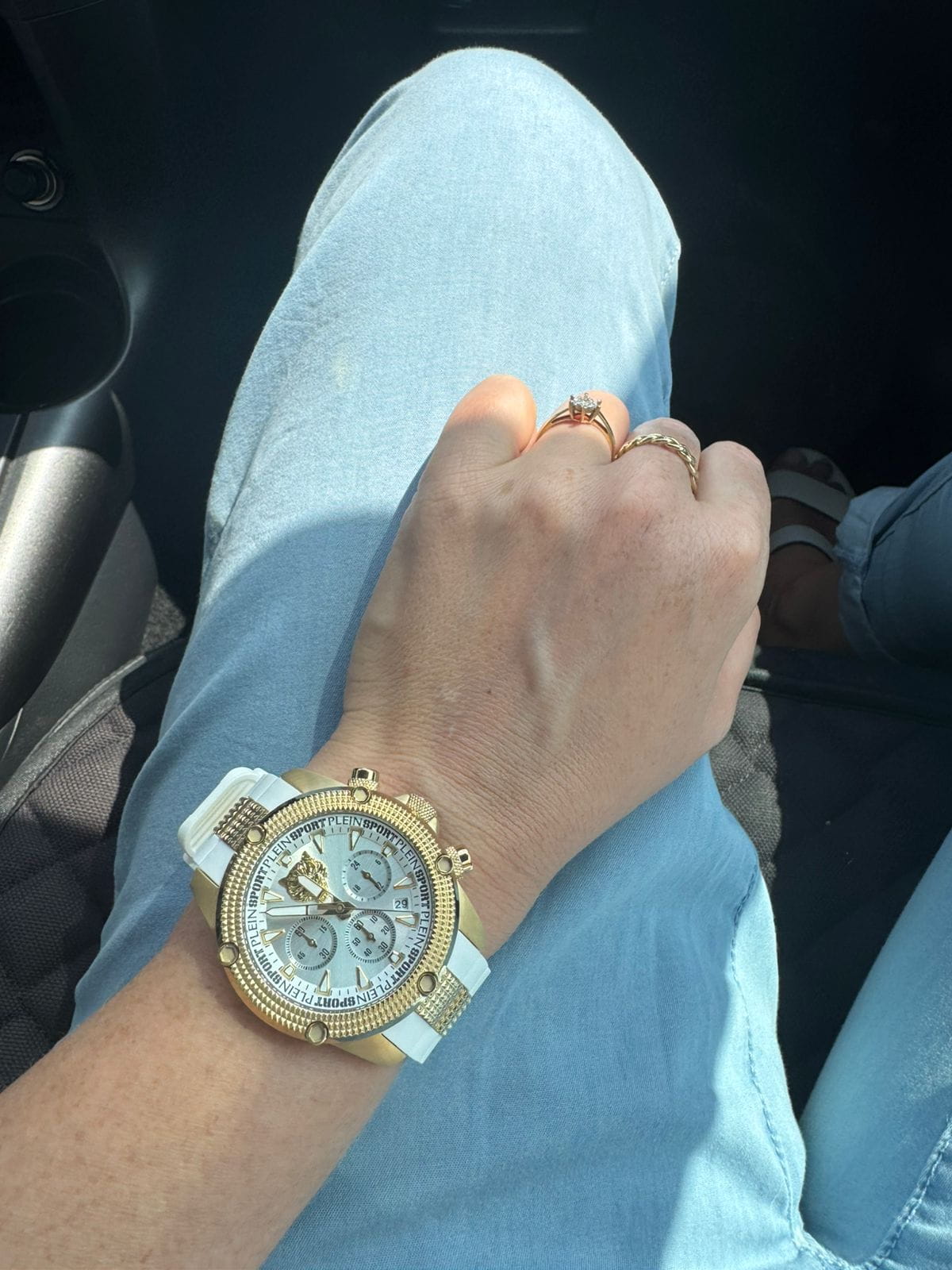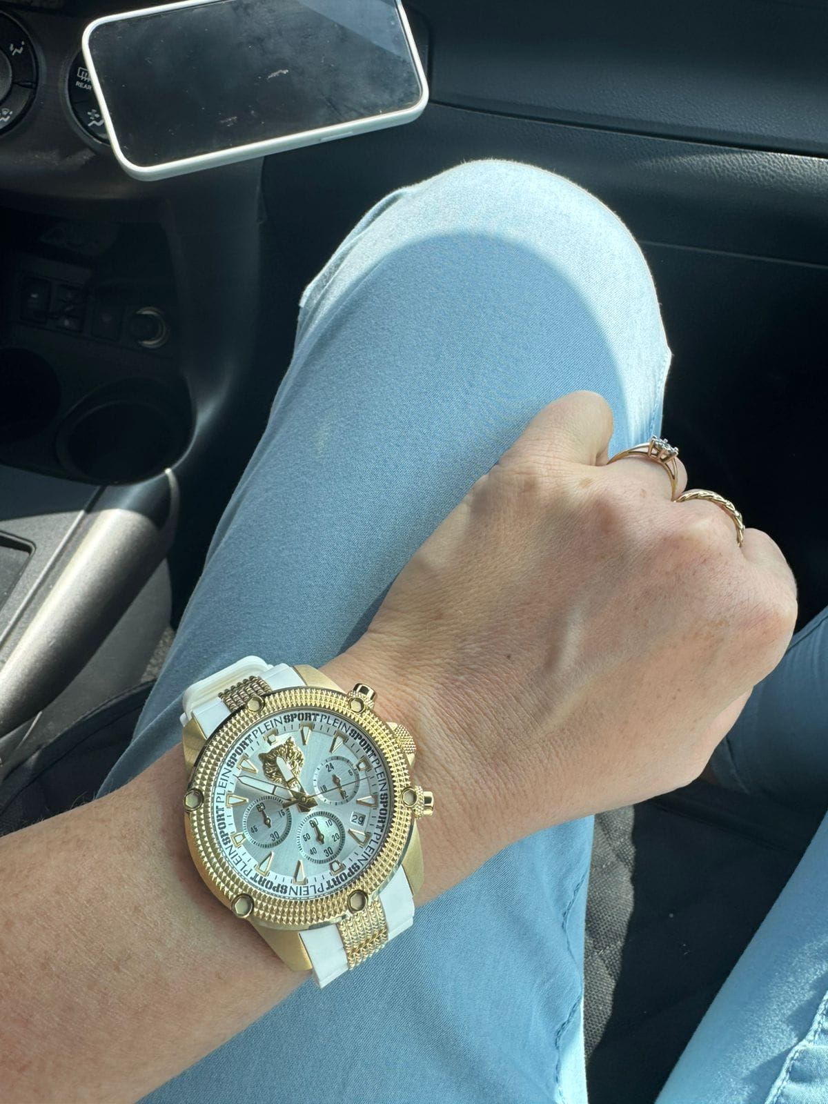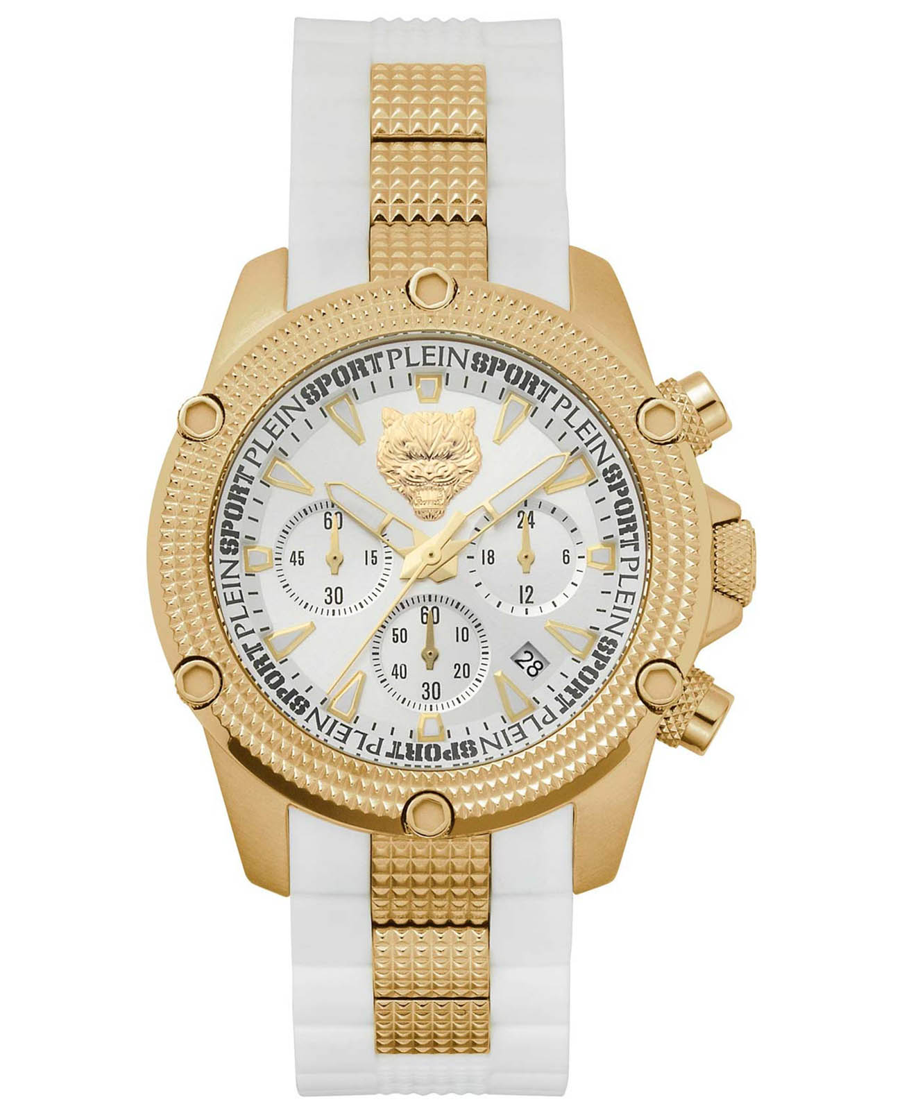 Немецкие кварцевые унисекс часы-хронографХронографФункция позволяет измерять отрезки времени с особой точностью: часы, минуты, секунды. Верным признаком хронографа является наличие на циферблате 3 дополнительных окошек-счётчиков. с секундомеромСекундомерСекундоме́р — прибор, способный измерять интервалы времени с точностью до долей секунды. Plein Sport Hurricane PSDBA0423, кварцевый механизм с высокой точностью. Класс водозащиты: 50 метров, позволит защитить корпус от случайных брызг или капель дождя. Корпус выполнен из стали с IP-покрытиемIP-покрытиеМетод ионного напыления. Демонстрирует повышенную устойчивость к истиранию, окислению и химическим веществам. Под воздействием высокого давления и температуры около 1500°C молекулы металла надёжно соединяются с частицами корпуса часов.. Стрелки и метки с люминесцентным покрытиемЛюминесцентное покрытиеПозволяет считывать показания времени в темноте. Производители наносят на стрелки, часовые индексы, безель или поверхность циферблата светонакопительный состав, дающий холодное свечение.. Силиконовый браслет на стандартной застежке. Минеральное стеклоМинеральное стеклоМинеральное стекло представляет собой искусственно выращенный минерал кварца. Такое стекло отличается особой устойчивостью к повреждениям и царапинам. Уступает по некоторым качествам сапфировому стеклу. устойчивое к мелким механическим повреждениям. Окошко даты находится в положении между 4 и 5 часов.