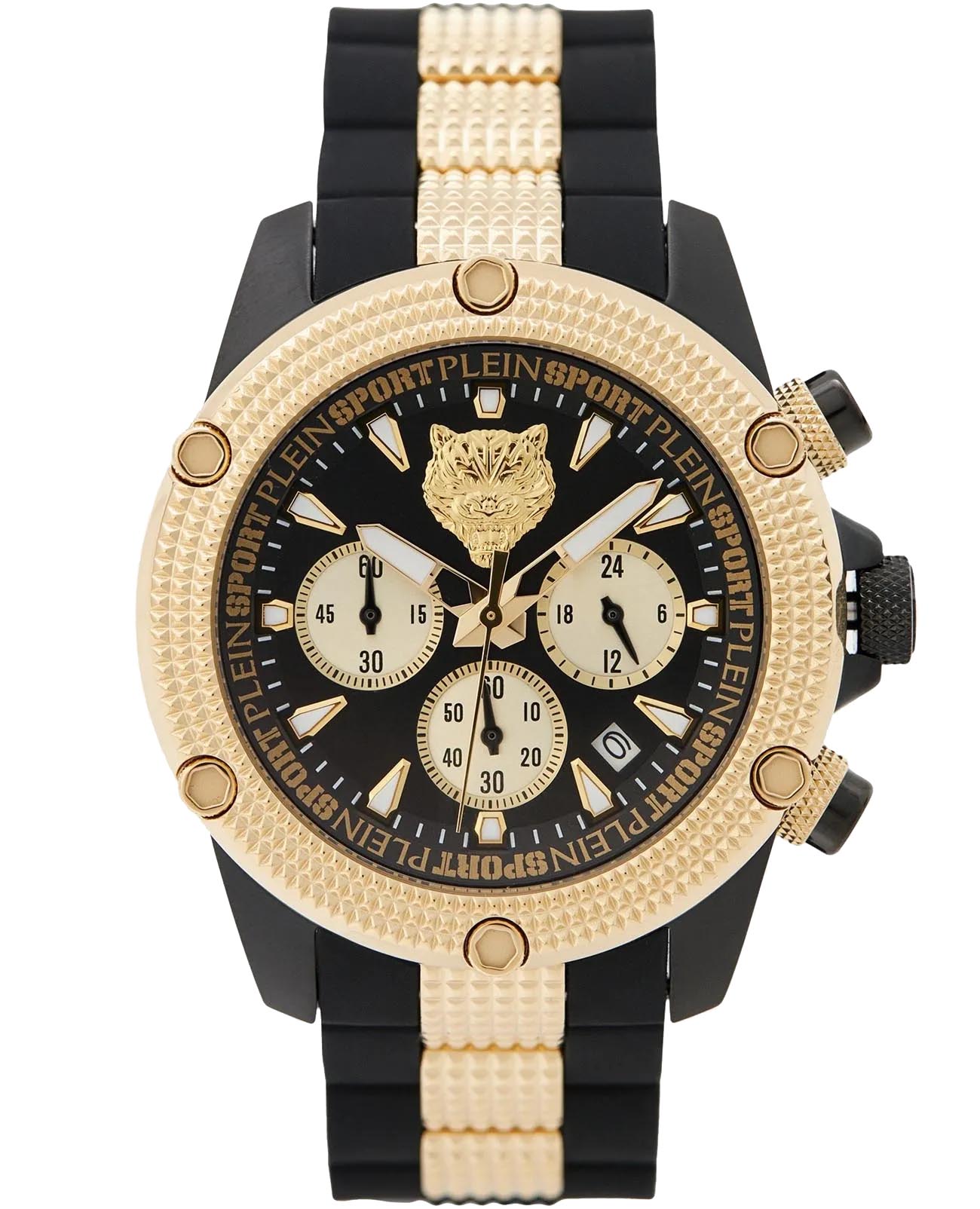 Немецкие кварцевые унисекс часы-хронографХронографФункция позволяет измерять отрезки времени с особой точностью: часы, минуты, секунды. Верным признаком хронографа является наличие на циферблате 3 дополнительных окошек-счётчиков. с секундомеромСекундомерСекундоме́р — прибор, способный измерять интервалы времени с точностью до долей секунды. Plein Sport Hurricane PSDBA0523, кварцевый механизм с высокой точностью. Класс водозащиты: 50 метров, позволит защитить корпус от случайных брызг или капель дождя. Корпус и безельБезельВнешний ободок, закрепляющий стекло. В спортивных часах так называется поворотное кольцо с делениями на циферблате, выполняет роль таймера – замеряет отрезки времени на шкале. Неподвижный безель – элемент декора. Однонаправленно вращающийся безель на дайверских часах позволяет фиксировать моменты погружения и выныривания на поверхность. выполнены из стали с IP-покрытиемIP-покрытиеМетод ионного напыления. Демонстрирует повышенную устойчивость к истиранию, окислению и химическим веществам. Под воздействием высокого давления и температуры около 1500°C молекулы металла надёжно соединяются с частицами корпуса часов.. Стрелки и метки с люминесцентным покрытиемЛюминесцентное покрытиеПозволяет считывать показания времени в темноте. Производители наносят на стрелки, часовые индексы, безель или поверхность циферблата светонакопительный состав, дающий холодное свечение.. Браслет из стали и силикона на стандартной застежке. Минеральное стеклоМинеральное стеклоМинеральное стекло представляет собой искусственно выращенный минерал кварца. Такое стекло отличается особой устойчивостью к повреждениям и царапинам. Уступает по некоторым качествам сапфировому стеклу. устойчивое к мелким механическим повреждениям. Окошко даты находится в положении между 4 и 5 часов.