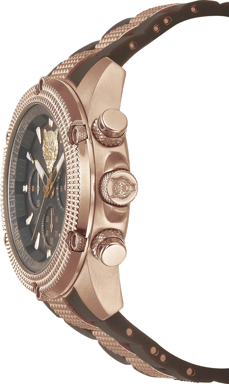Немецкие кварцевые унисекс часы-хронографХронографФункция позволяет измерять отрезки времени с особой точностью: часы, минуты, секунды. Верным признаком хронографа является наличие на циферблате 3 дополнительных окошек-счётчиков. с секундомеромСекундомерСекундоме́р — прибор, способный измерять интервалы времени с точностью до долей секунды. Plein Sport Hurricane PSDBA0623, кварцевый механизм с высокой точностью. Класс водозащиты: 50 метров, позволит защитить корпус от случайных брызг или капель дождя. Корпус и безельБезельВнешний ободок, закрепляющий стекло. В спортивных часах так называется поворотное кольцо с делениями на циферблате, выполняет роль таймера – замеряет отрезки времени на шкале. Неподвижный безель – элемент декора. Однонаправленно вращающийся безель на дайверских часах позволяет фиксировать моменты погружения и выныривания на поверхность. выполнены из стали с IP-покрытиемIP-покрытиеМетод ионного напыления. Демонстрирует повышенную устойчивость к истиранию, окислению и химическим веществам. Под воздействием высокого давления и температуры около 1500°C молекулы металла надёжно соединяются с частицами корпуса часов.. Стрелки и метки с люминесцентным покрытиемЛюминесцентное покрытиеПозволяет считывать показания времени в темноте. Производители наносят на стрелки, часовые индексы, безель или поверхность циферблата светонакопительный состав, дающий холодное свечение.. Браслет из стали и силикона на стандартной застежке. Минеральное стеклоМинеральное стеклоМинеральное стекло представляет собой искусственно выращенный минерал кварца. Такое стекло отличается особой устойчивостью к повреждениям и царапинам. Уступает по некоторым качествам сапфировому стеклу. устойчивое к мелким механическим повреждениям. Окошко даты находится в положении между 4 и 5 часов.