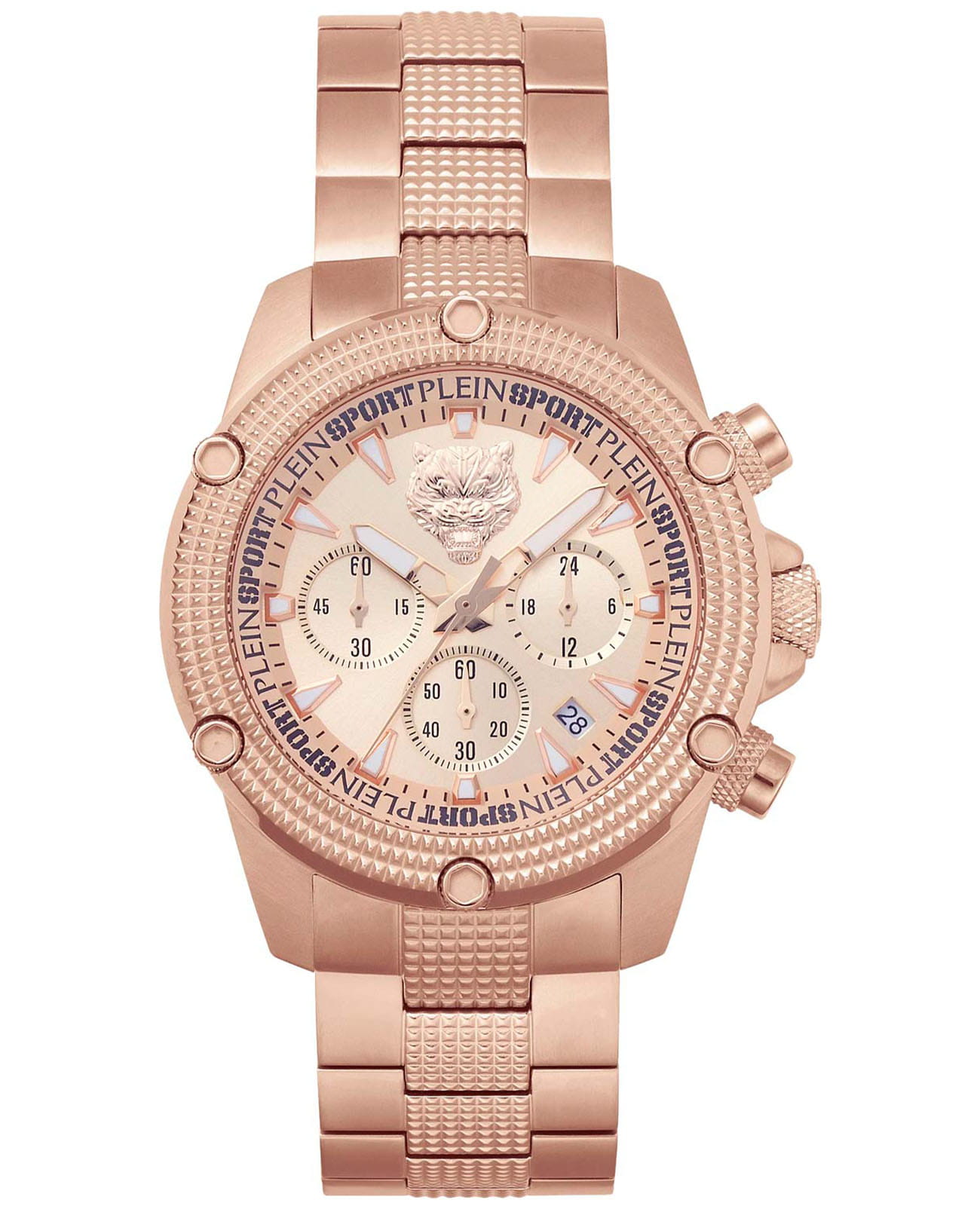 Немецкие мужские кварцевые часы-хронографХронографФункция позволяет измерять отрезки времени с особой точностью: часы, минуты, секунды. Верным признаком хронографа является наличие на циферблате 3 дополнительных окошек-счётчиков. с секундомеромСекундомерСекундоме́р — прибор, способный измерять интервалы времени с точностью до долей секунды. Plein Sport Hurricane PSDBA1123, кварцевый механизм с высокой точностью. Класс водозащиты: 50 метров, позволит защитить корпус от случайных брызг или капель дождя. Корпус выполнен из стали с IP-покрытиемIP-покрытиеМетод ионного напыления. Демонстрирует повышенную устойчивость к истиранию, окислению и химическим веществам. Под воздействием высокого давления и температуры около 1500°C молекулы металла надёжно соединяются с частицами корпуса часов.. Стальной браслет на раскладной застёжкеРаскладная застёжкаТакой тип застёжки используется только на браслетах из металла. Она никогда не раскрывается полностью, происходит разделение на 2 и более частей. Раскладывающая застёжка снизит вероятность потери часов к минимуму.. Минеральное стеклоМинеральное стеклоМинеральное стекло представляет собой искусственно выращенный минерал кварца. Такое стекло отличается особой устойчивостью к повреждениям и царапинам. Уступает по некоторым качествам сапфировому стеклу. устойчивое к мелким механическим повреждениям.БезельБезельВнешний ободок, закрепляющий стекло. В спортивных часах так называется поворотное кольцо с делениями на циферблате, выполняет роль таймера – замеряет отрезки времени на шкале. Неподвижный безель – элемент декора. Однонаправленно вращающийся безель на дайверских часах позволяет фиксировать моменты погружения и выныривания на поверхность. с IP-покрытиемIP-покрытиеМетод ионного напыления. Демонстрирует повышенную устойчивость к истиранию, окислению и химическим веществам. Под воздействием высокого давления и температуры около 1500°C молекулы металла надёжно соединяются с частицами корпуса часов.. Окошко даты находится в положении между 4 и 5 часов.
