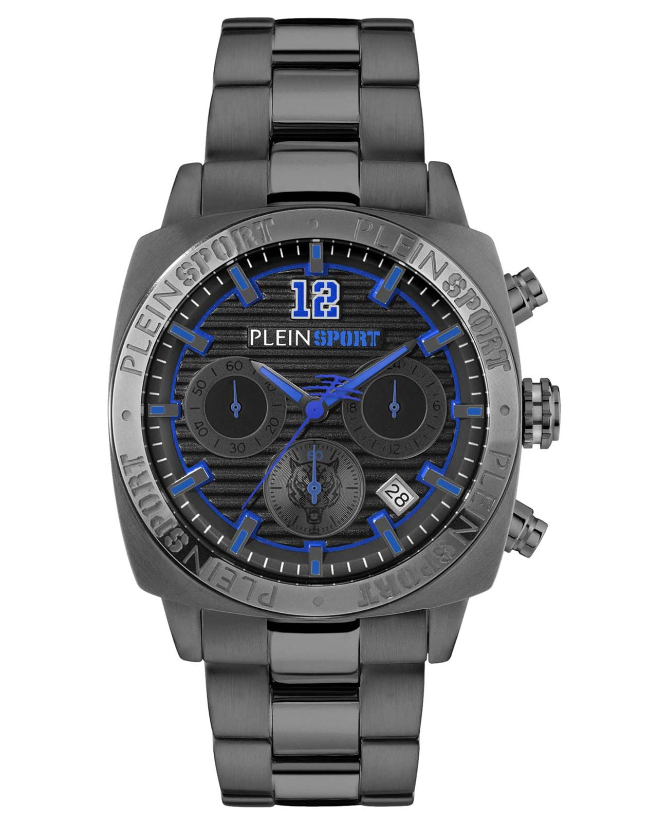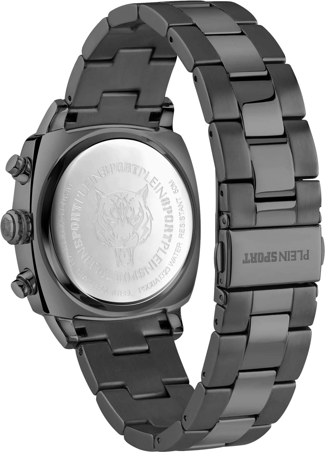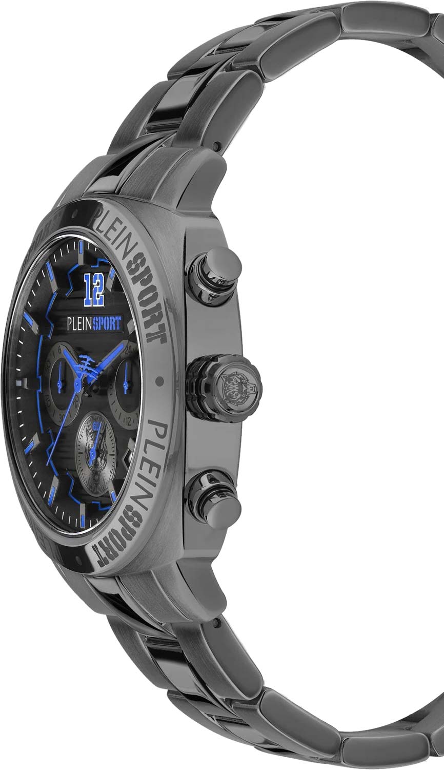 Немецкие мужские кварцевые часы-хронографХронографФункция позволяет измерять отрезки времени с особой точностью: часы, минуты, секунды. Верным признаком хронографа является наличие на циферблате 3 дополнительных окошек-счётчиков. с секундомеромСекундомерСекундоме́р — прибор, способный измерять интервалы времени с точностью до долей секунды. Plein Sport Wildcat PSGBA1323, кварцевый механизм с высокой точностью. Класс водозащиты: 50 метров, позволит защитить корпус от случайных брызг или капель дождя. Корпус часов изготовлен из стали с IP-покрытиемIP-покрытиеМетод ионного напыления. Демонстрирует повышенную устойчивость к истиранию, окислению и химическим веществам. Под воздействием высокого давления и температуры около 1500°C молекулы металла надёжно соединяются с частицами корпуса часов.. Стрелки и метки с люминесцентным покрытиемЛюминесцентное покрытиеПозволяет считывать показания времени в темноте. Производители наносят на стрелки, часовые индексы, безель или поверхность циферблата светонакопительный состав, дающий холодное свечение.. Стальной браслет на раскладной застёжкеРаскладная застёжкаТакой тип застёжки используется только на браслетах из металла. Она никогда не раскрывается полностью, происходит разделение на 2 и более частей. Раскладывающая застёжка снизит вероятность потери часов к минимуму. с IP-покрытиемIP-покрытиеМетод ионного напыления. Демонстрирует повышенную устойчивость к истиранию, окислению и химическим веществам. Под воздействием высокого давления и температуры около 1500°C молекулы металла надёжно соединяются с частицами корпуса часов.. Окошко даты находится в положении между 4 и 5 часов.