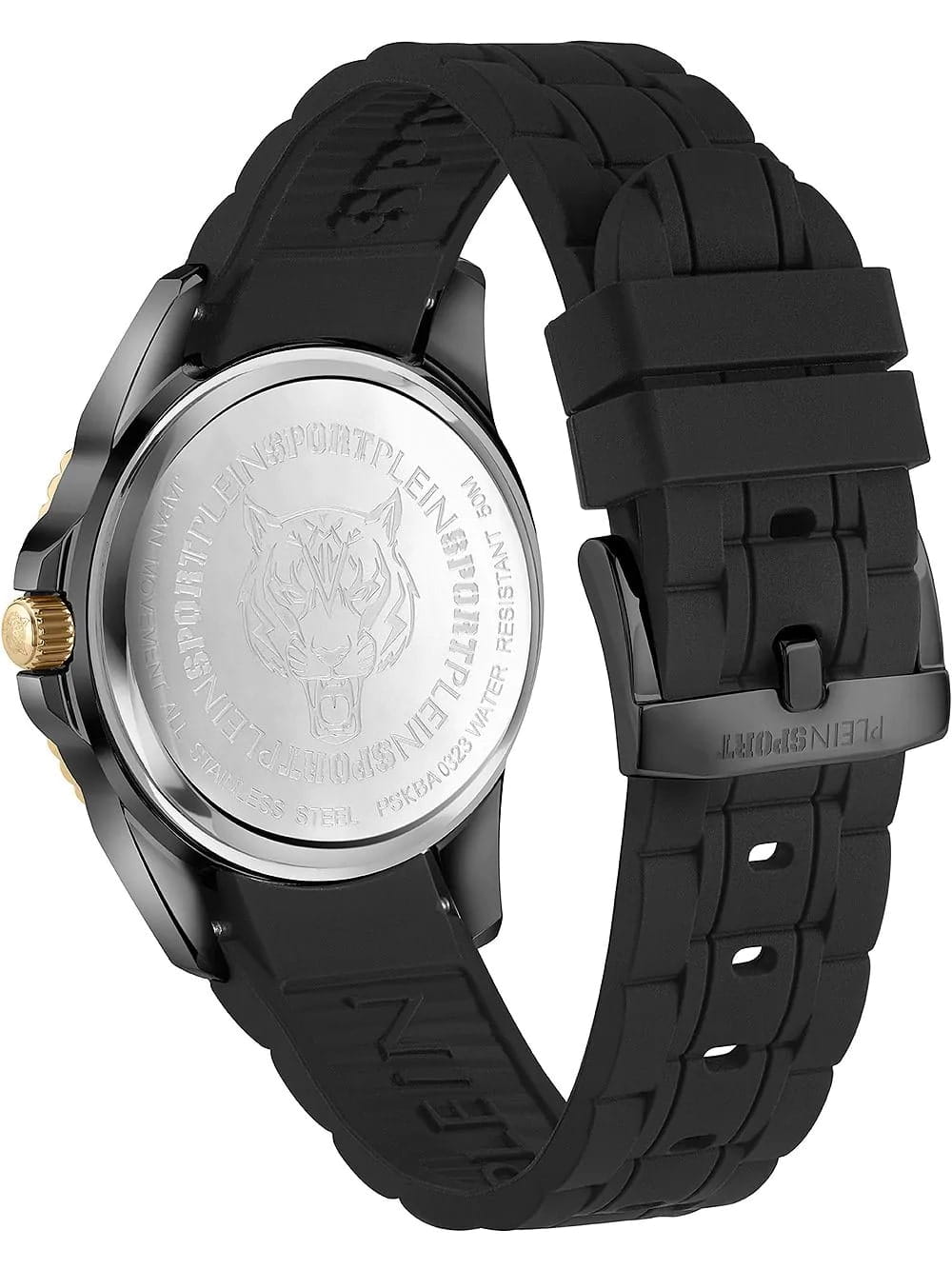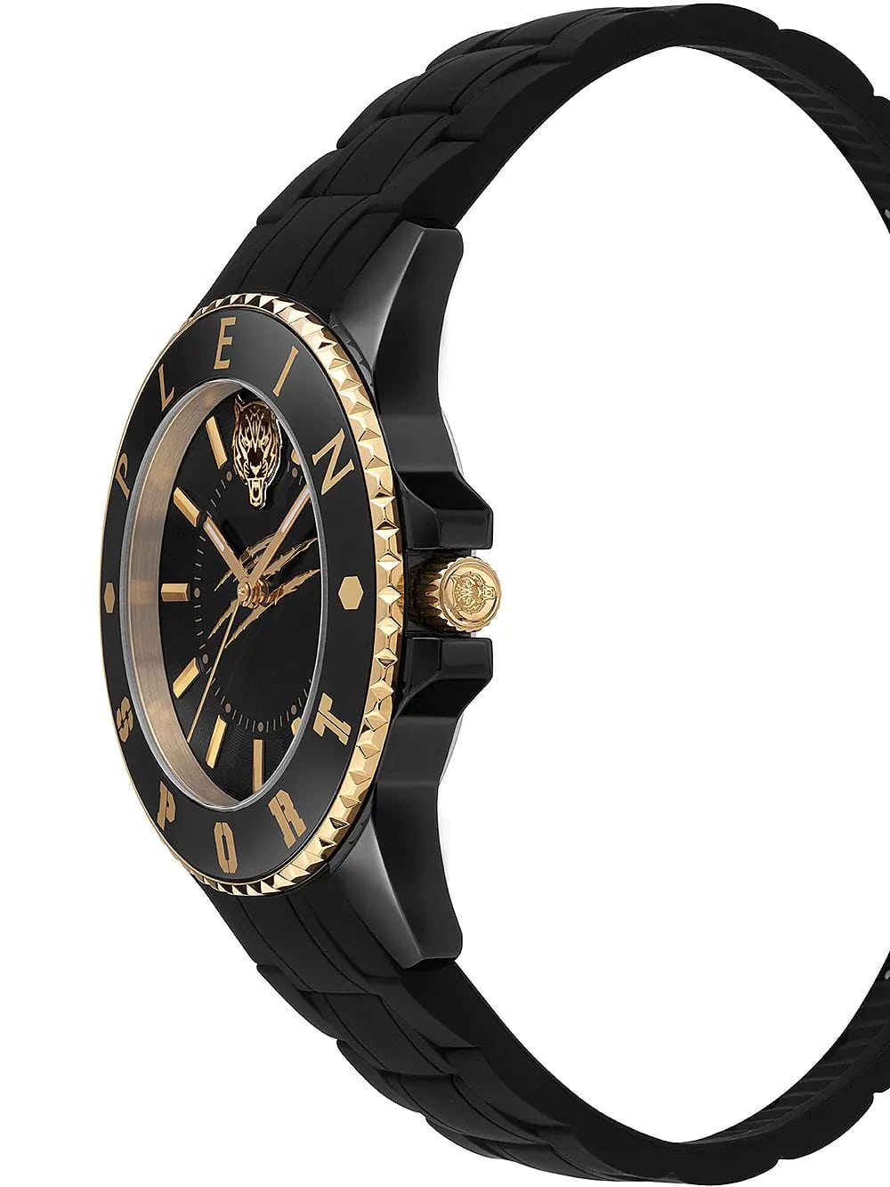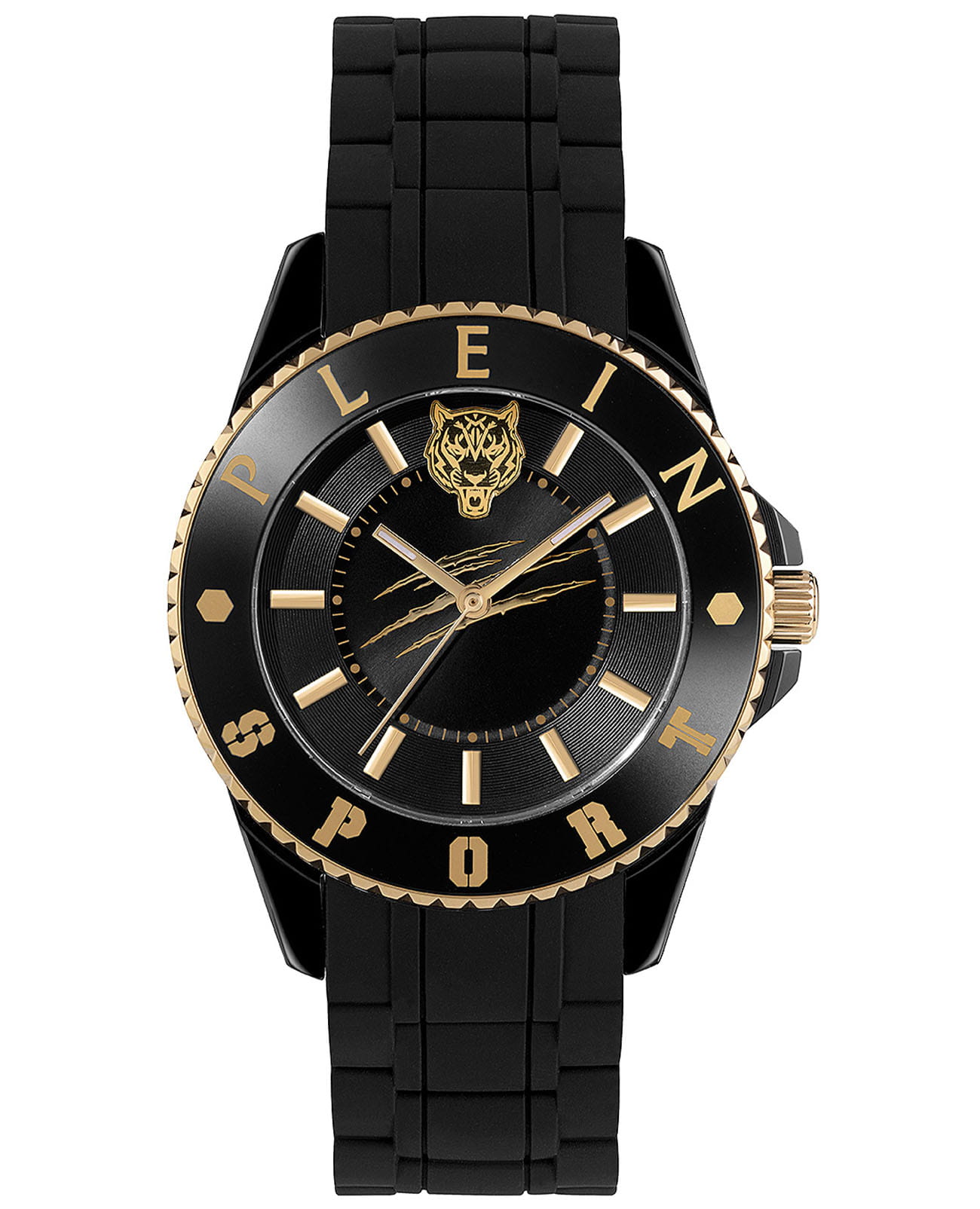 Немецкие женские кварцевые часы с минеральным стекломМинеральное стеклоМинеральное стекло представляет собой искусственно выращенный минерал кварца. Такое стекло отличается особой устойчивостью к повреждениям и царапинам. Уступает по некоторым качествам сапфировому стеклу. Plein Sport Glam PSKBA0323, кварцевый механизм с высокой точностью. Класс водозащиты: 50 метров, позволит защитить корпус от случайных брызг или капель дождя. Корпус часов изготовлен из стали  с IP-покрытиемIP-покрытиеМетод ионного напыления. Демонстрирует повышенную устойчивость к истиранию, окислению и химическим веществам. Под воздействием высокого давления и температуры около 1500°C молекулы металла надёжно соединяются с частицами корпуса часов.. Силиконовый ремешок на стандартной застёжке. БезельБезельВнешний ободок, закрепляющий стекло. В спортивных часах так называется поворотное кольцо с делениями на циферблате, выполняет роль таймера – замеряет отрезки времени на шкале. Неподвижный безель – элемент декора. Однонаправленно вращающийся безель на дайверских часах позволяет фиксировать моменты погружения и выныривания на поверхность. с IP-покрытиемIP-покрытиеМетод ионного напыления. Демонстрирует повышенную устойчивость к истиранию, окислению и химическим веществам. Под воздействием высокого давления и температуры около 1500°C молекулы металла надёжно соединяются с частицами корпуса часов.. Стрелки с люминесцентным покрытиемЛюминесцентное покрытиеПозволяет считывать показания времени в темноте. Производители наносят на стрелки, часовые индексы, безель или поверхность циферблата светонакопительный состав, дающий холодное свечение..