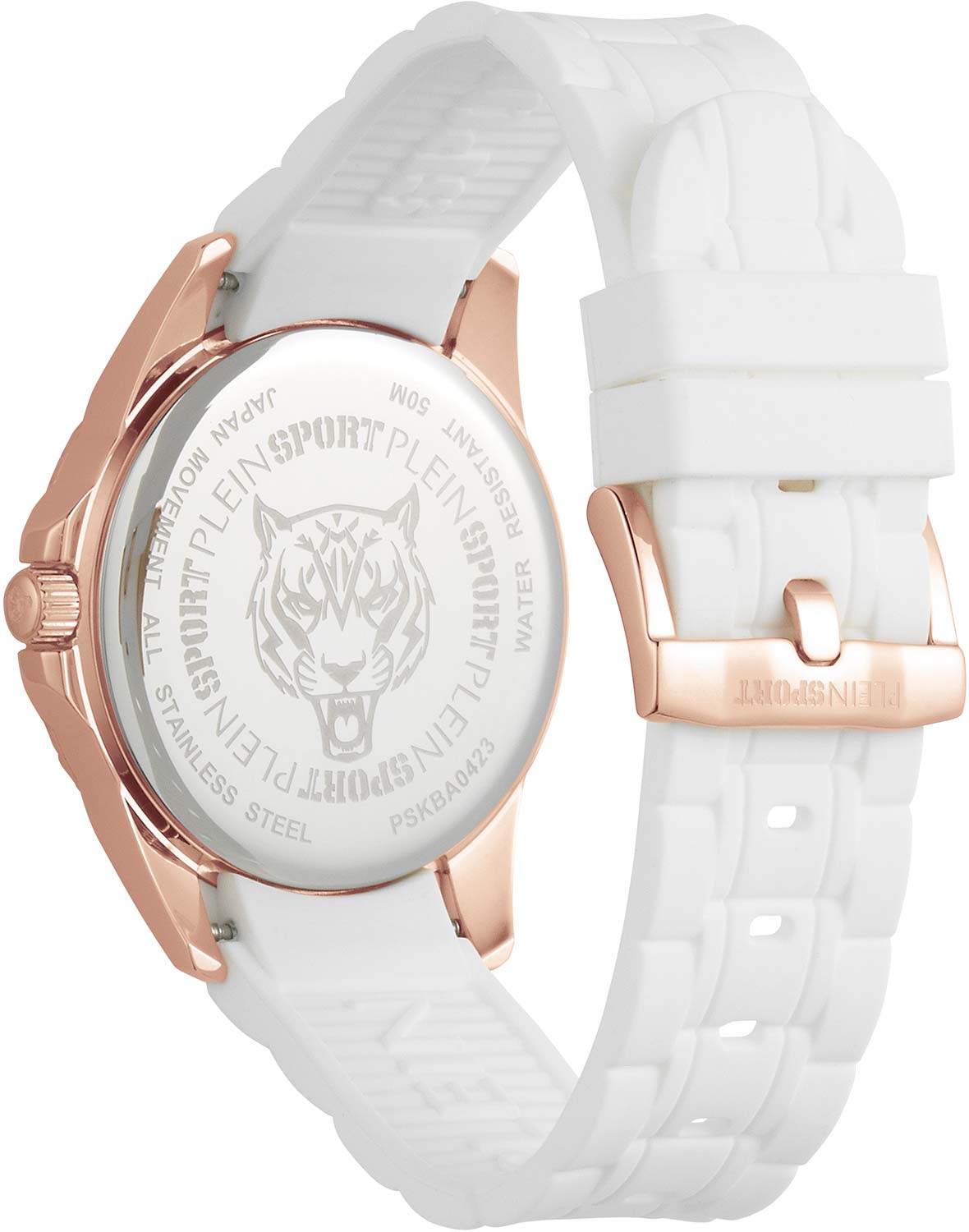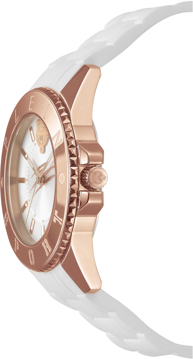 Немецкие женские кварцевые часы с минеральным стекломМинеральное стеклоМинеральное стекло представляет собой искусственно выращенный минерал кварца. Такое стекло отличается особой устойчивостью к повреждениям и царапинам. Уступает по некоторым качествам сапфировому стеклу. Plein Sport Glam PSKBA0423, кварцевый механизм с высокой точностью. Класс водозащиты: 50 метров, позволит защитить корпус от случайных брызг или капель дождя. Корпус часов изготовлен из стали  с IP-покрытиемIP-покрытиеМетод ионного напыления. Демонстрирует повышенную устойчивость к истиранию, окислению и химическим веществам. Под воздействием высокого давления и температуры около 1500°C молекулы металла надёжно соединяются с частицами корпуса часов.. Силиконовый ремешок на стандартной застёжке. Стрелки с люминесцентным покрытиемЛюминесцентное покрытиеПозволяет считывать показания времени в темноте. Производители наносят на стрелки, часовые индексы, безель или поверхность циферблата светонакопительный состав, дающий холодное свечение..