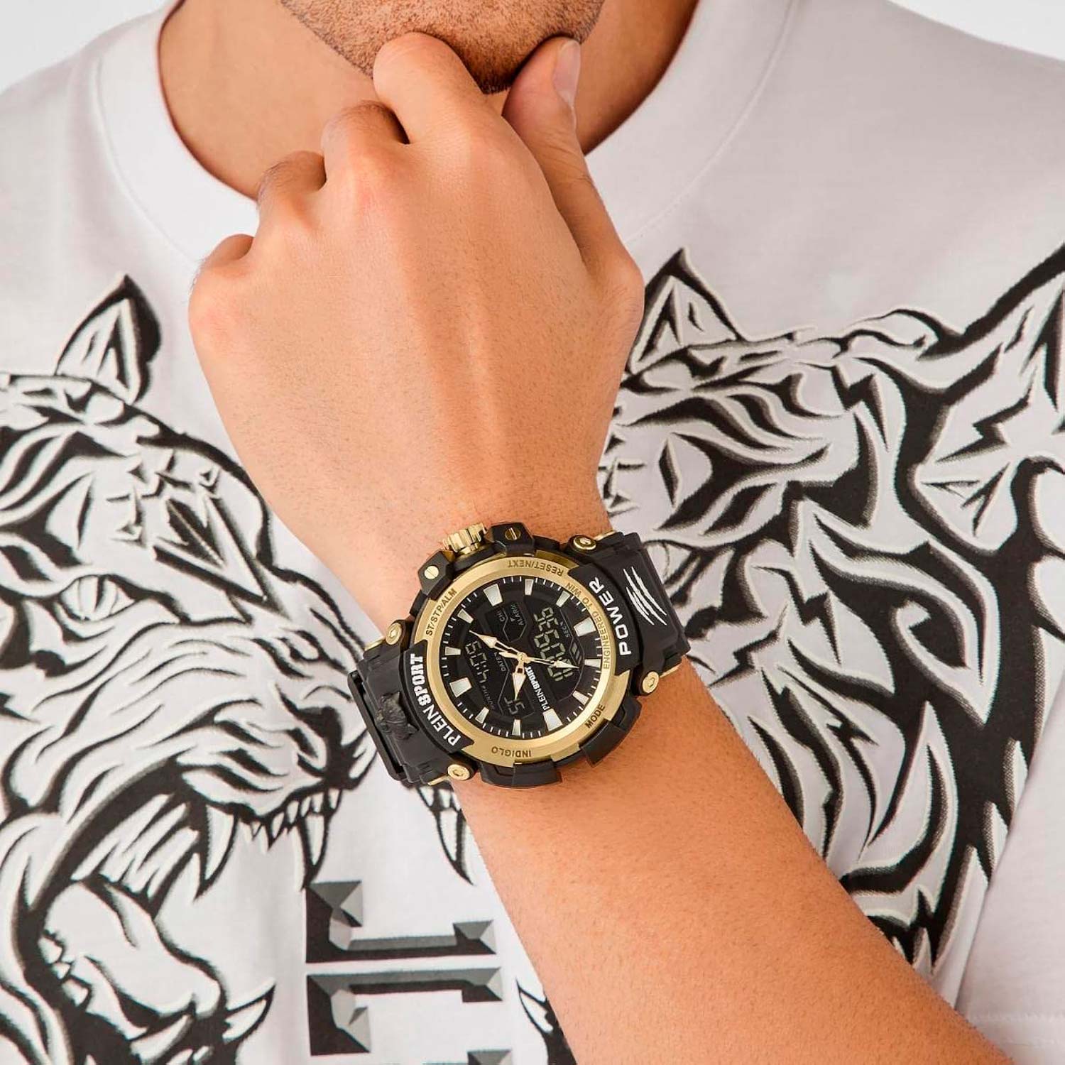 Немецкие мужские кварцевые часы-хронографХронографФункция позволяет измерять отрезки времени с особой точностью: часы, минуты, секунды. Верным признаком хронографа является наличие на циферблате 3 дополнительных окошек-счётчиков. с секундомеромСекундомерСекундоме́р — прибор, способный измерять интервалы времени с точностью до долей секунды. и будильникомБудильникБуди́льник — часы, в заданный момент времени подающие звуковой, световой и/или в редких случаях другой сигнал. Plein Sport Combat PSNBA0523, кварцевый механизм с высокой точностью. Класс водозащиты: 50 метров, позволит защитить корпус от случайных брызг или капель дождя. Корпус часов изготовлен из стали с IP-покрытиемIP-покрытиеМетод ионного напыления. Демонстрирует повышенную устойчивость к истиранию, окислению и химическим веществам. Под воздействием высокого давления и температуры около 1500°C молекулы металла надёжно соединяются с частицами корпуса часов. и пластика. Электролюминесцентная подсветкаЭлектролюминесцентная подсветкаЭлектролюминесцентная панель устанавливается под ЖК-экраном часов, при нажатии кнопки электричество преобразуется в свет за счёт подачи напряжения на атомы фосфора, такой тип подсветки позволяет освещать весь циферблат. освещает весь циферблат, после отпускания кнопки свечение продолжается еще некоторое время. Силиконовый ремешок на стандартной застёжке.